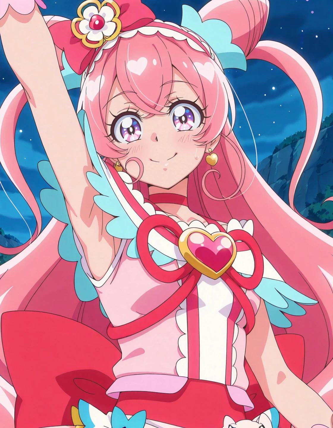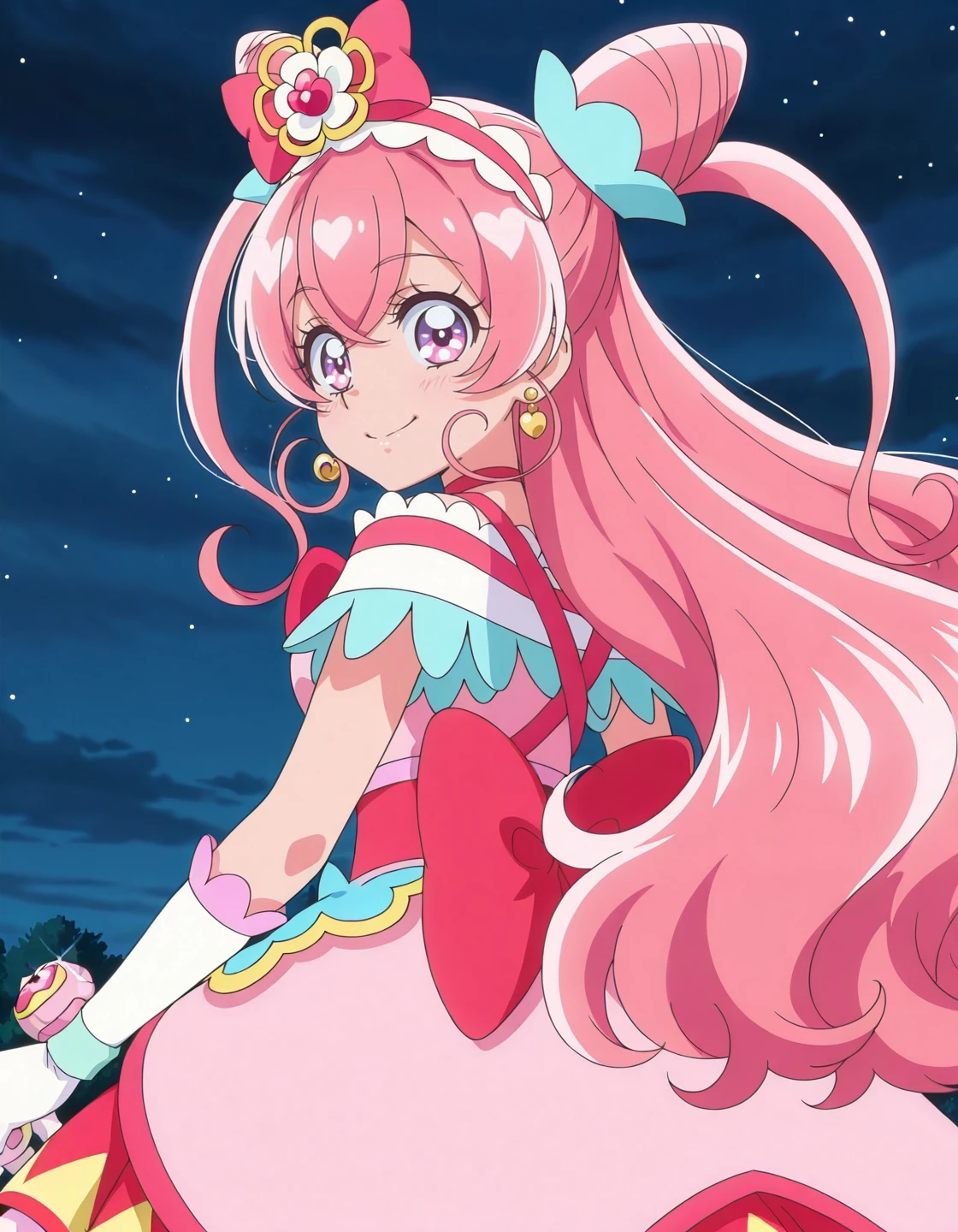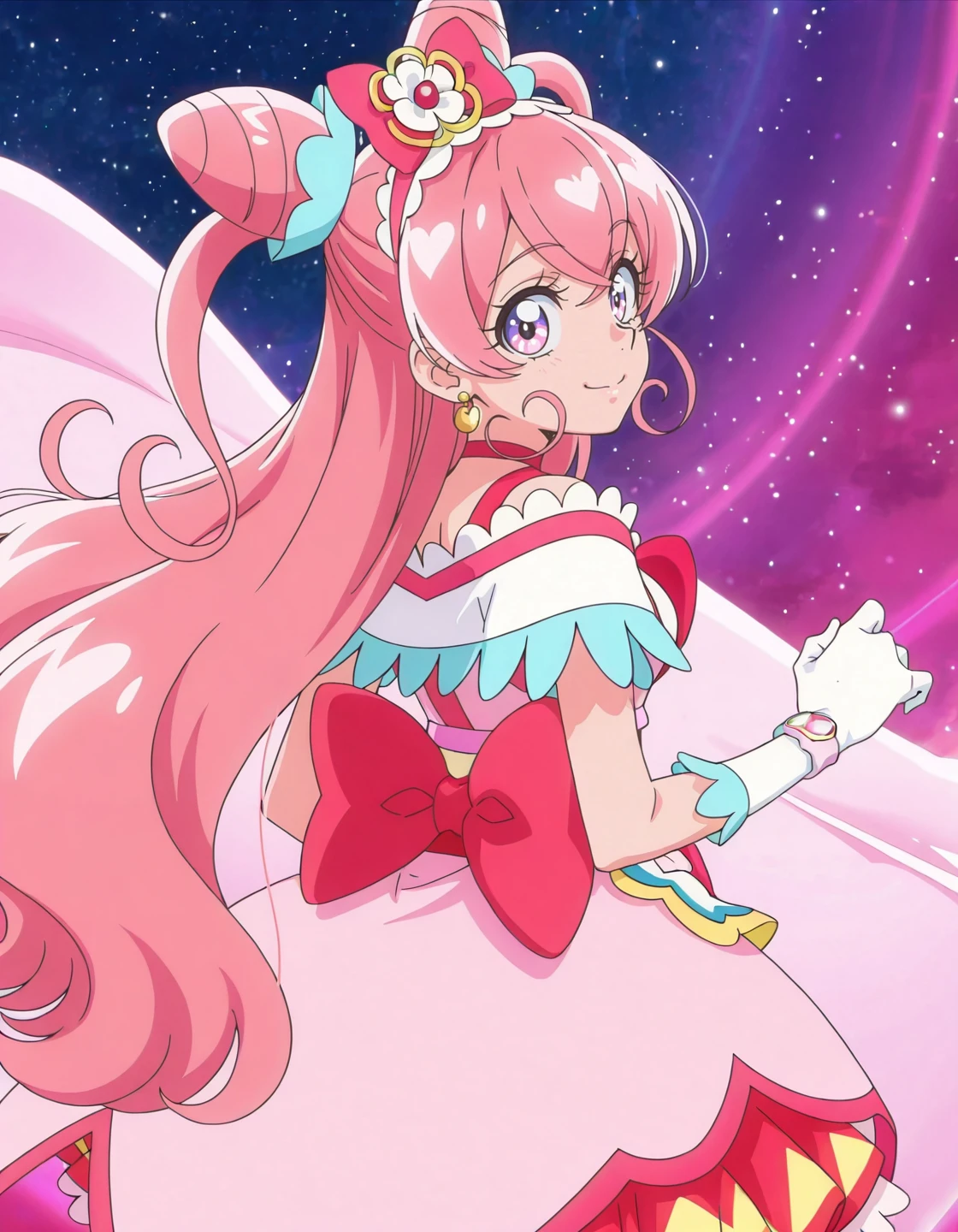 anime screencap,solo,1girl,cureprecious,preciouscostume,ribbon tie, hair ornament,dress,magical girl,<lora:cureprecious_IL:0.8>,high definition,amazing quality,best quality,very aesthetic,masterpiece,absurdres