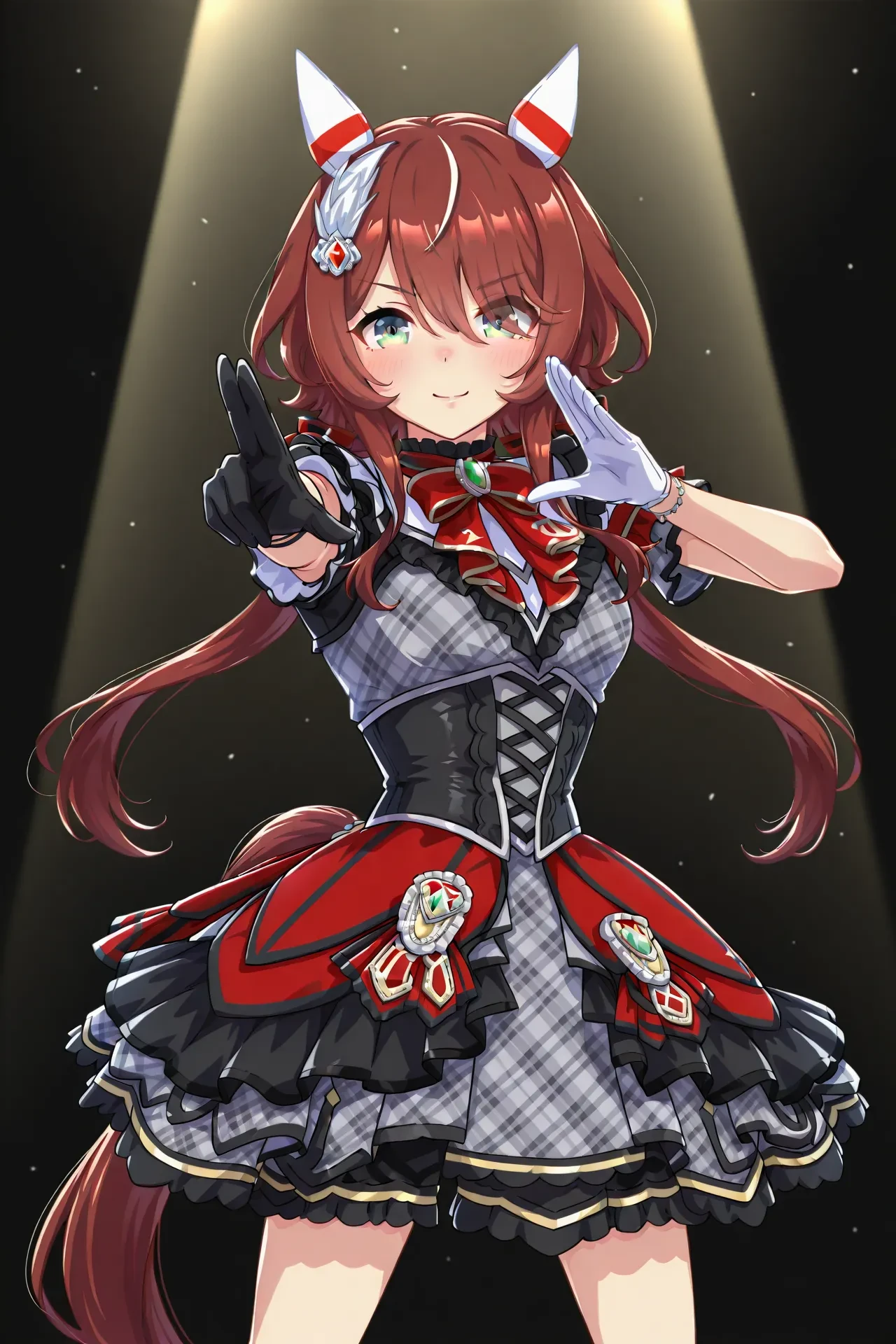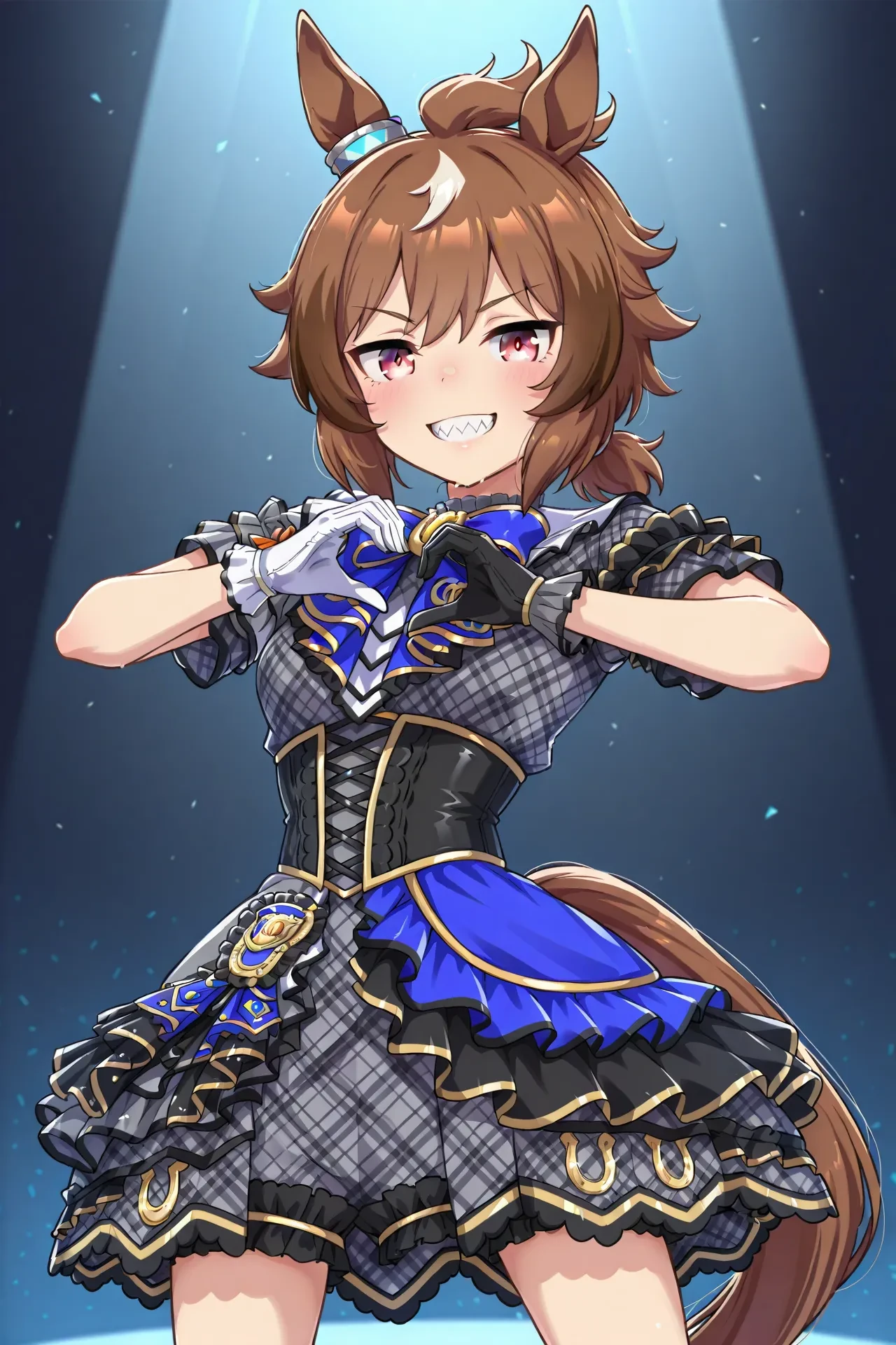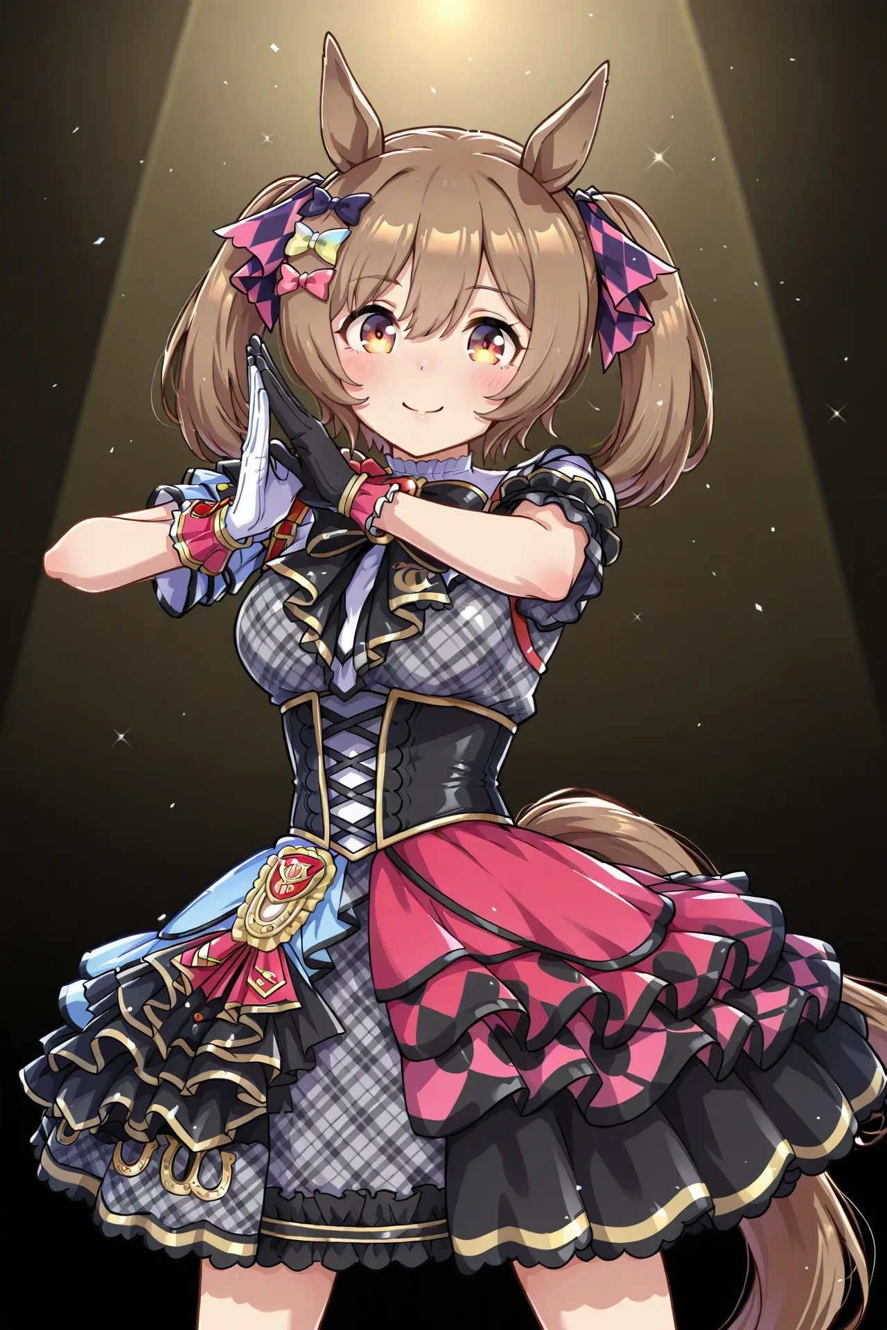 official alternate costume,dress,black dress,short sleeves,yellow bowtie,heart ornament,gingham dress,multicolored dress,corset,black corset,gloves,black gloves,white gloves,