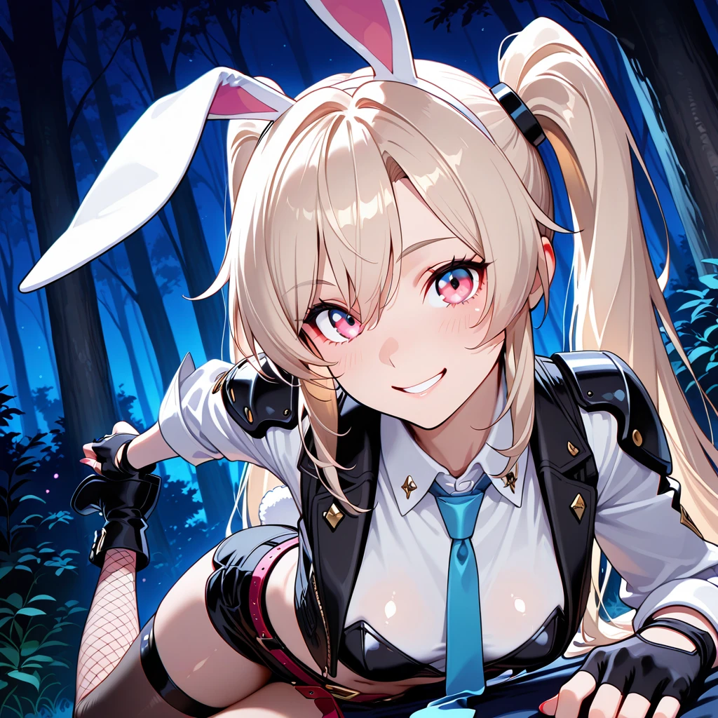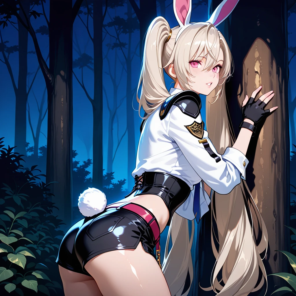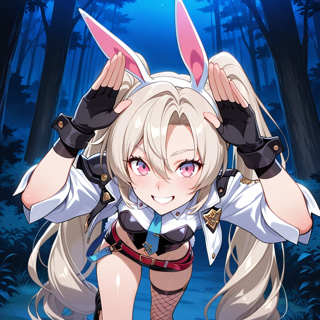 light blonde hair, long hair, twintails hairstyle, pink eyes, ears, girl, white rabbit tail, fair skin,medium small ,
