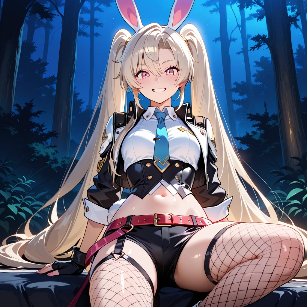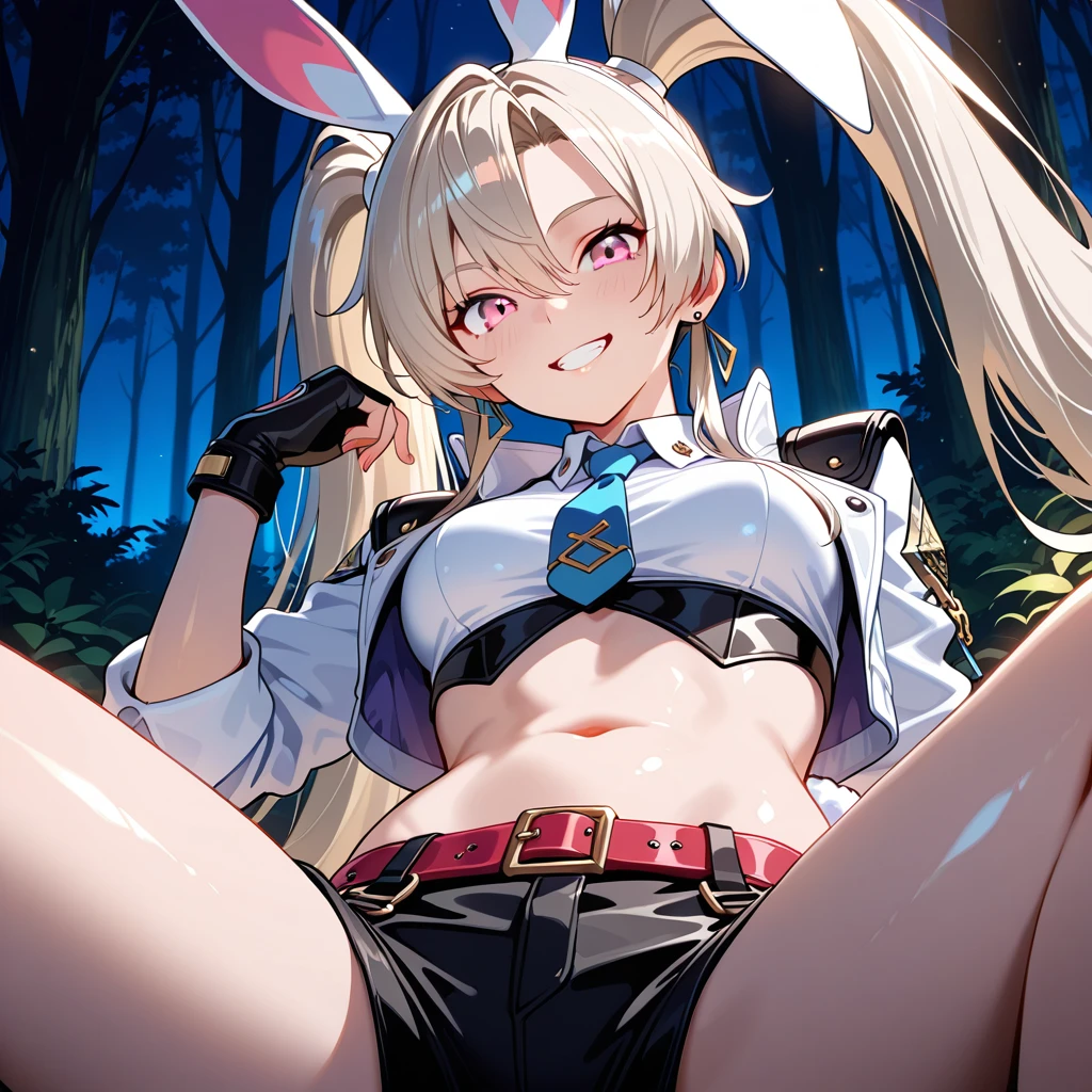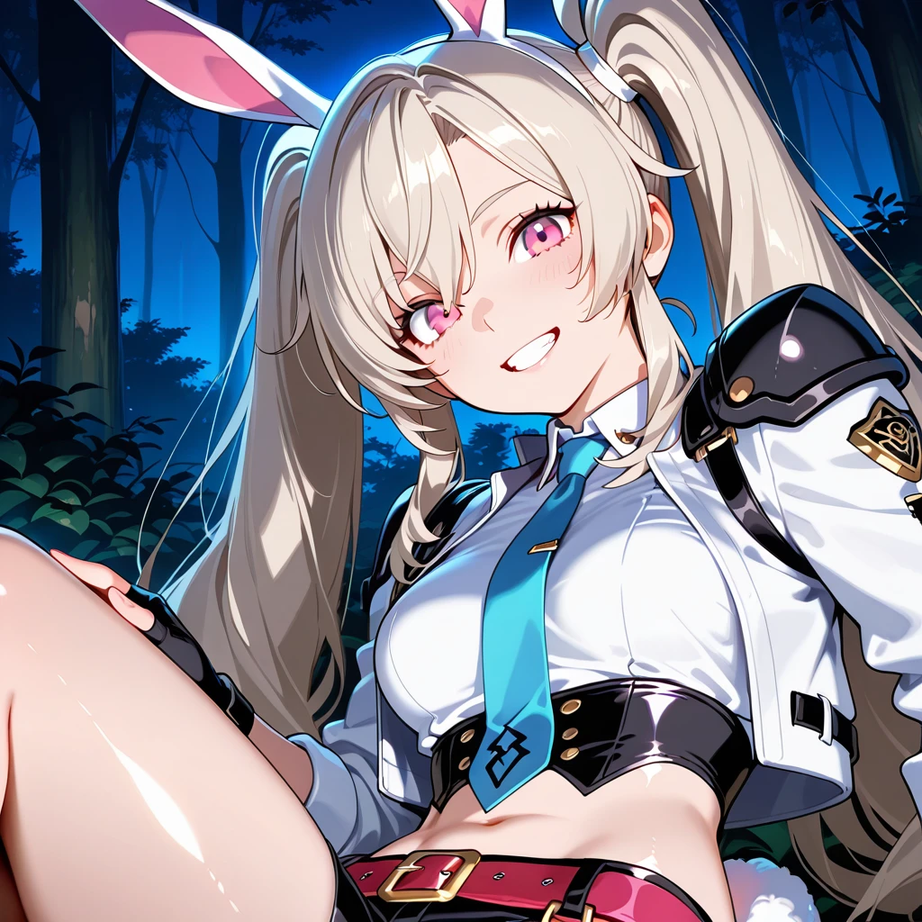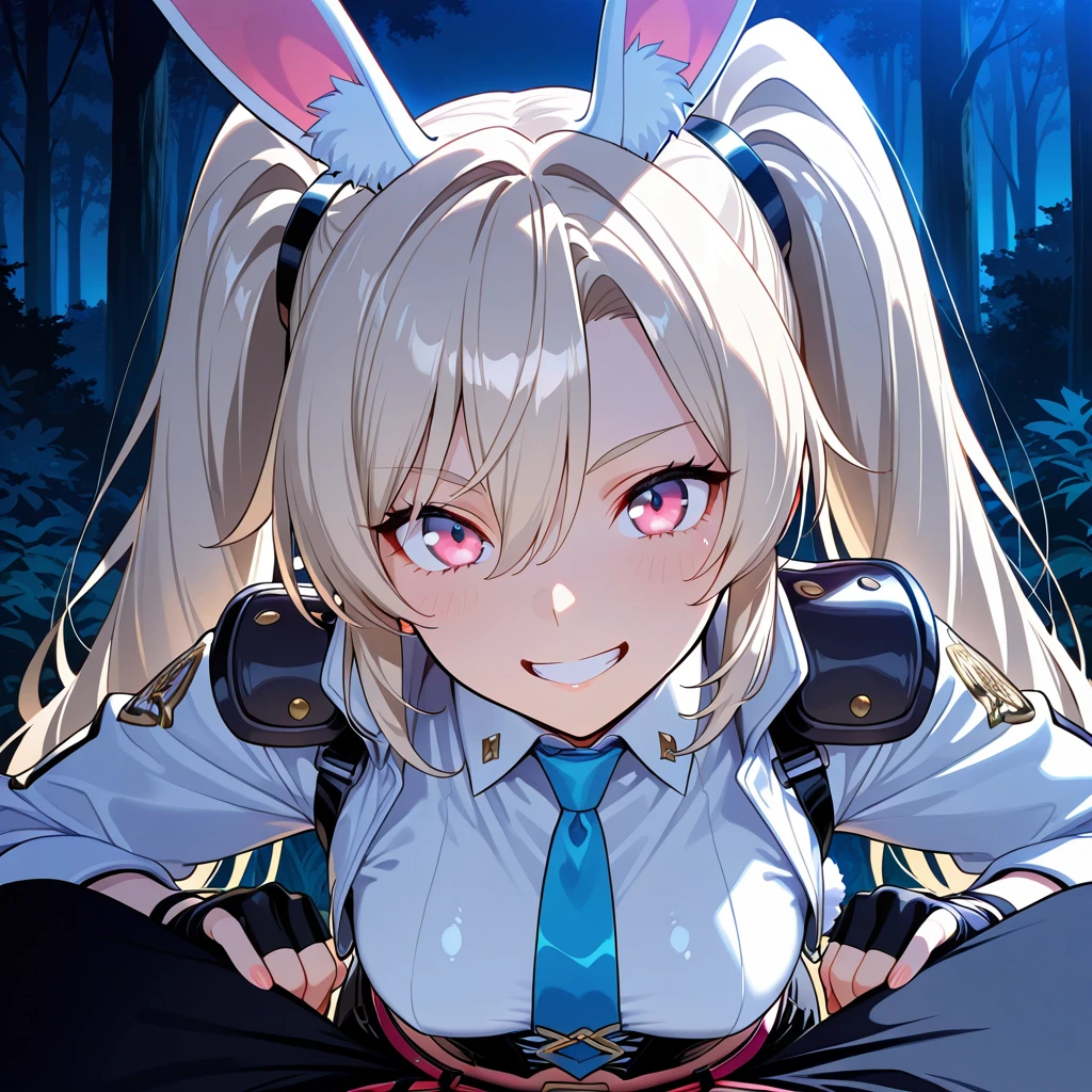 light blonde hair, long hair, twintails hairstyle, pink eyes, ears, girl, white rabbit tail, fair skin,medium small ,