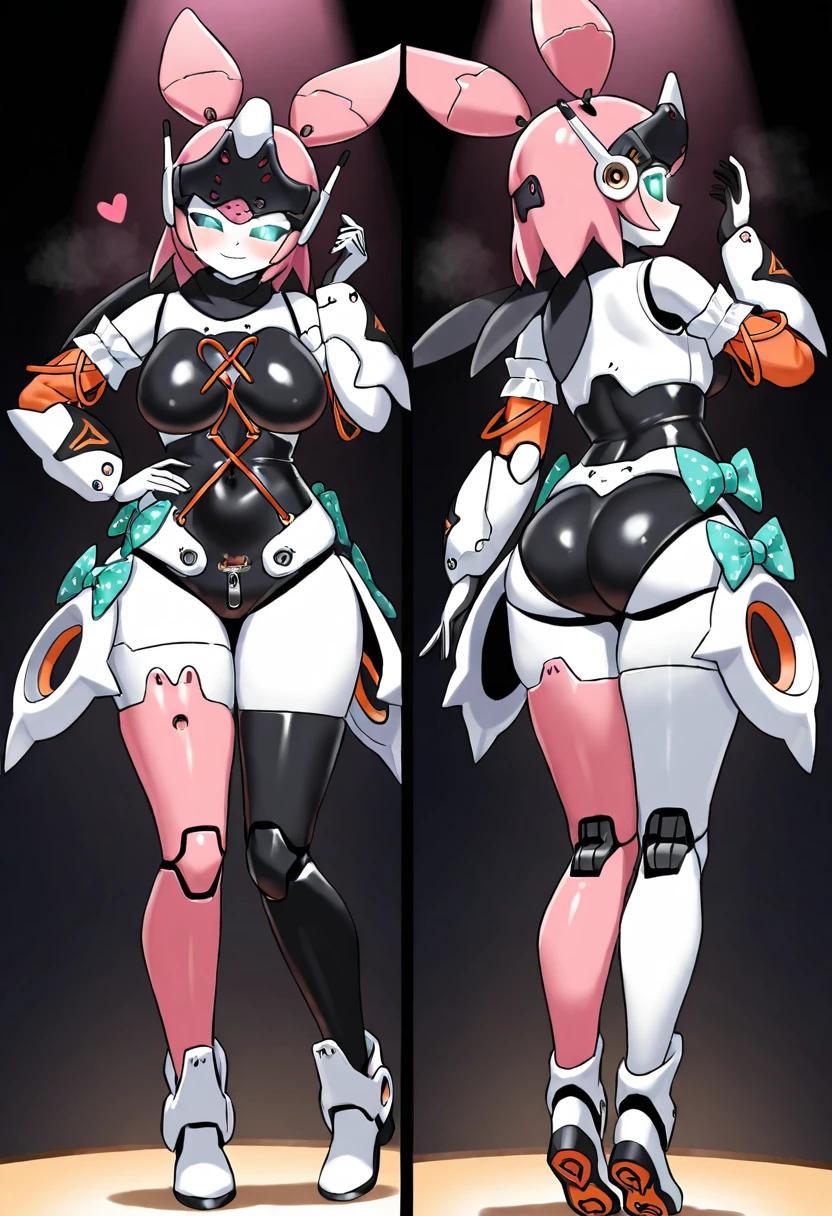 aria_zzz, humanoid android, rabbit ear antennae, helmet with ear mounts, smooth faceplate helmet, robotic face mask, segmented face armor, no exposed human face, glowing cyan eyes, pink bob hair, black underlayer, white armor limbs, pink accent panels, orange trim, teal bows on , mechanical hip skirt fins, heart emblem, heart thigh decal, split pink/white legs, orange cable tail, tail ring loop, scythe tail tip, black gloves, white boots with orange soles