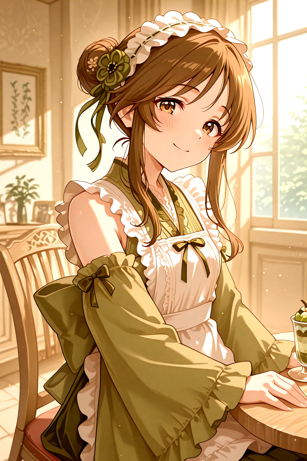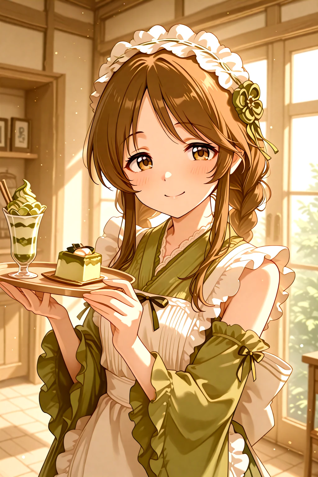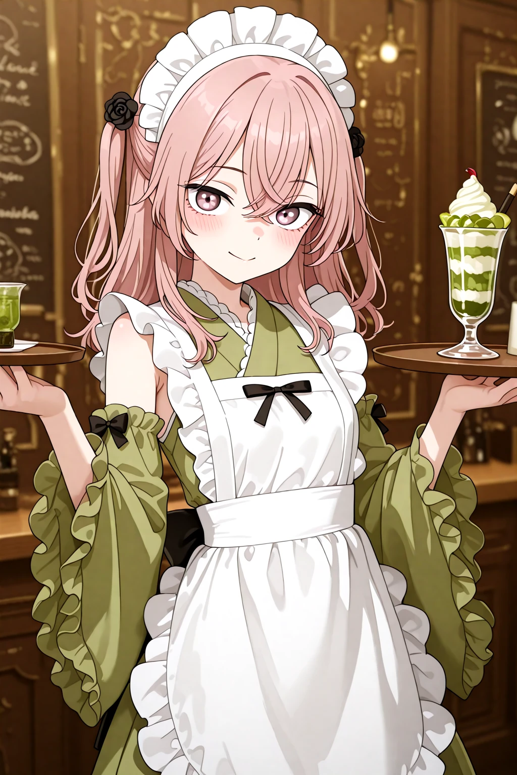MatchaCore_Miku_Matcha_Green_Tea_Parfait_Dress, frills, japanese clothes, green kimono, frilled kimono, green dress, wide sleeves, green sleeves, wa maid, maid headdress, hair ornament, maid apron, white apron, frilled apron, ((detached sleeves)), frilled sleeves, ribbon, bow, back bow, hair flowerrecommended weight: 1.0