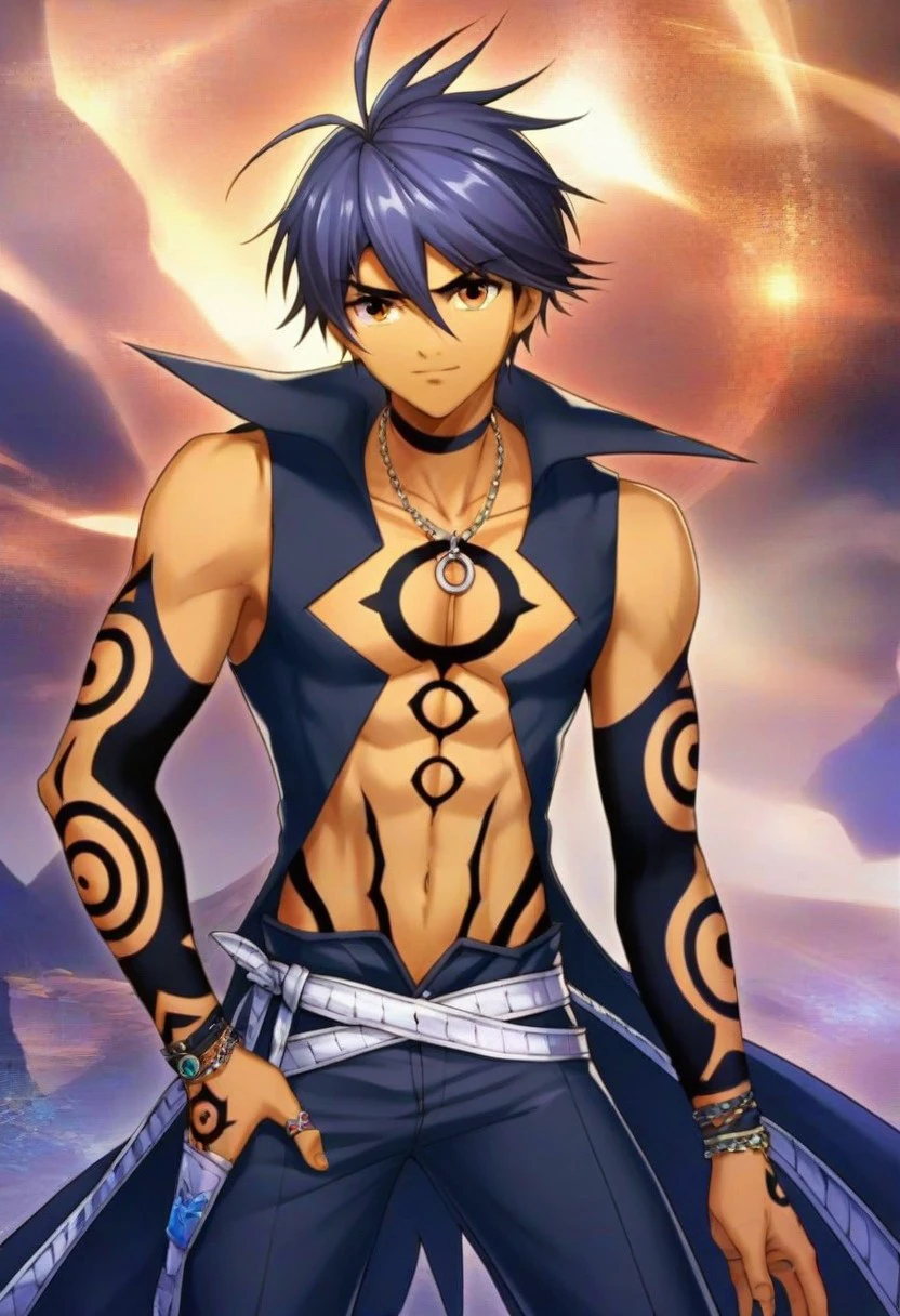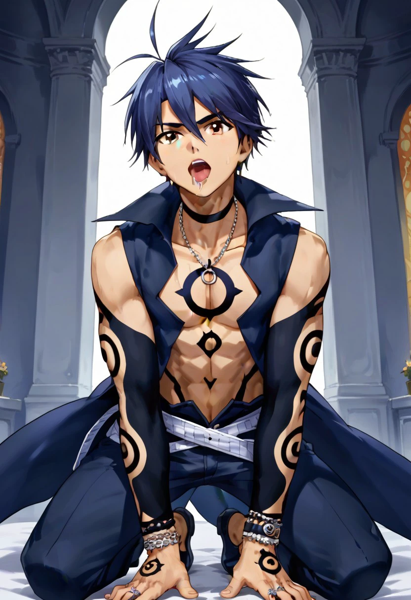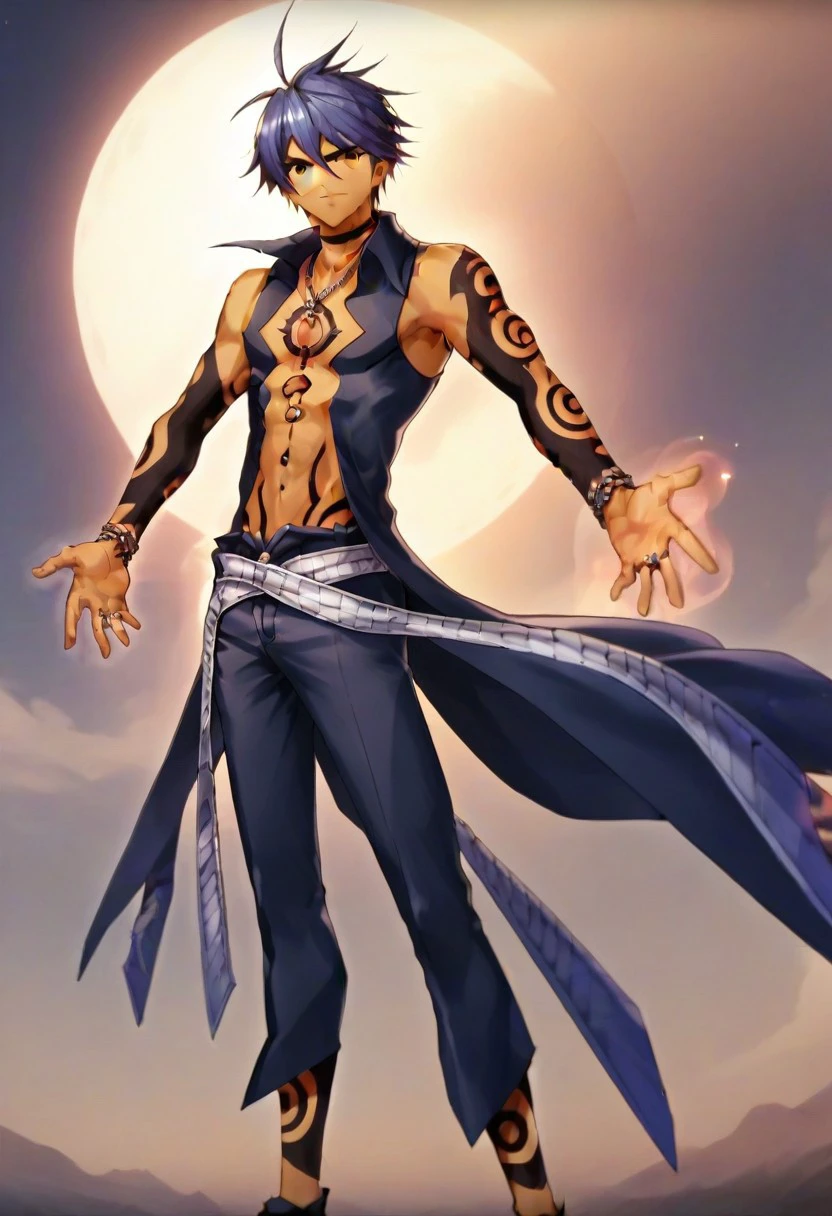 long dark blue sleeveless coat, body tattoos, choker, necklace, rings, bracelets, belt, dark blue pants, flat black shoes