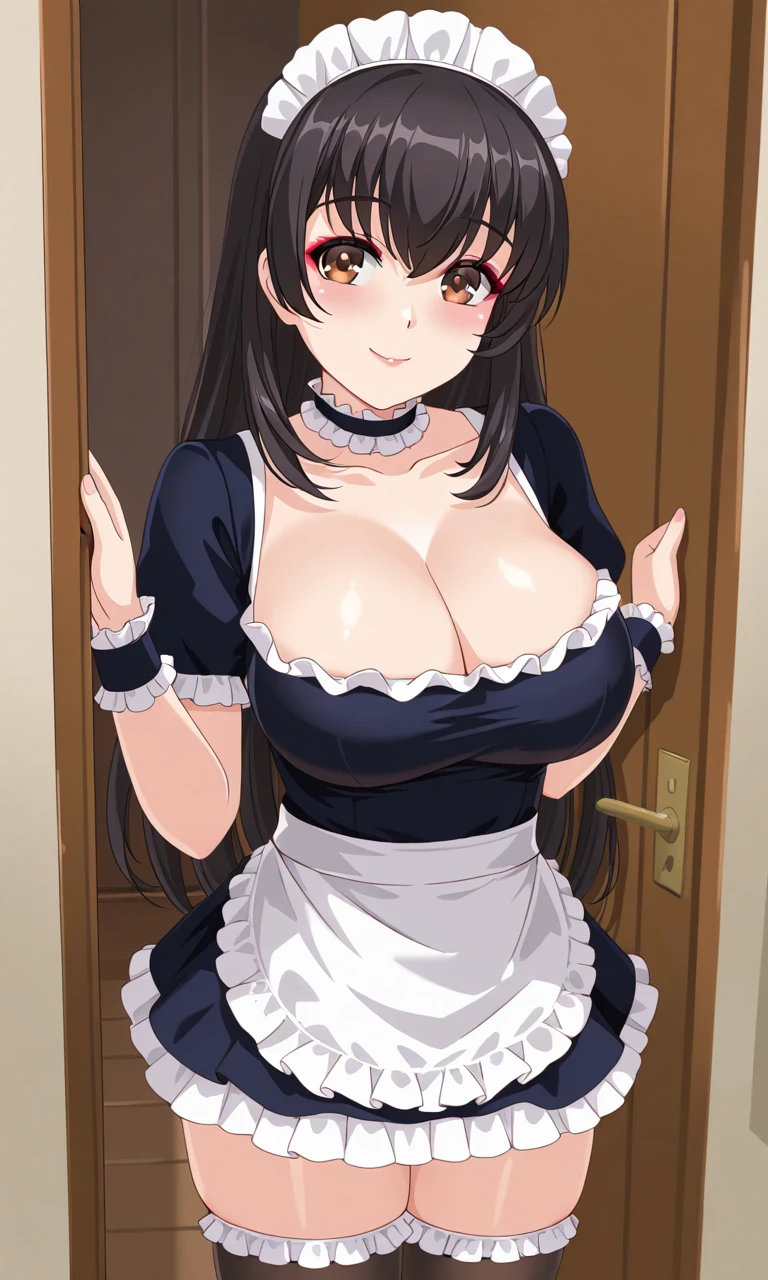 MaidClerk, long hair, black hair, bangs, hair between eyes, brown eyes, large breasts, makeup, maid headdress, black frilled dress, frilled choker, black choker, cleavage, frilled cuffs, maid apron, black frilled thighhighs,