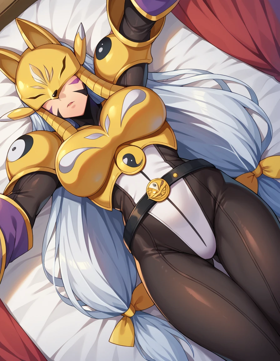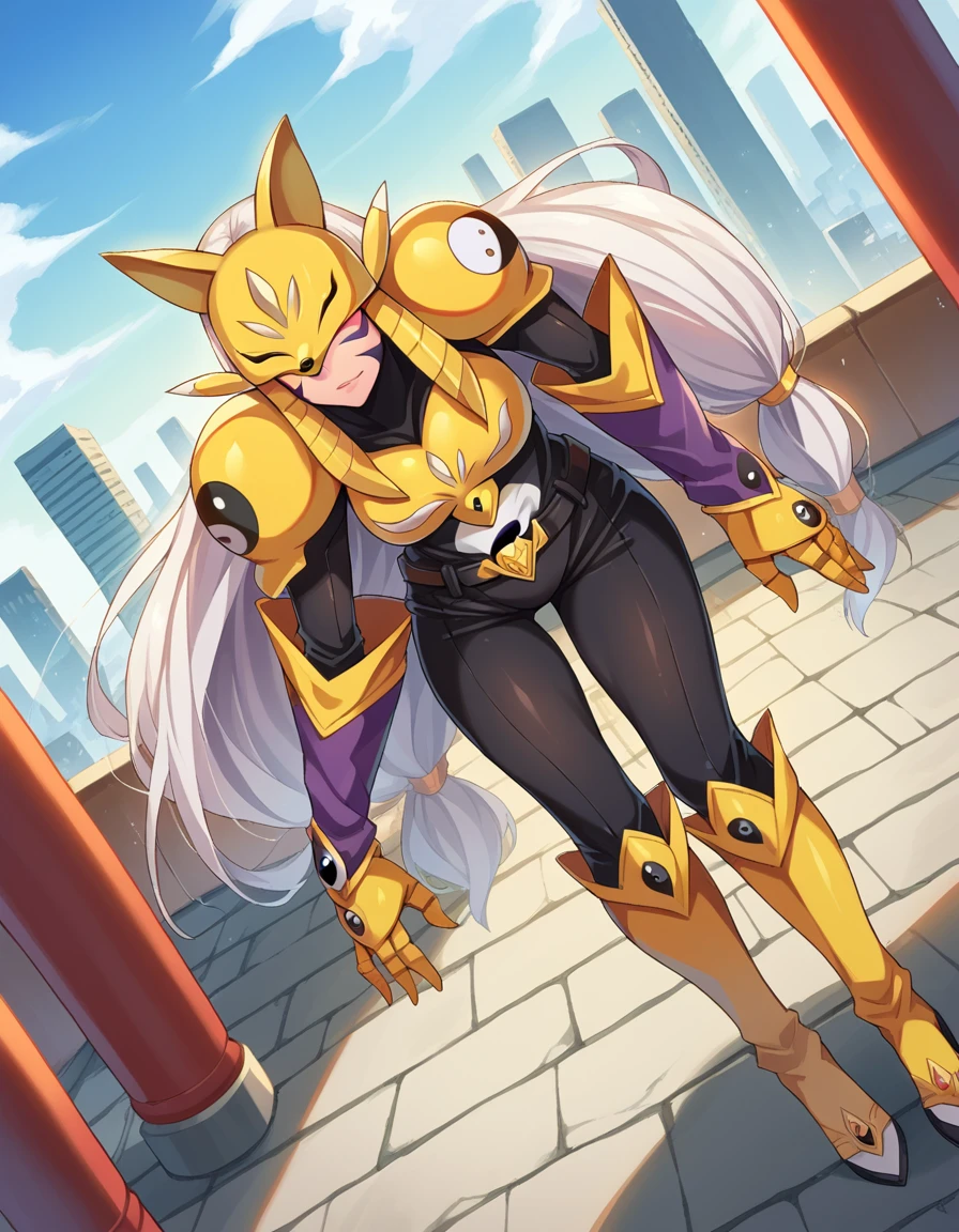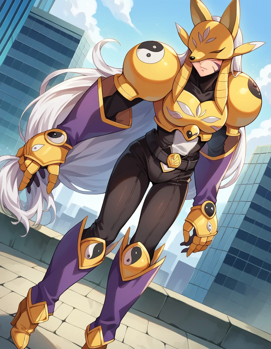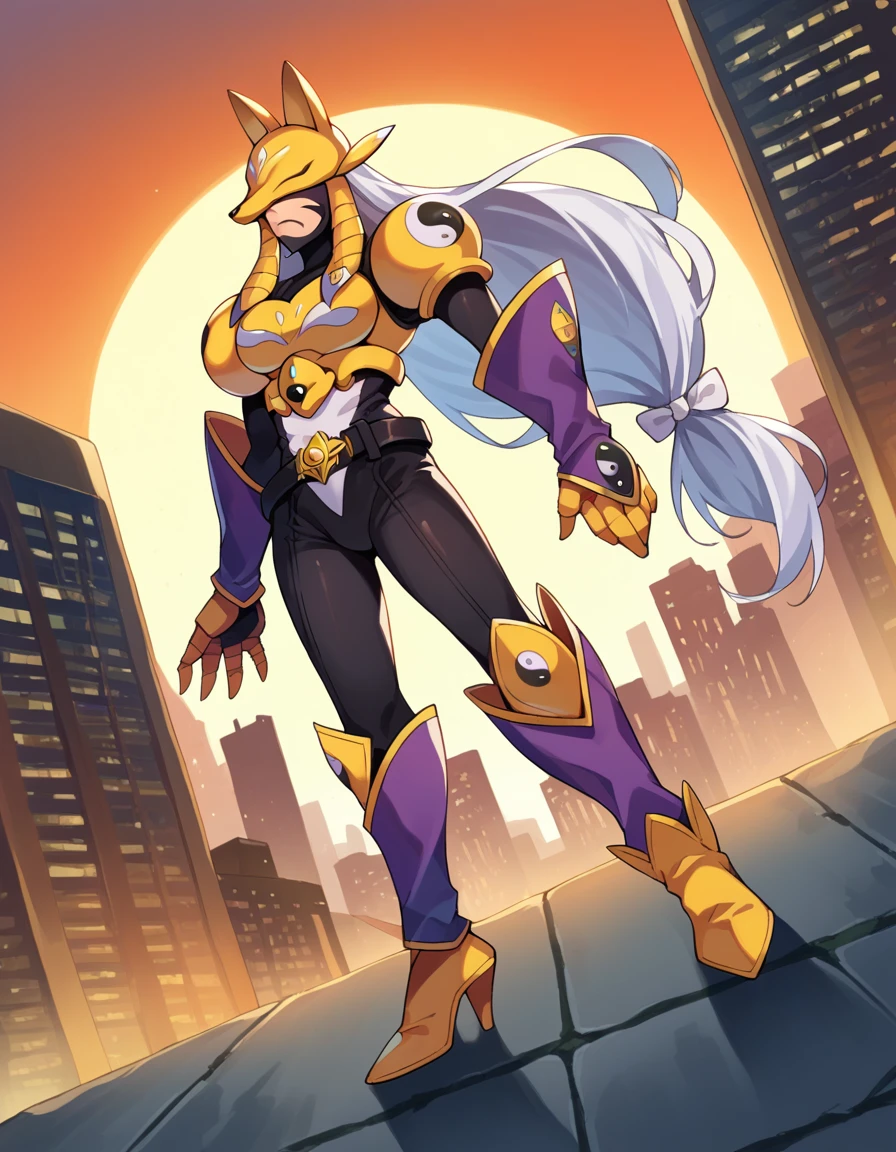 armor, belt, bodysuit, gauntlets, golden armor, high heels, yin yang,
