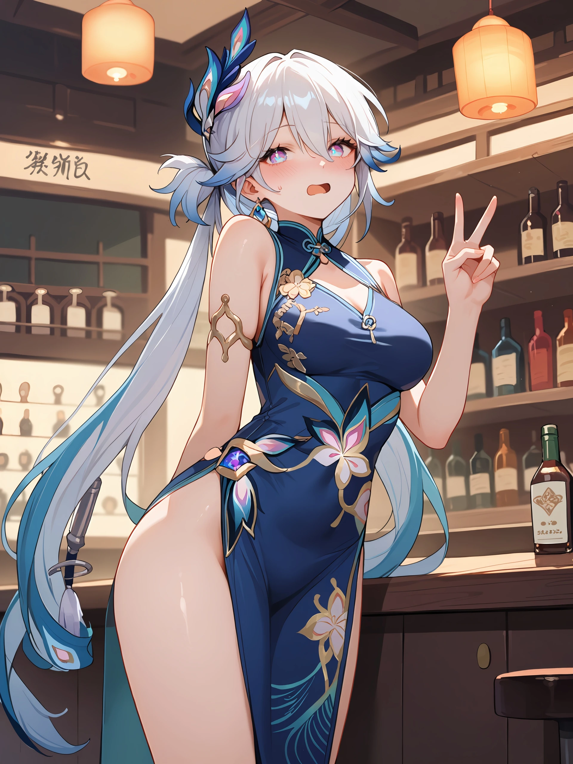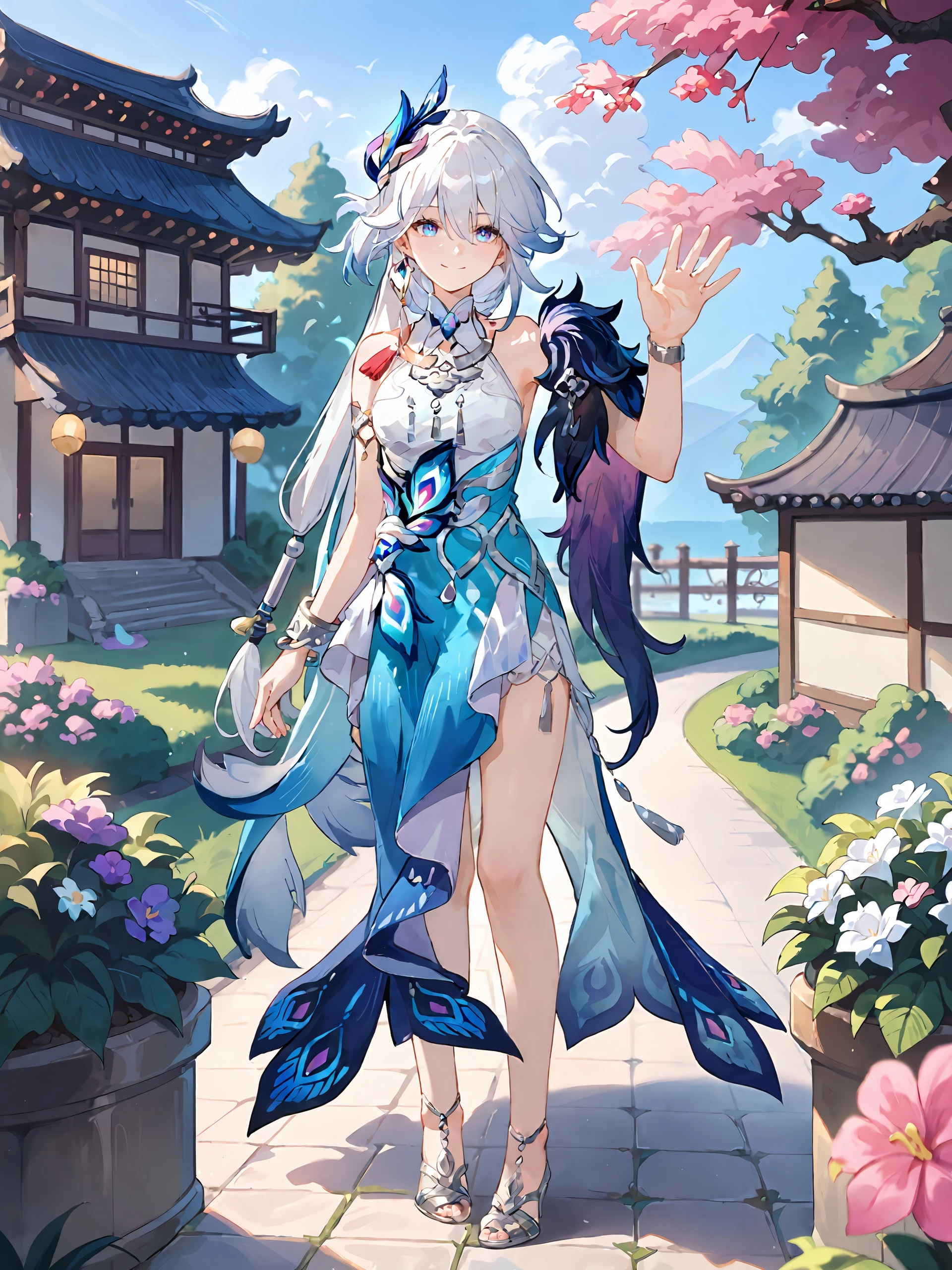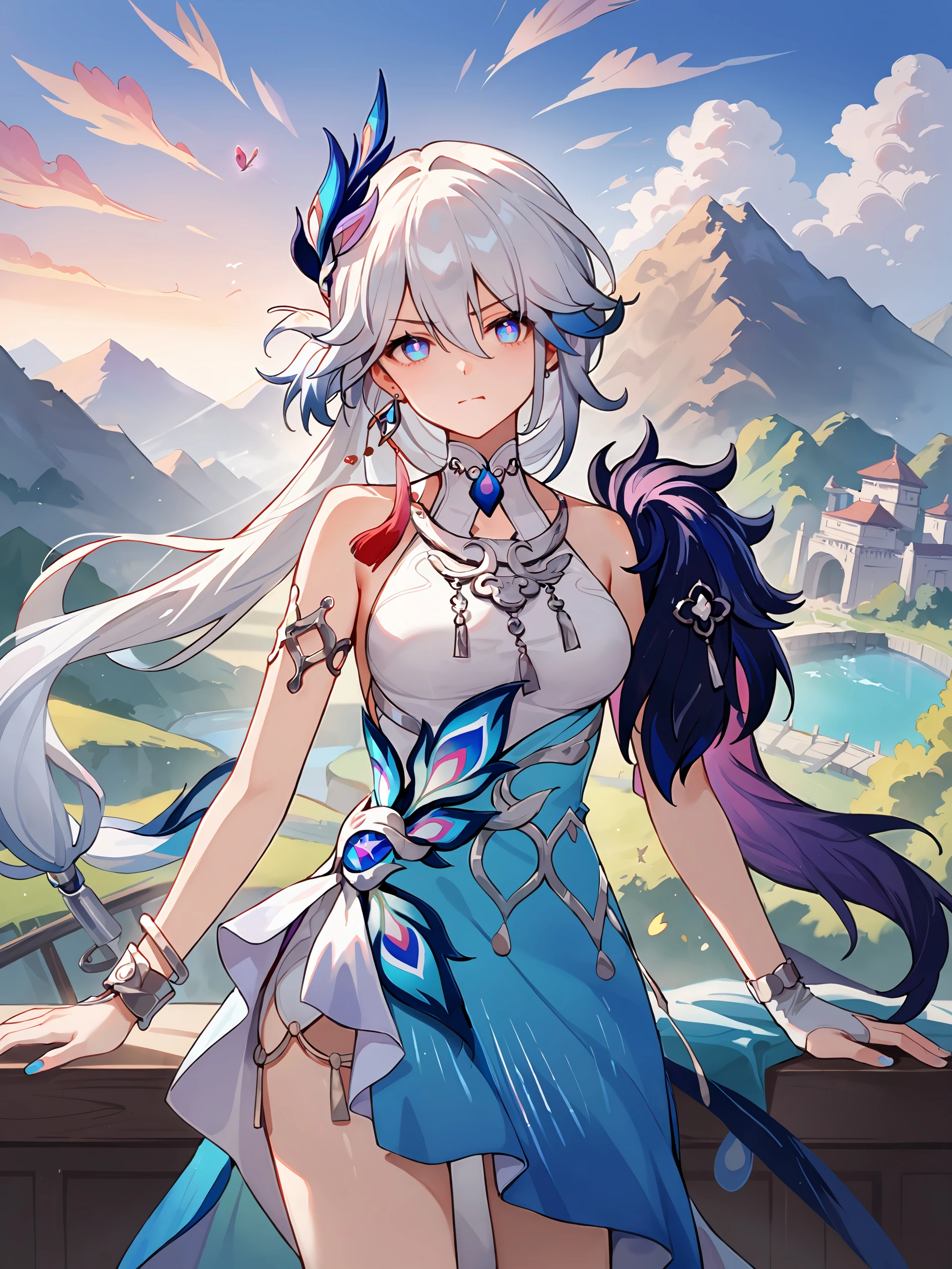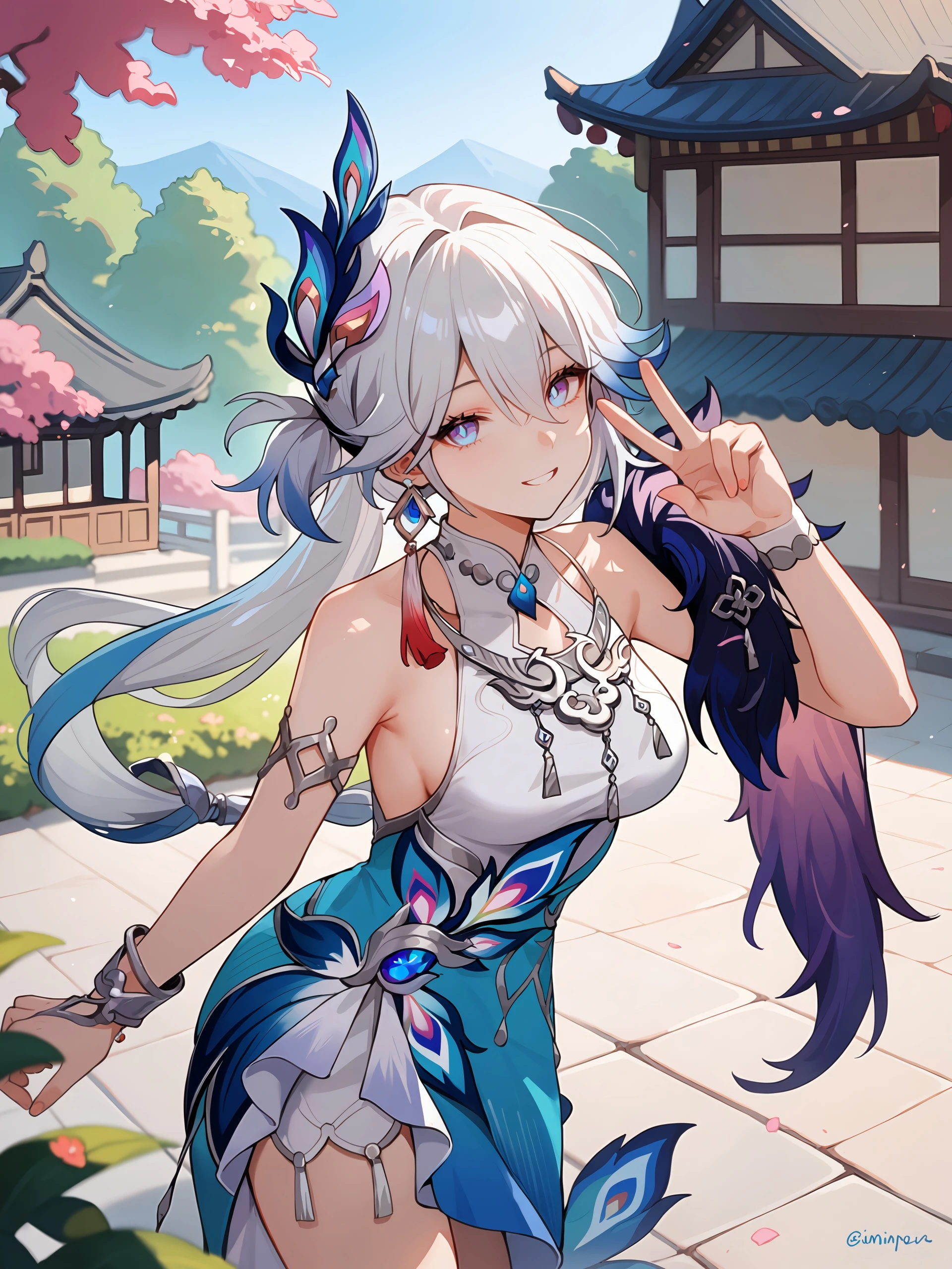 Additional prompts for default costume: low side ponytail, peacock feathers hair ornament, tassel earrings, changmingsuo, silver bracelet, silver armlet, feather boa, sleeveless two-tone dress, silver anklet, silver strappy heels