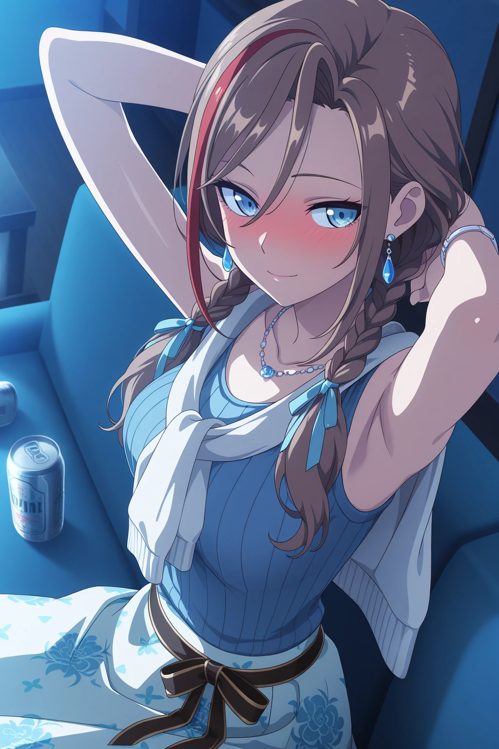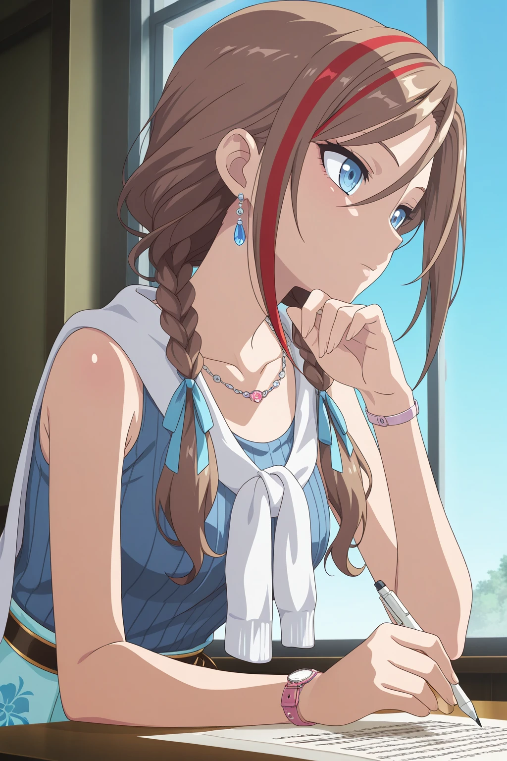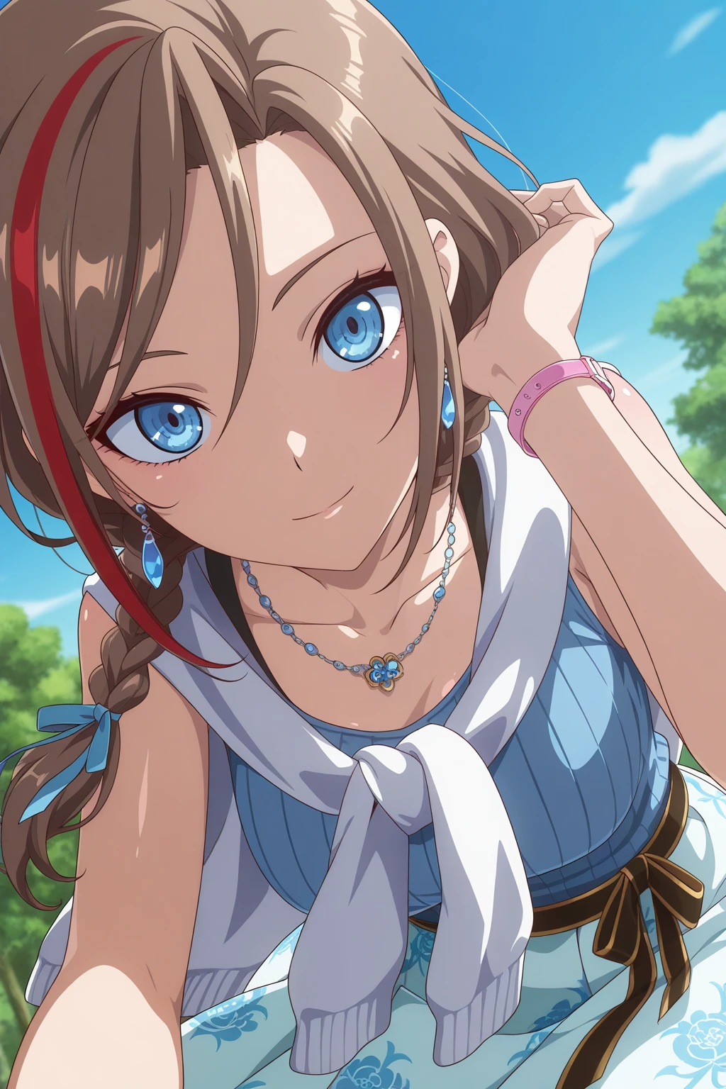 KNNJ, brown hair, streaked hair, red hair, parted bangs, low-braided long hair, hair over shoulder, blue eyes, earrings, hair ribbon, bead necklace, sweater around neck, white sweater, ribbed shirt, blue shirt, sleeveless shirt, wristwatch, pearl bracelet, sash, high-waist skirt, white skirt, print skirt, long skirt, ankle strap, pumps