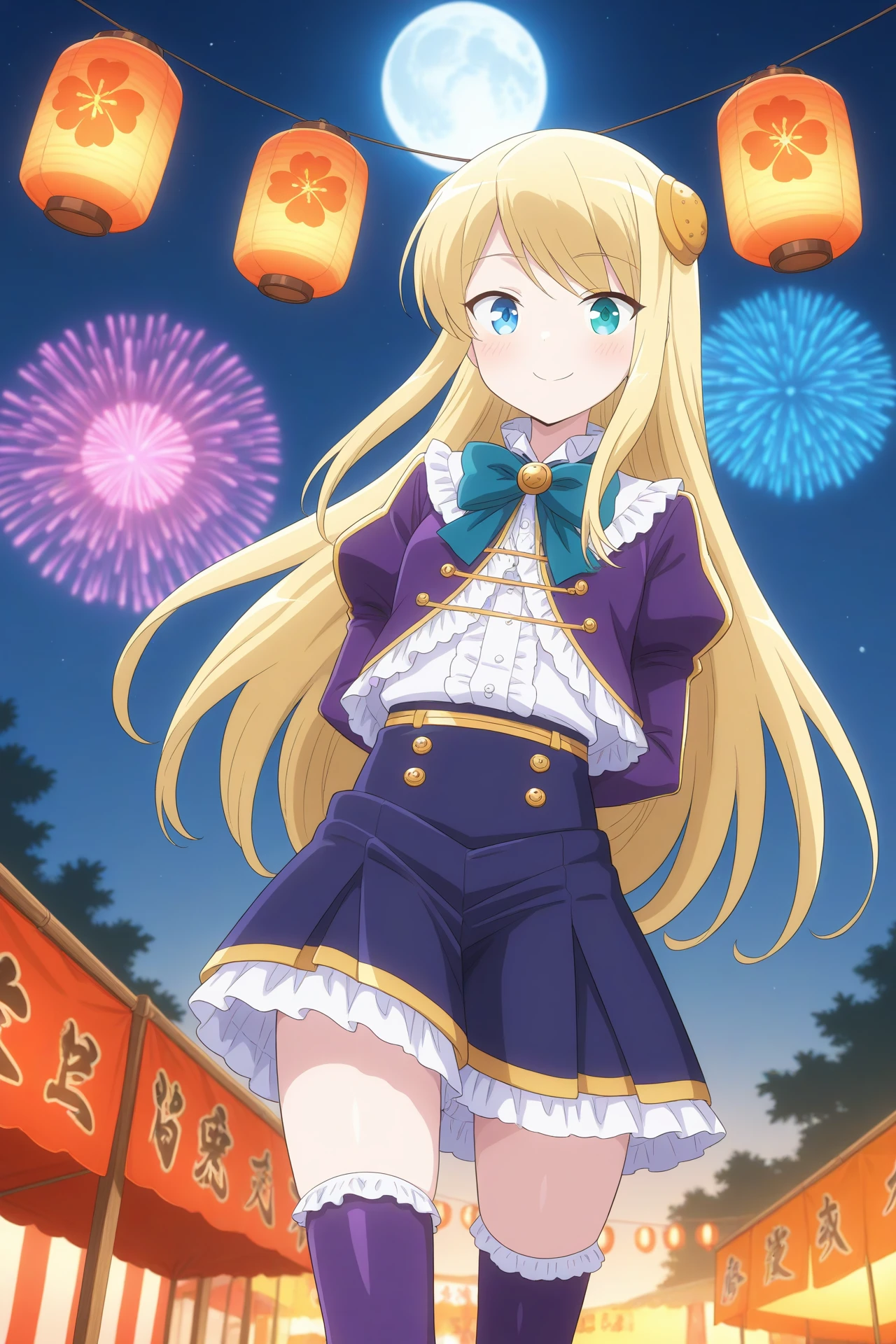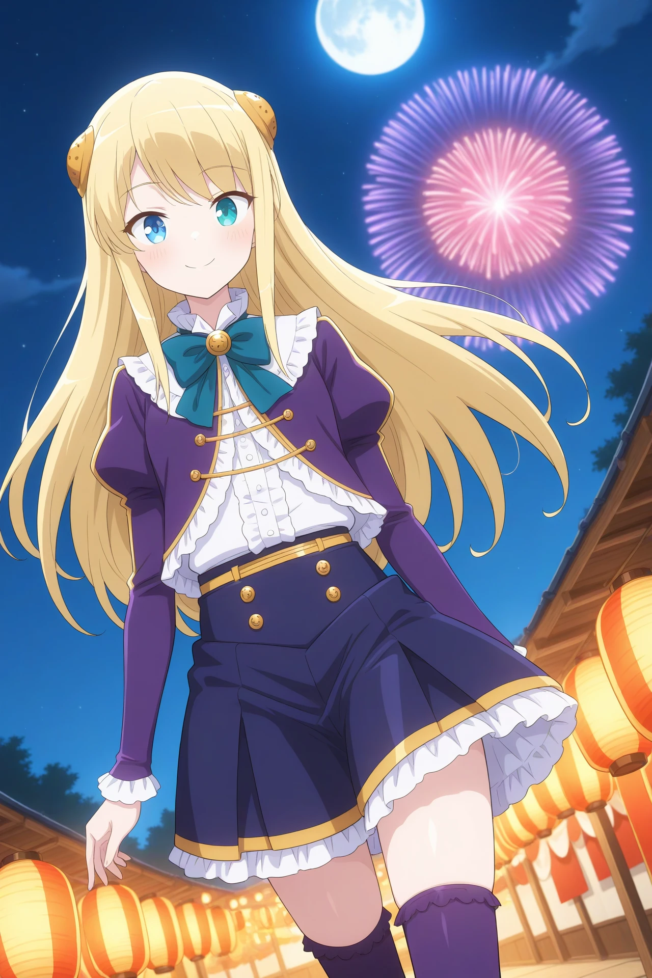 purple jacket, long sleeves, frills, bow, juliet sleeves, puffy sleeves, white shirt, blue skirt, over-kneehighs, purple thighhighs, white footwearDescription