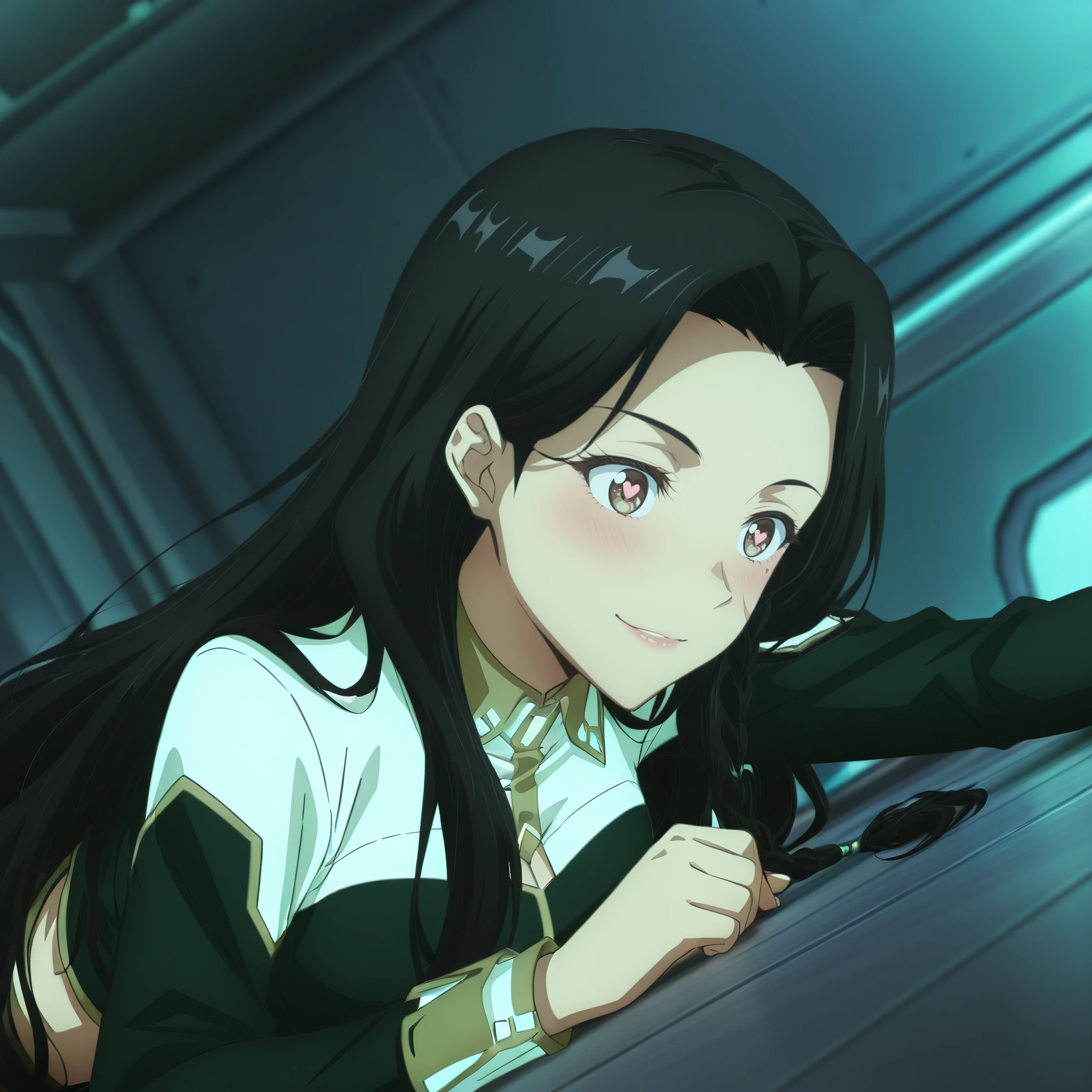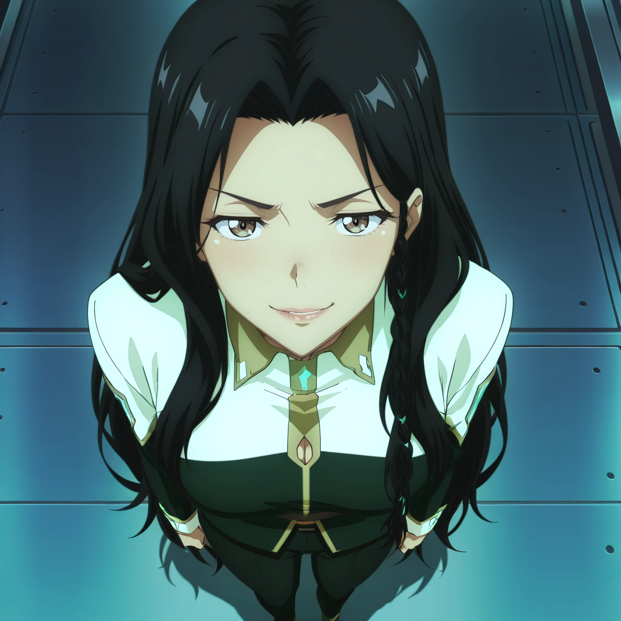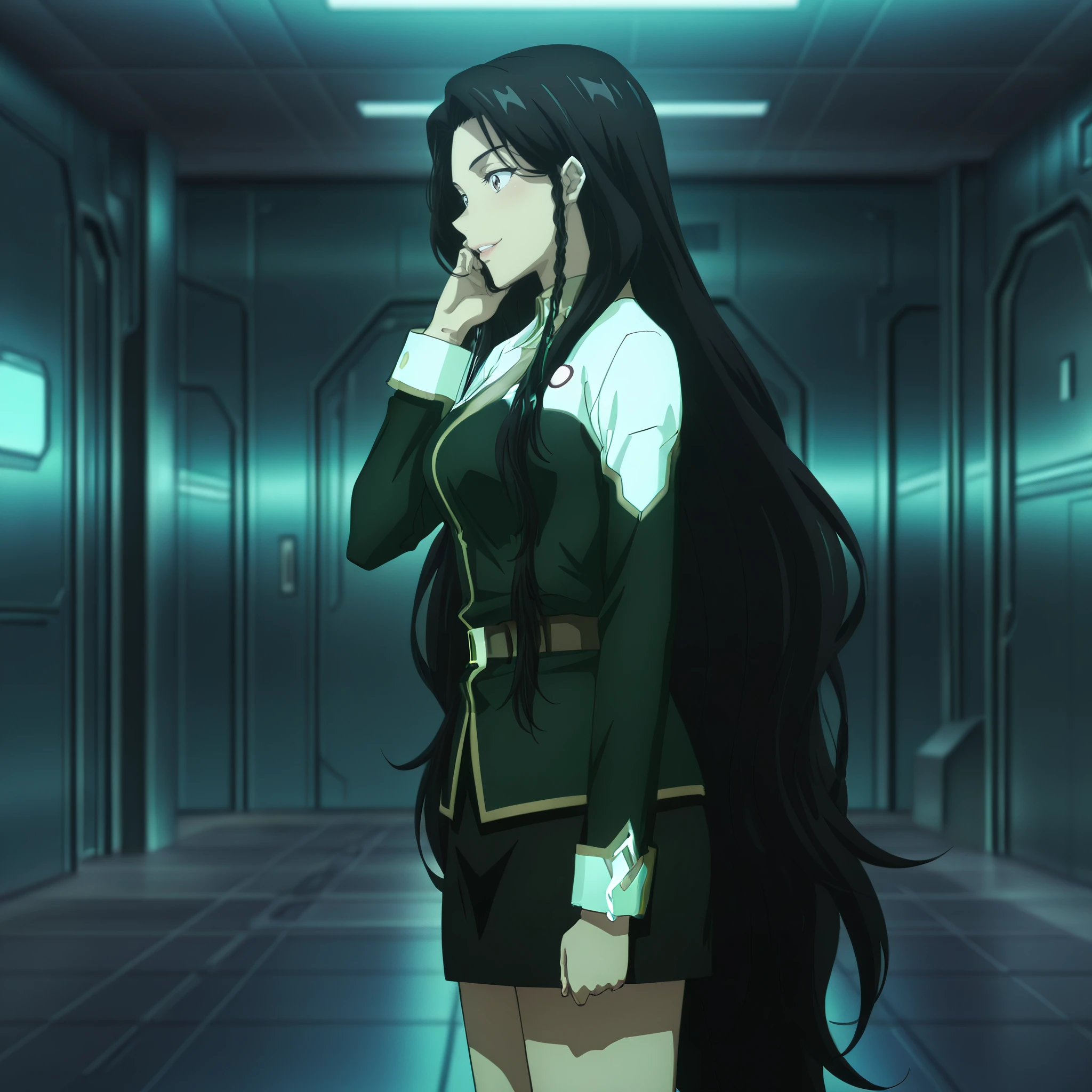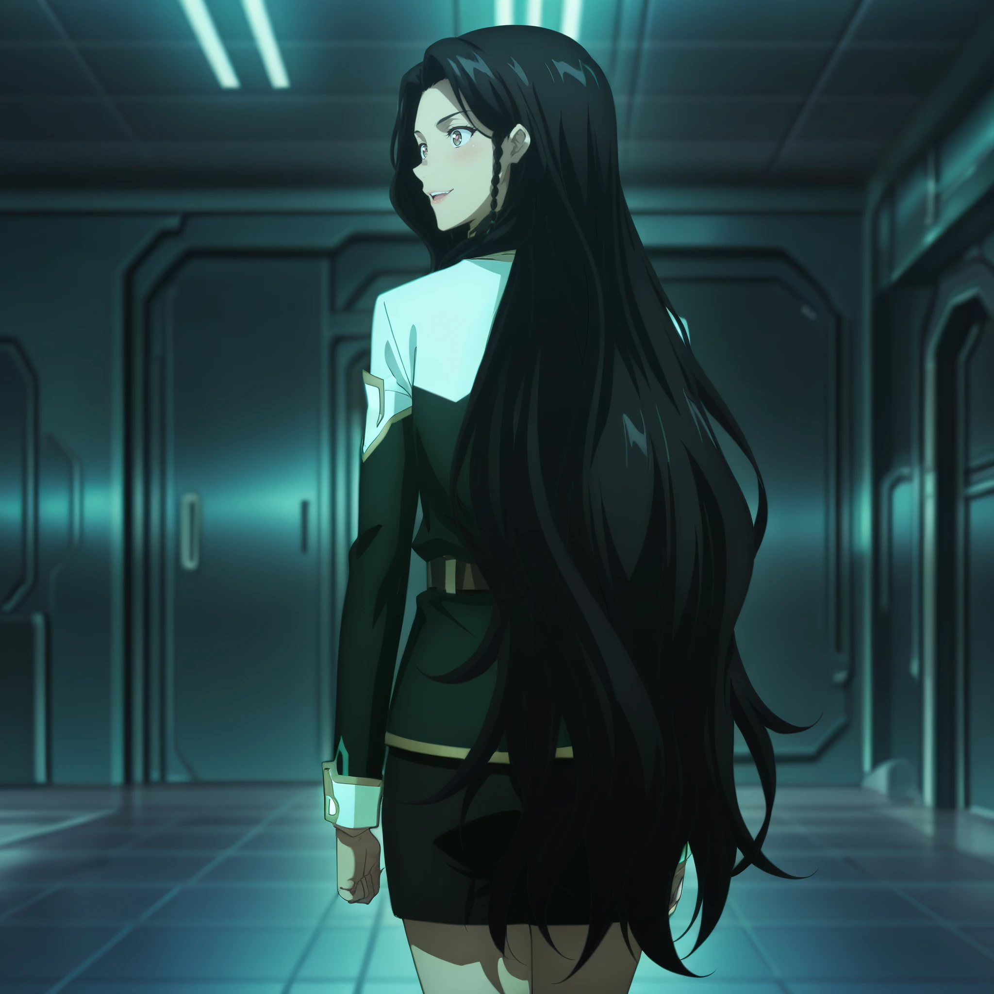 DRSelma, brown eyes, black hair, very long hair, side braid, single braid,