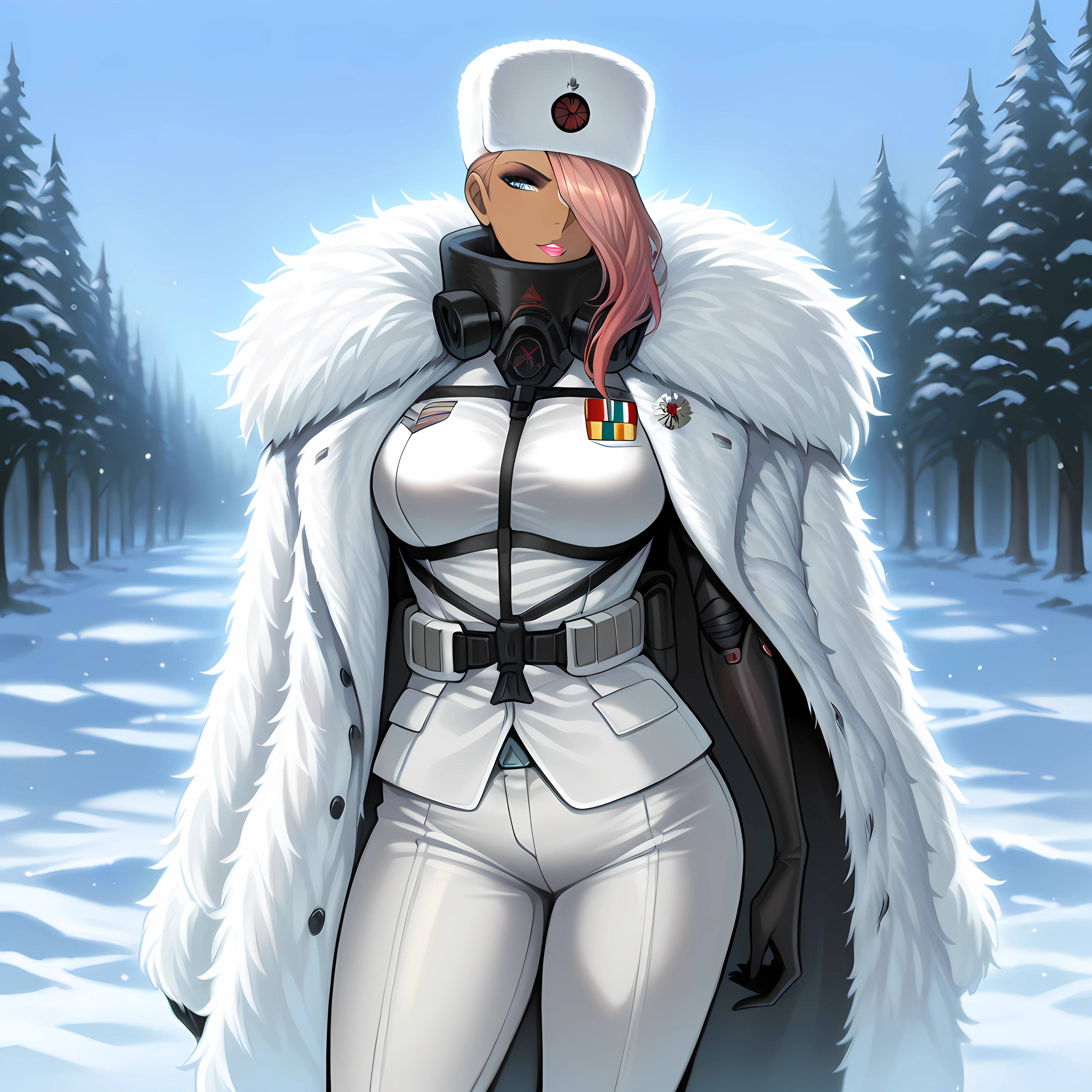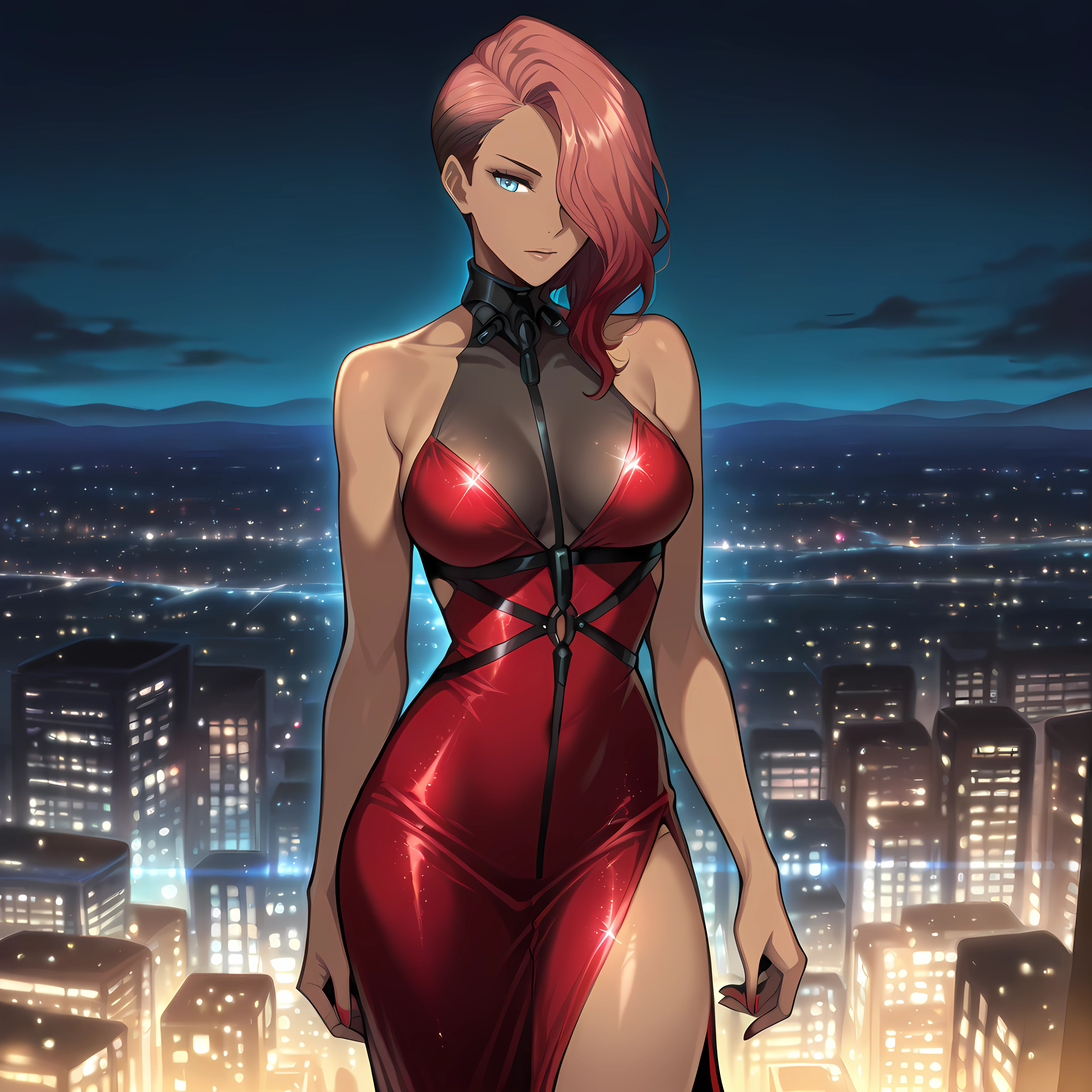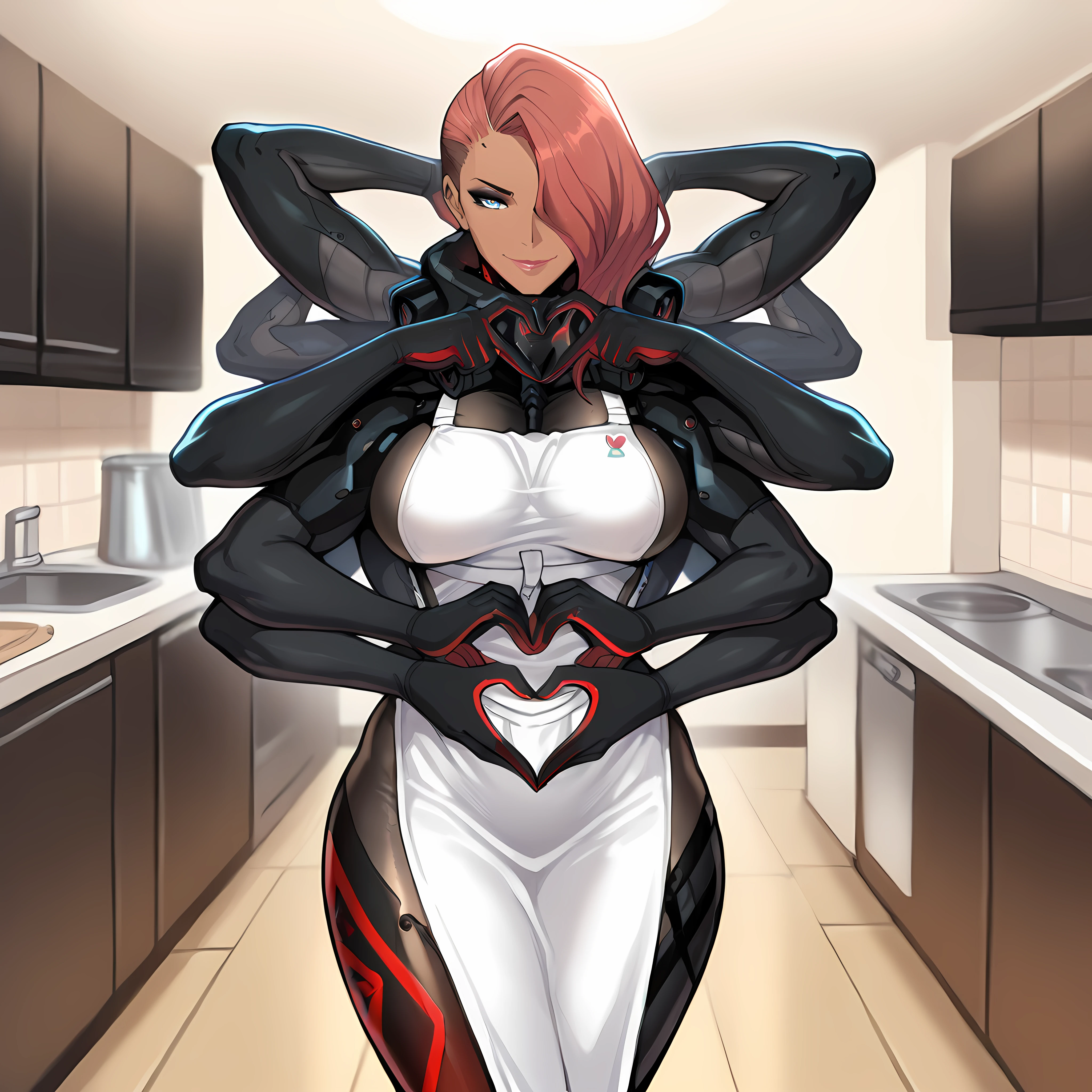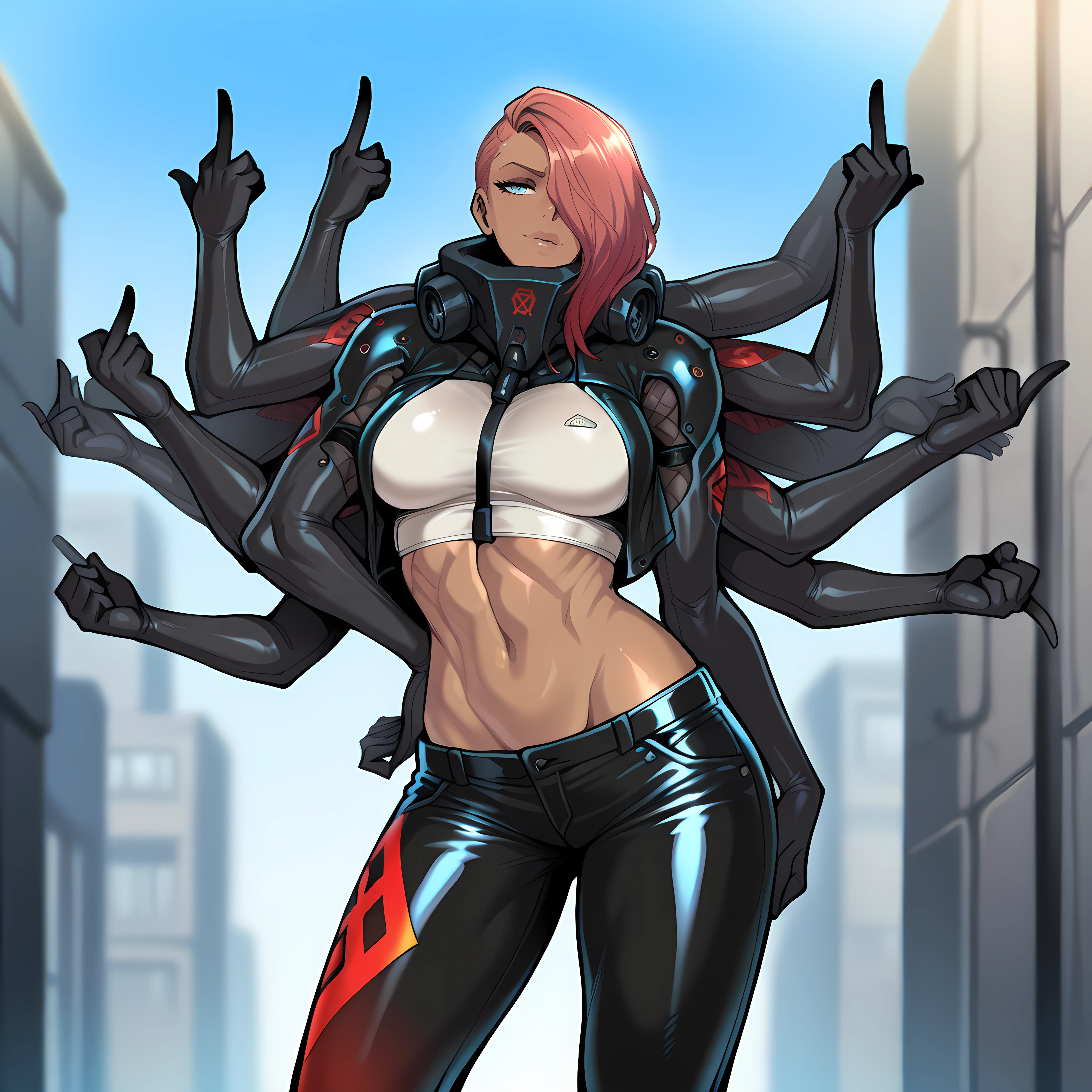 blue eyes, hair over one eye, asymmetrical hair, extra arms, mechanical arms, dark-skinned female, cyborg, bodysuit, skin tight, lipstick, eyeshadow