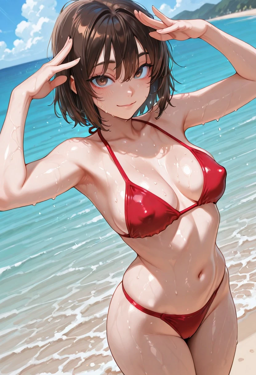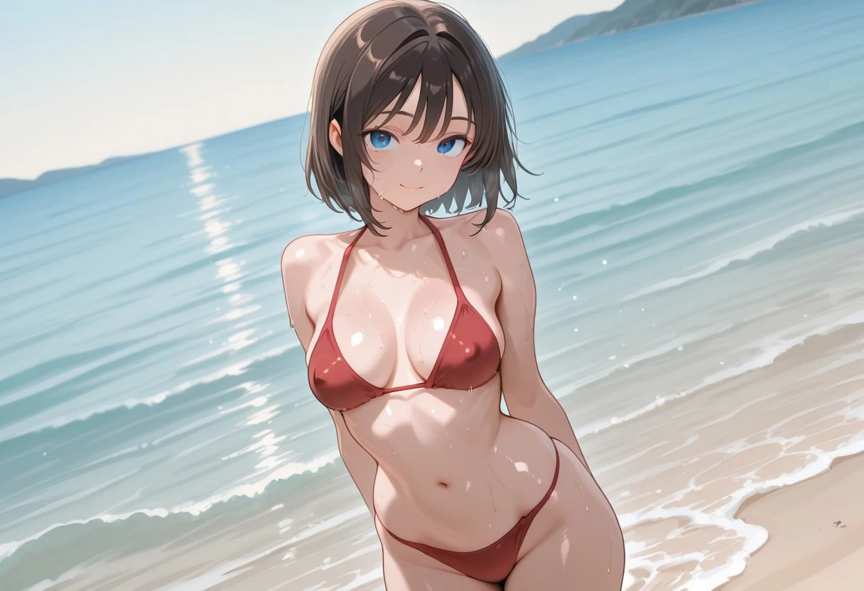 Aoi, wild bangs, black hair, medium wide hair, medium breasts, slim, curvy, red bikini, covered nipples, strap bikini panty, tareme, brown eyes,
