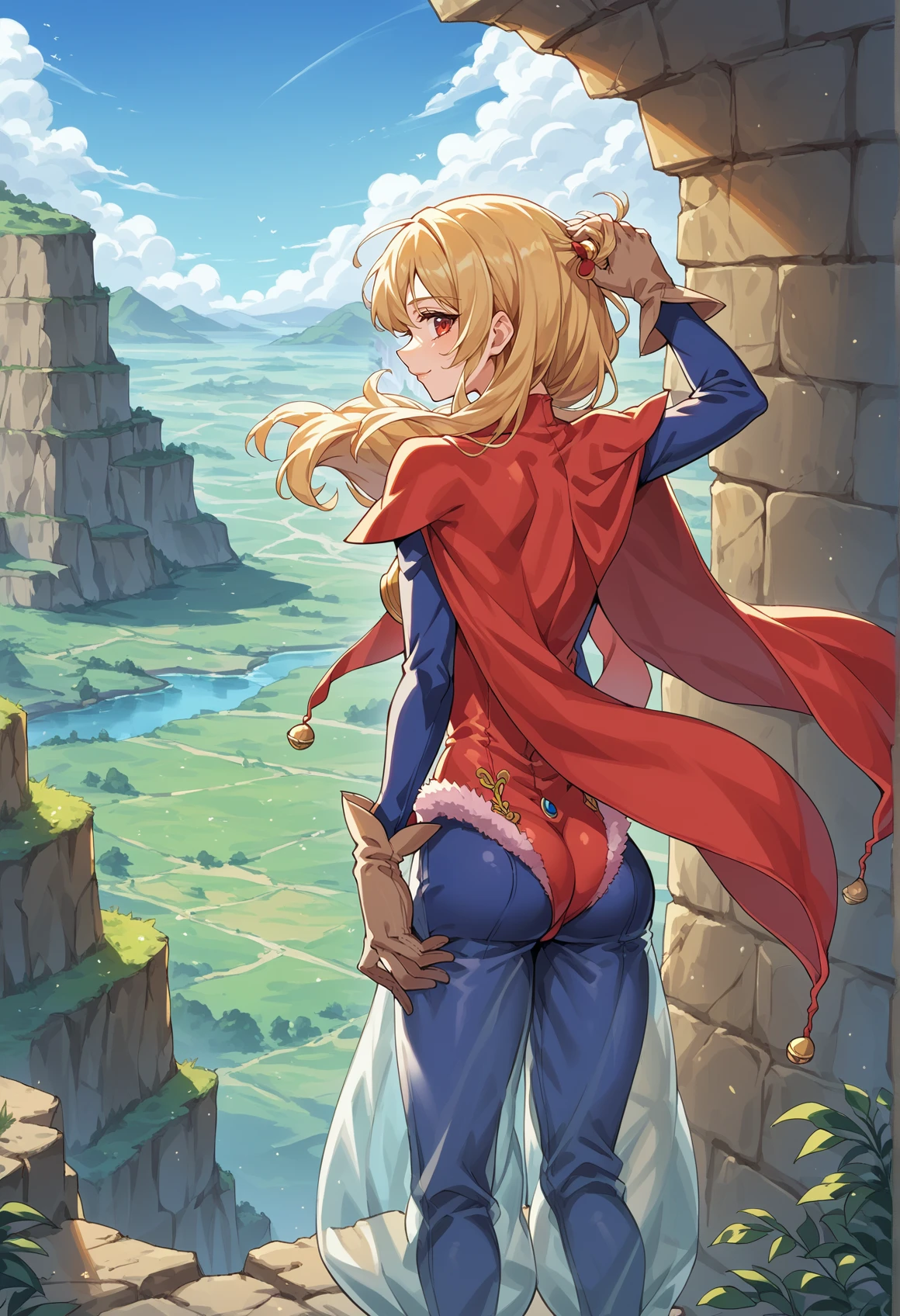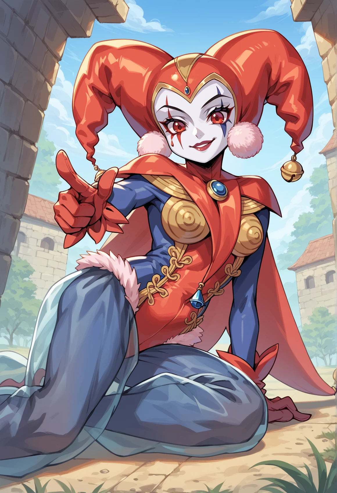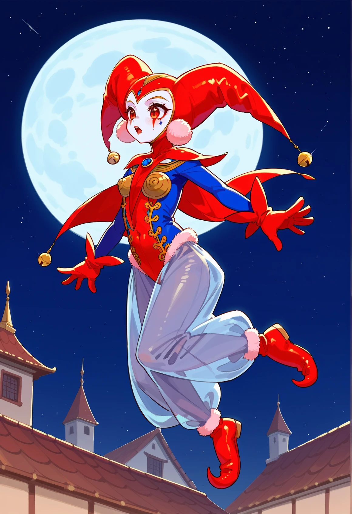 red eyes, facepaint, jester, jester cap, leotard, capelet, bell, gloves, blue pantyhose, see-through harem pants, harem pants, fur trim, pom pom \(clothes\), red footwear,