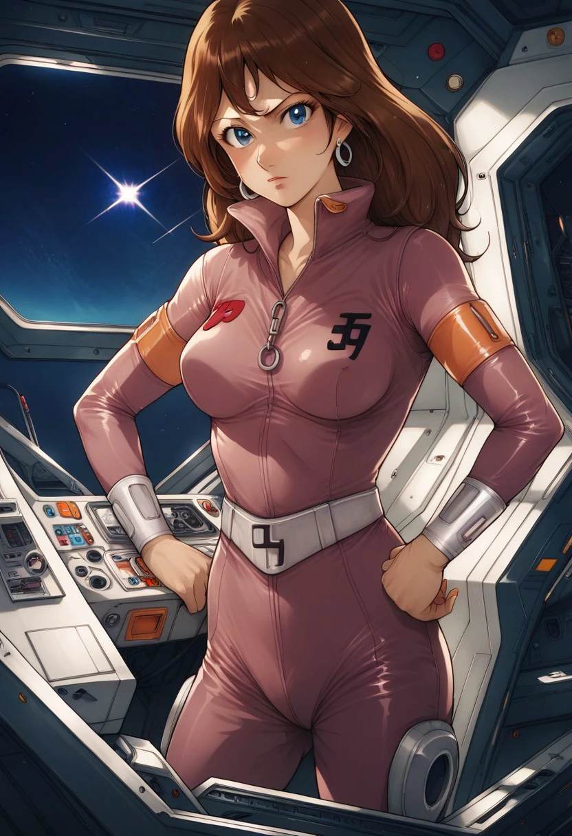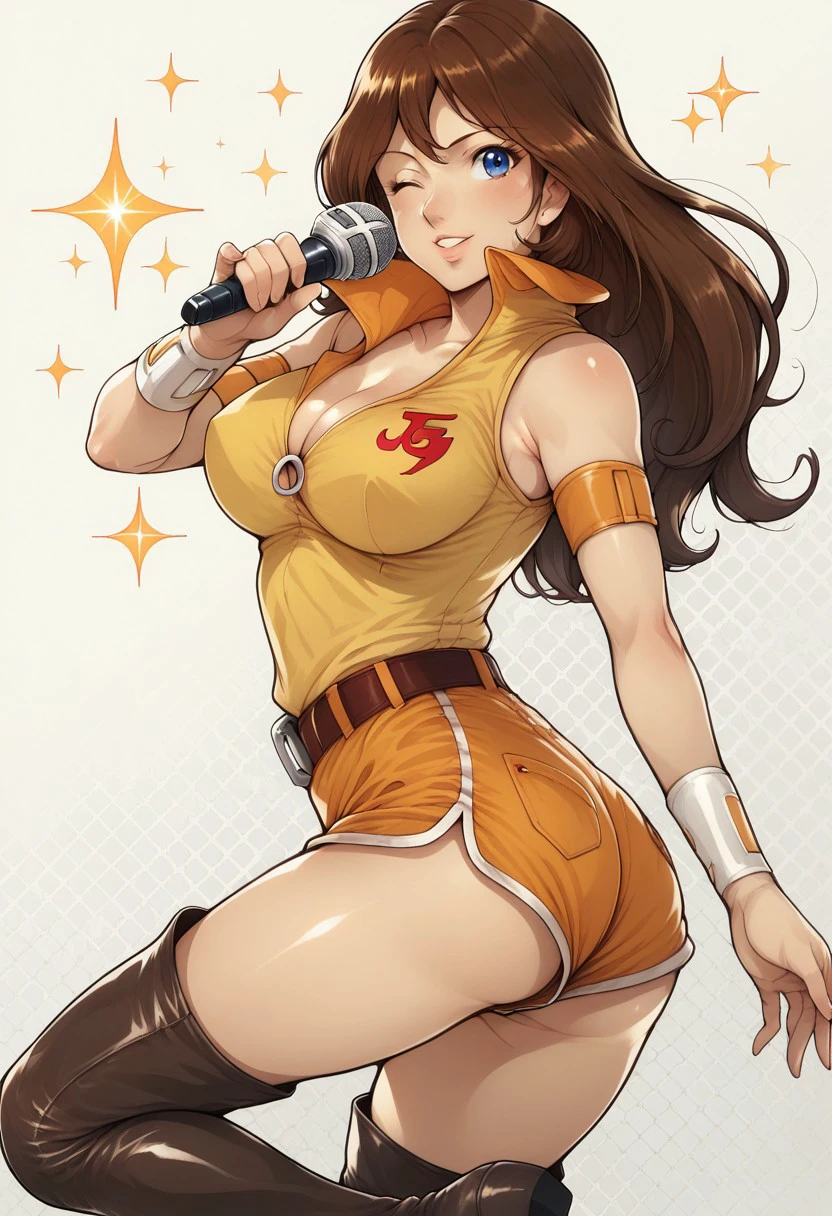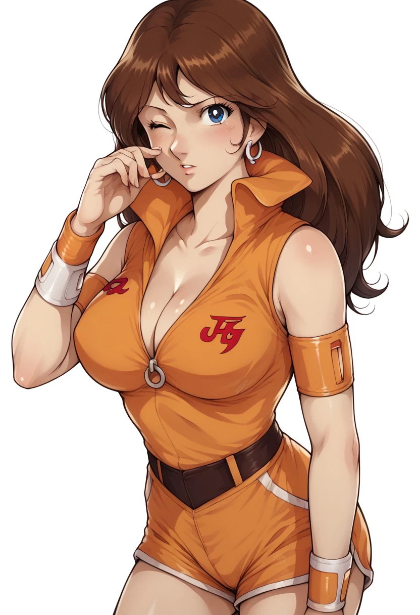 galaxy cyclone braiger, machiko valencia, 1girl, solo, breasts, cleavage, brown hair, large breasts,jewelry, earrings, long hair, retro artstyle, shorts, 1980s (style), blue eyes, wristband,armband, orang shirt,sleeveless, orang skirt