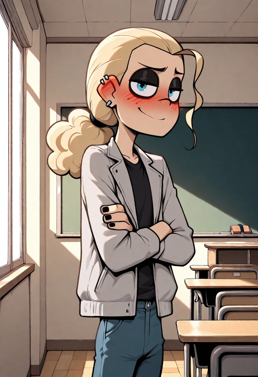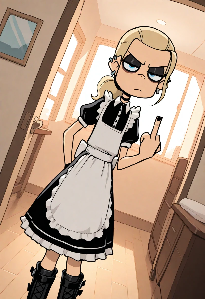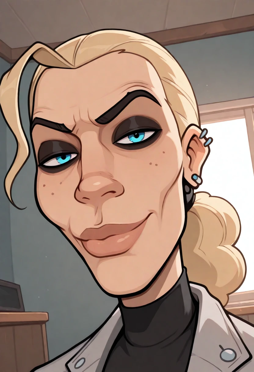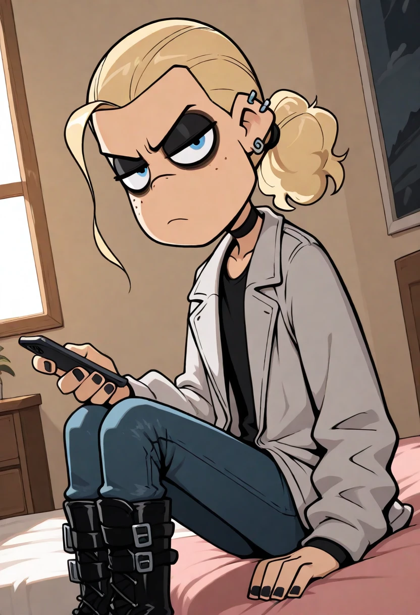 1boy, dee, blonde hair, ponytail, earrings, ear piercing, blue eyes, black nailsOutfit words: