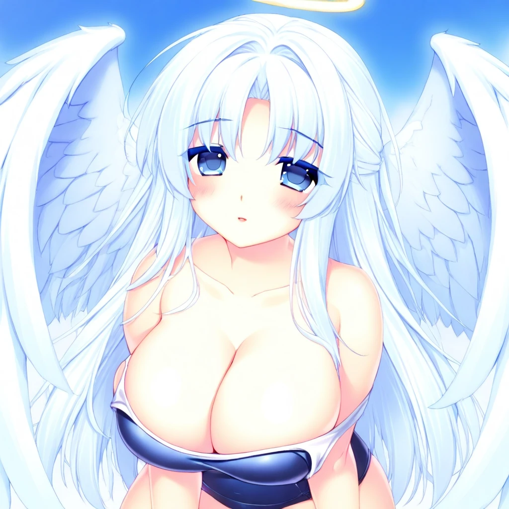 Appearance: white long hair, blue eyes, pointy ears, angel wings, large breasts