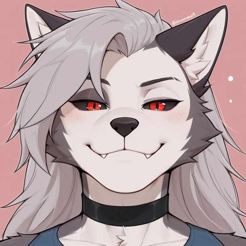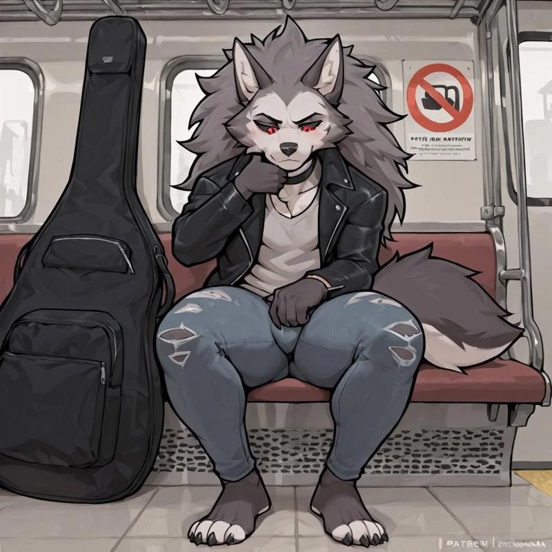 Mloona,Anthro wolf,Furry male,Greyfur,red pupils,Black sclera,Long hair,Tail,Blue Tank top,Black tight pants,Torn clothing,Choker,Bare feet