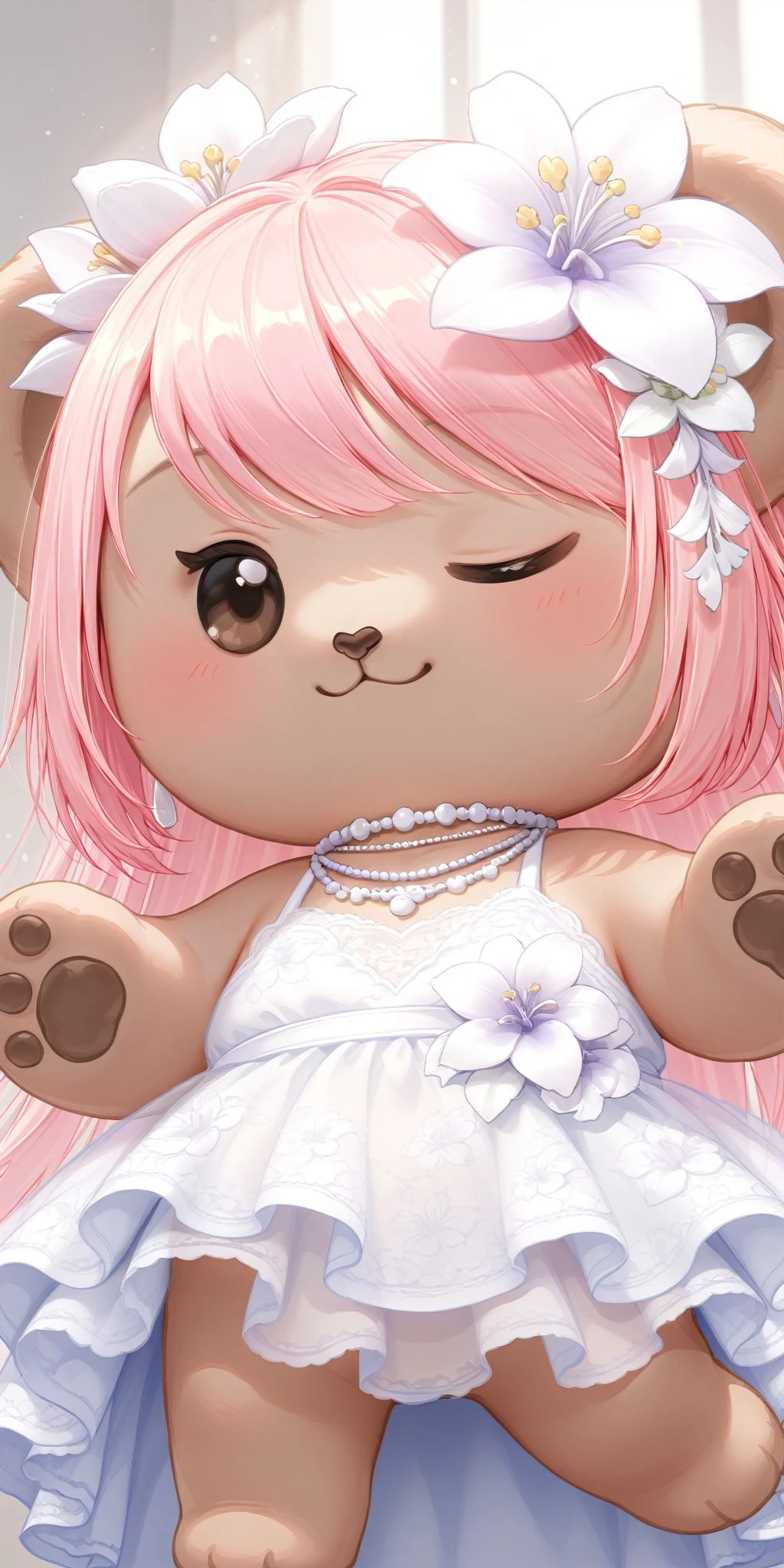 no humans, Teddy-Radiant,(flat eyes:1.4),white dress,tattoo,smile,hair flower,necklace,see-through,