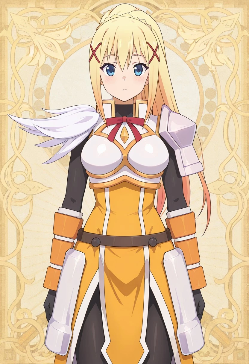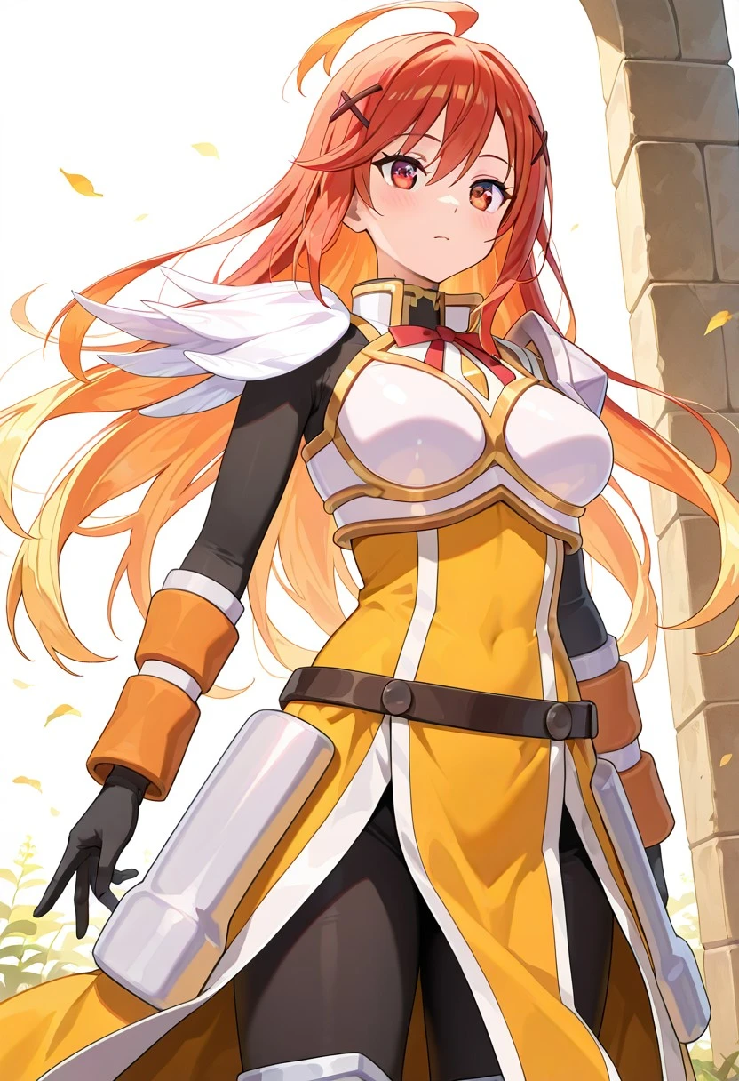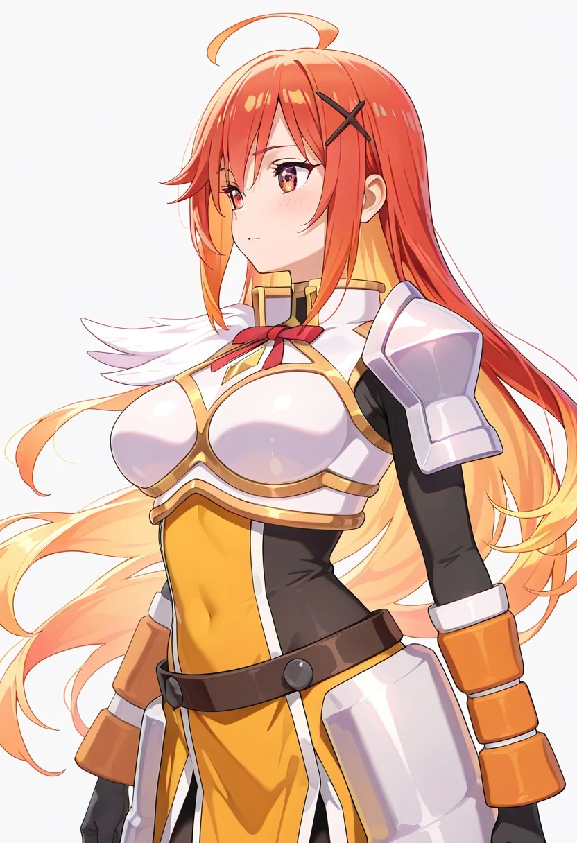 Darkness_konosuba_armor, white breastplate with gold chest panel, red ribbon bow at high collar, black long sleeve undershirt, single white shoulder pauldron with feathered ornament, dark waist belt, long yellow tabard with vertical front panel, white side panels, split skirt design over dark inner skirt, orange forearm guards, black gloves, gray leggings, light armored boots,