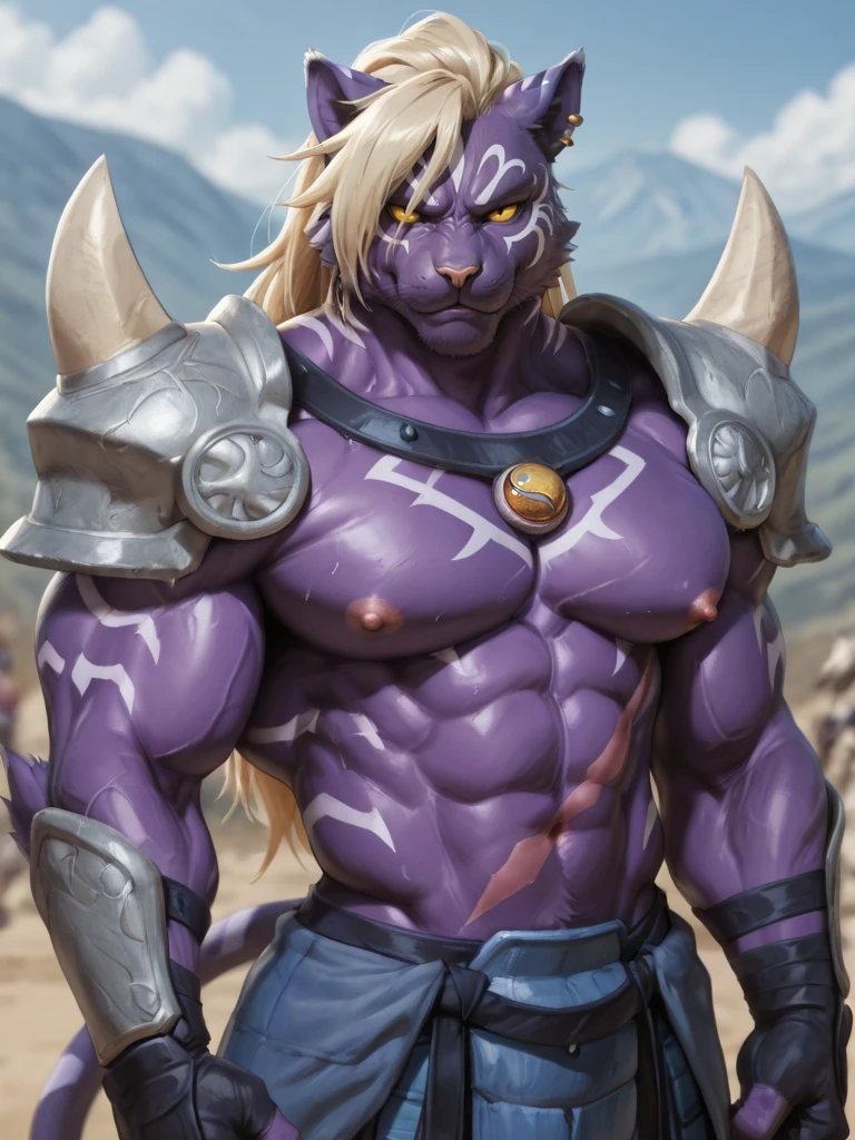 Positinve : Rangetsu, onmyou taisenki, blonde hair, yellow eye, purple body, white pattern, scar, feline