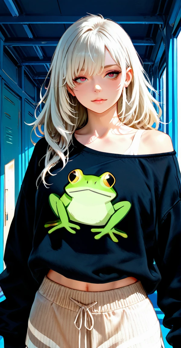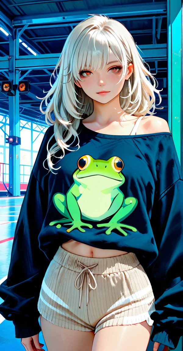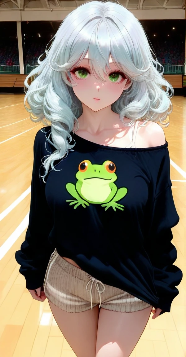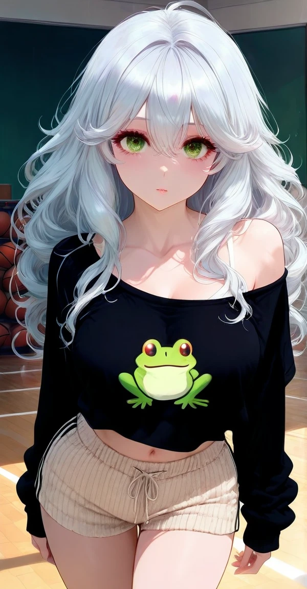 black off-shoulder sweatshirt with green frog print, beige knit shorts, black off-shoulder sweatshirt, xg1