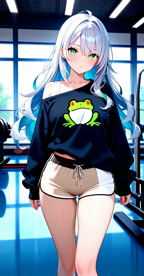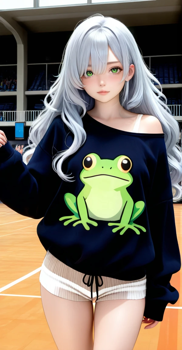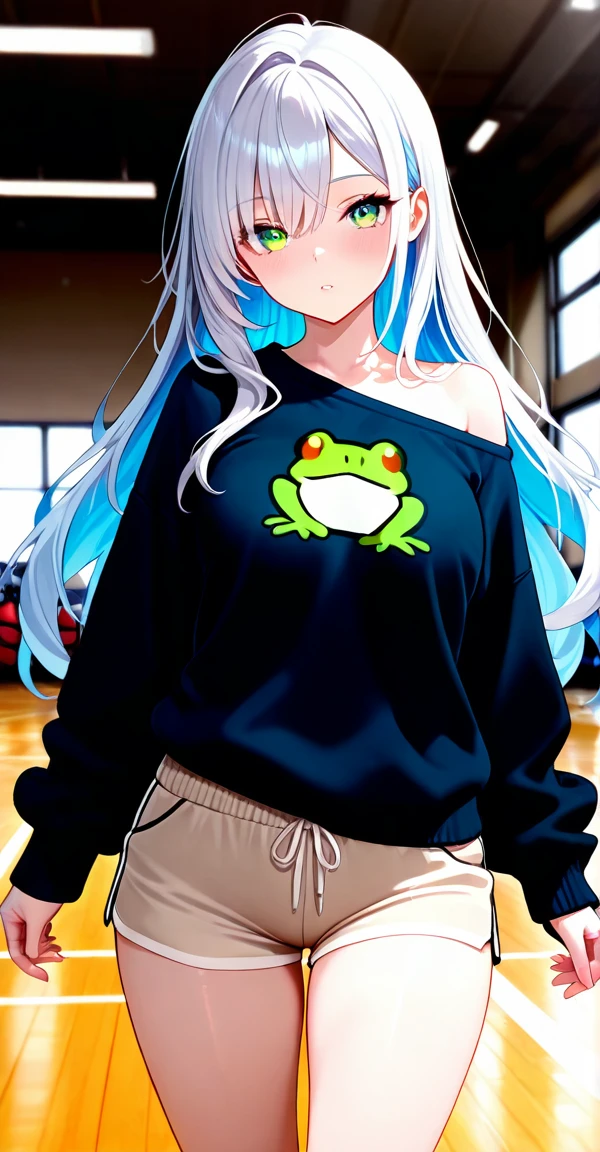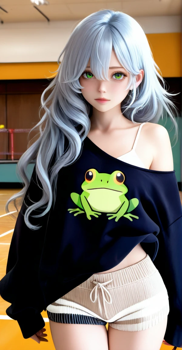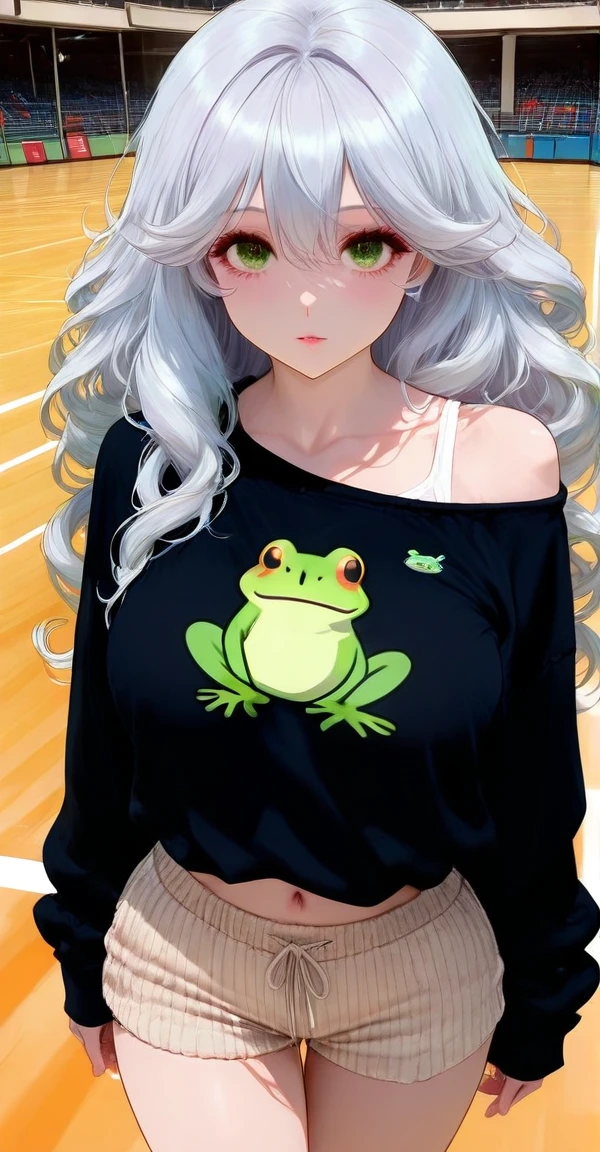 black off-shoulder sweatshirt with green frog print, beige knit shorts, black off-shoulder sweatshirt, xg1