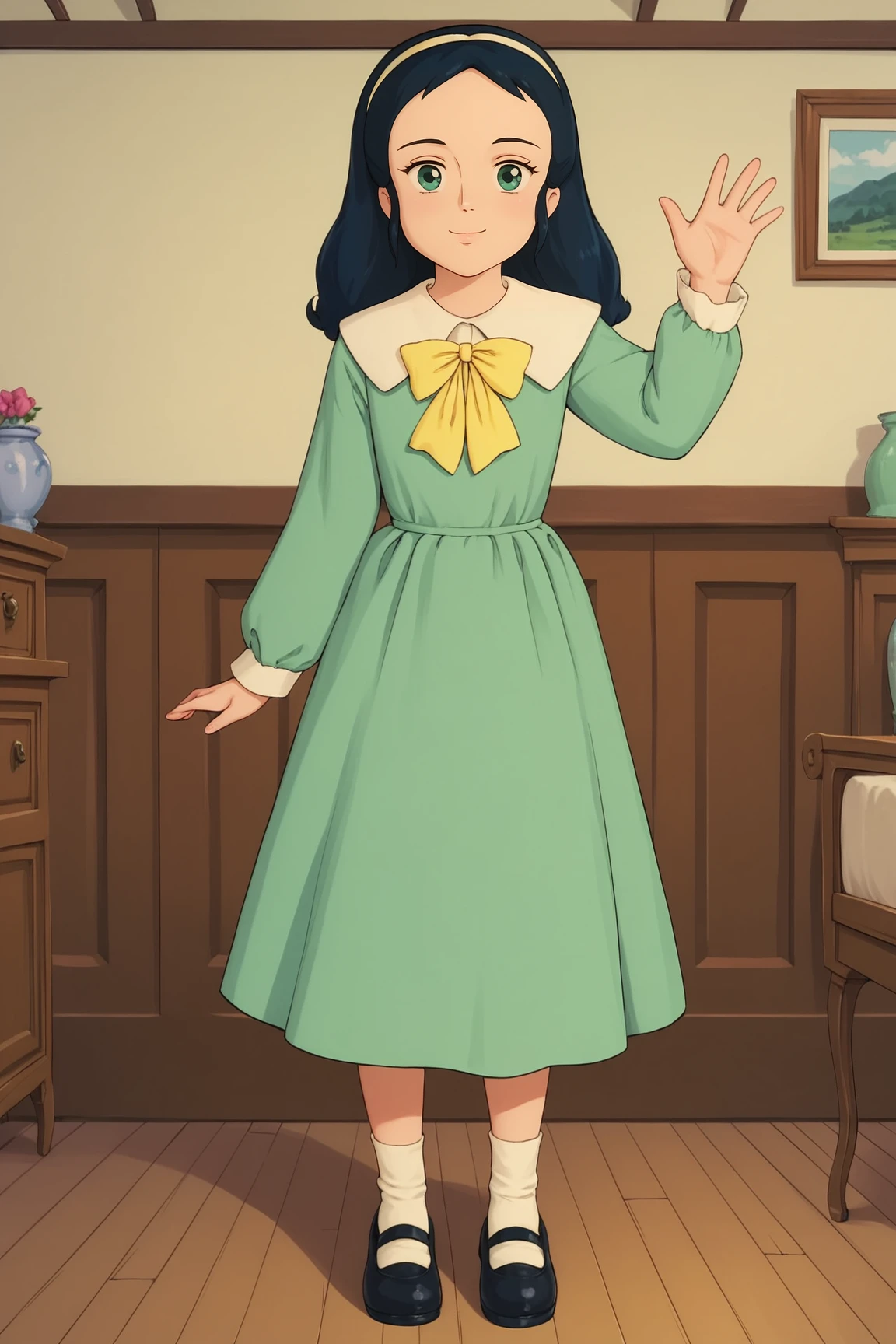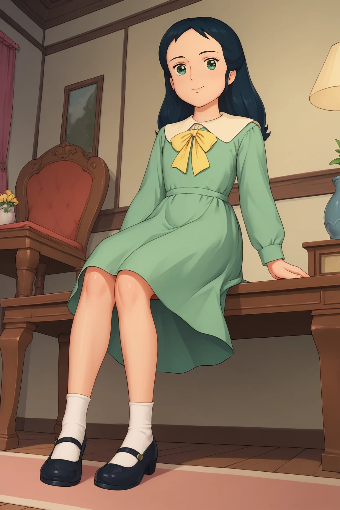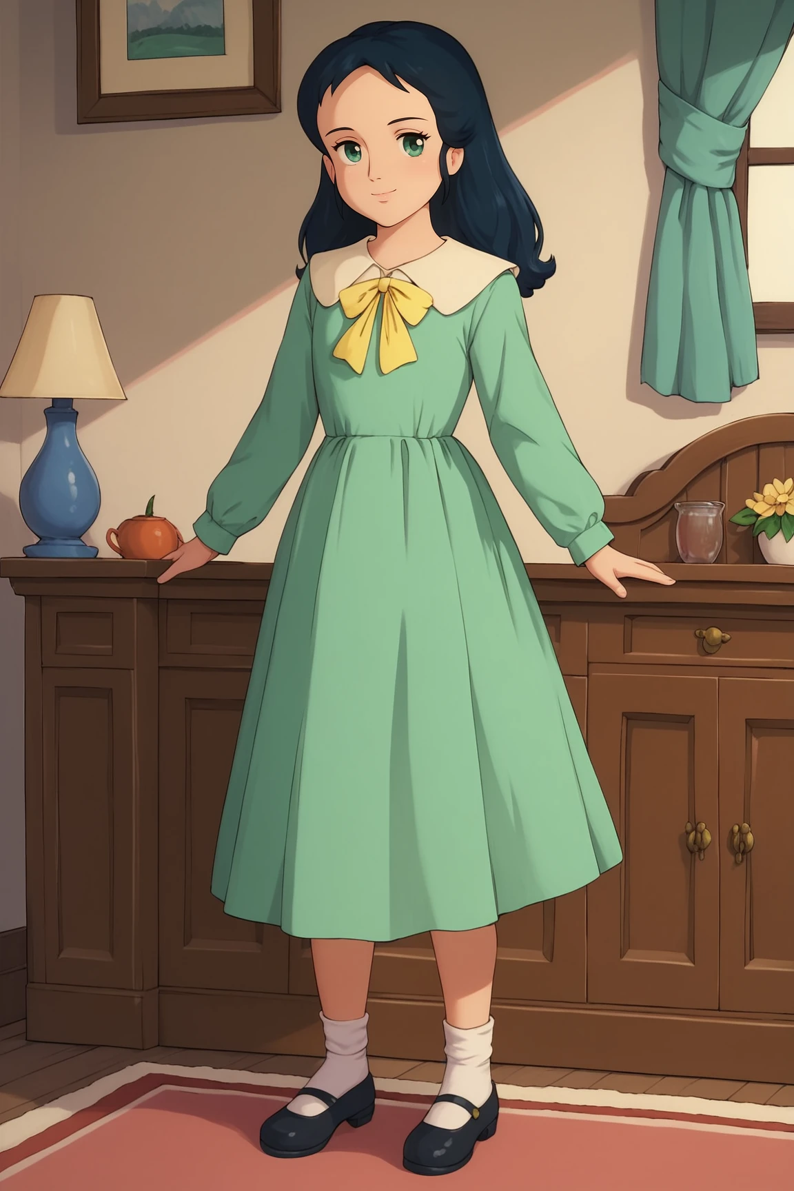 SaraMorrisLSXL, green eyes, black hair, long hair, female child, flat chest, green dress, yellow bow, long sleeves, green skirt, white socks, black shoes
