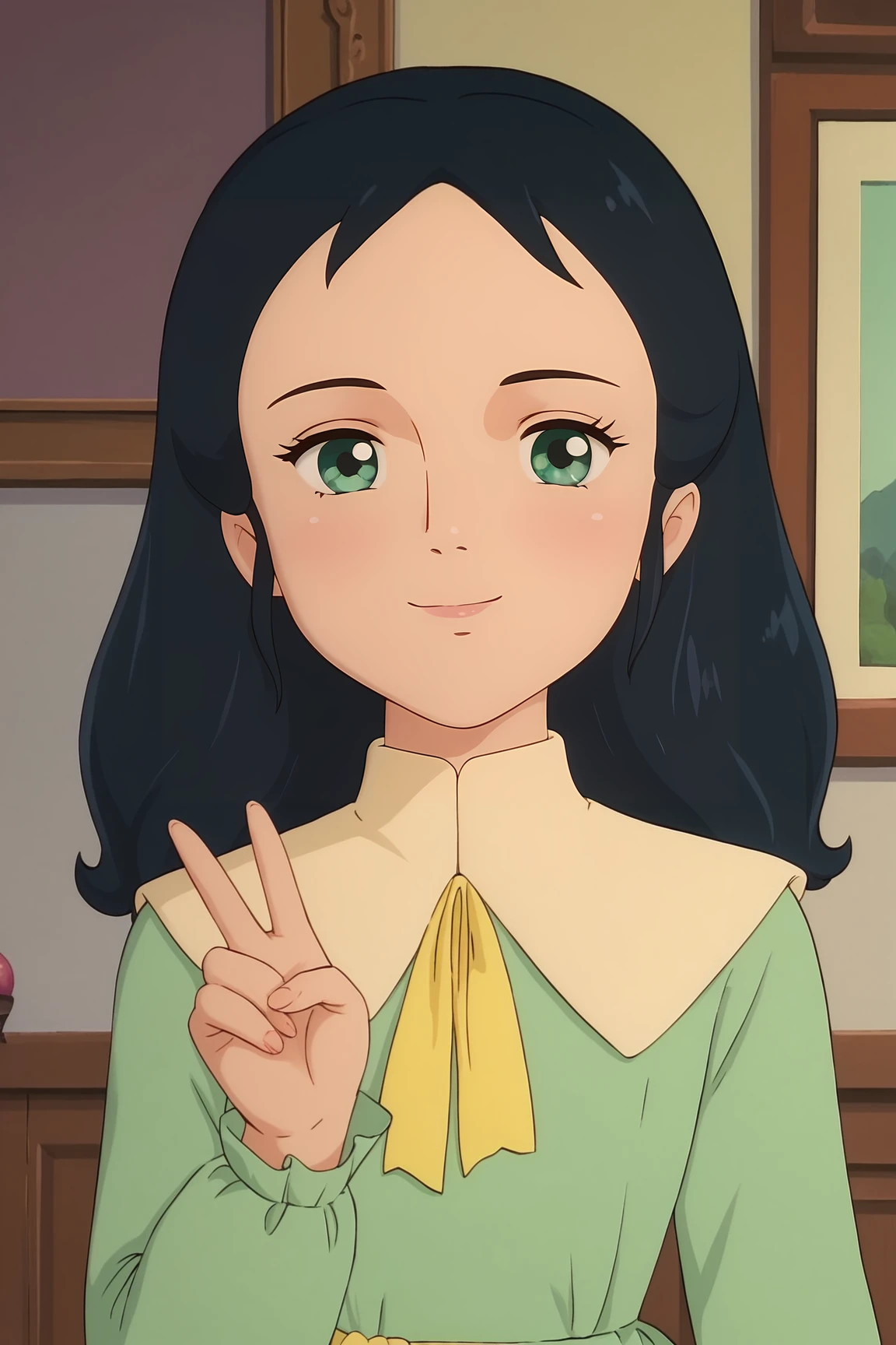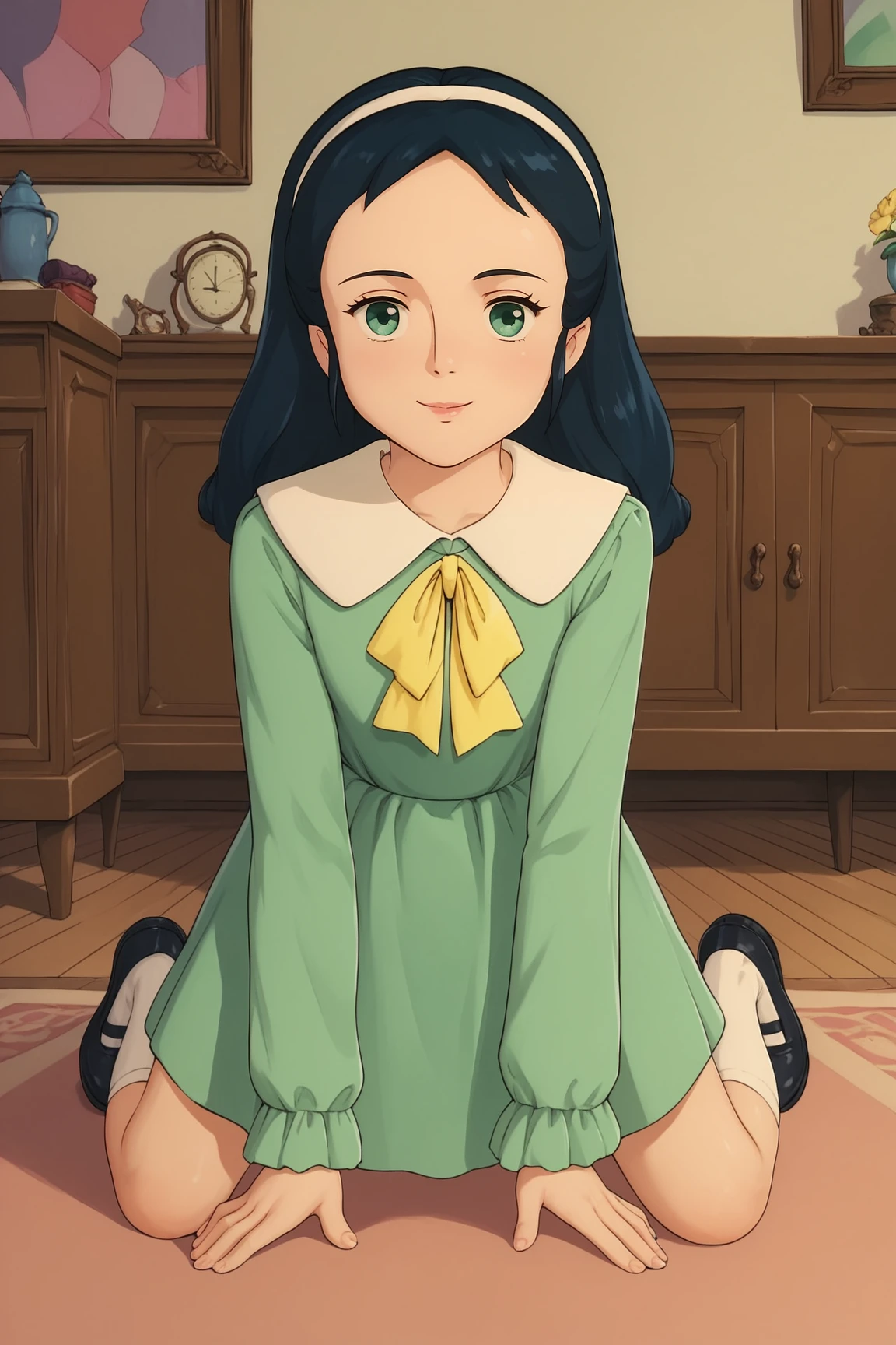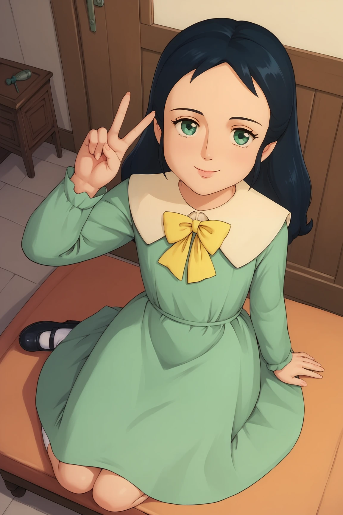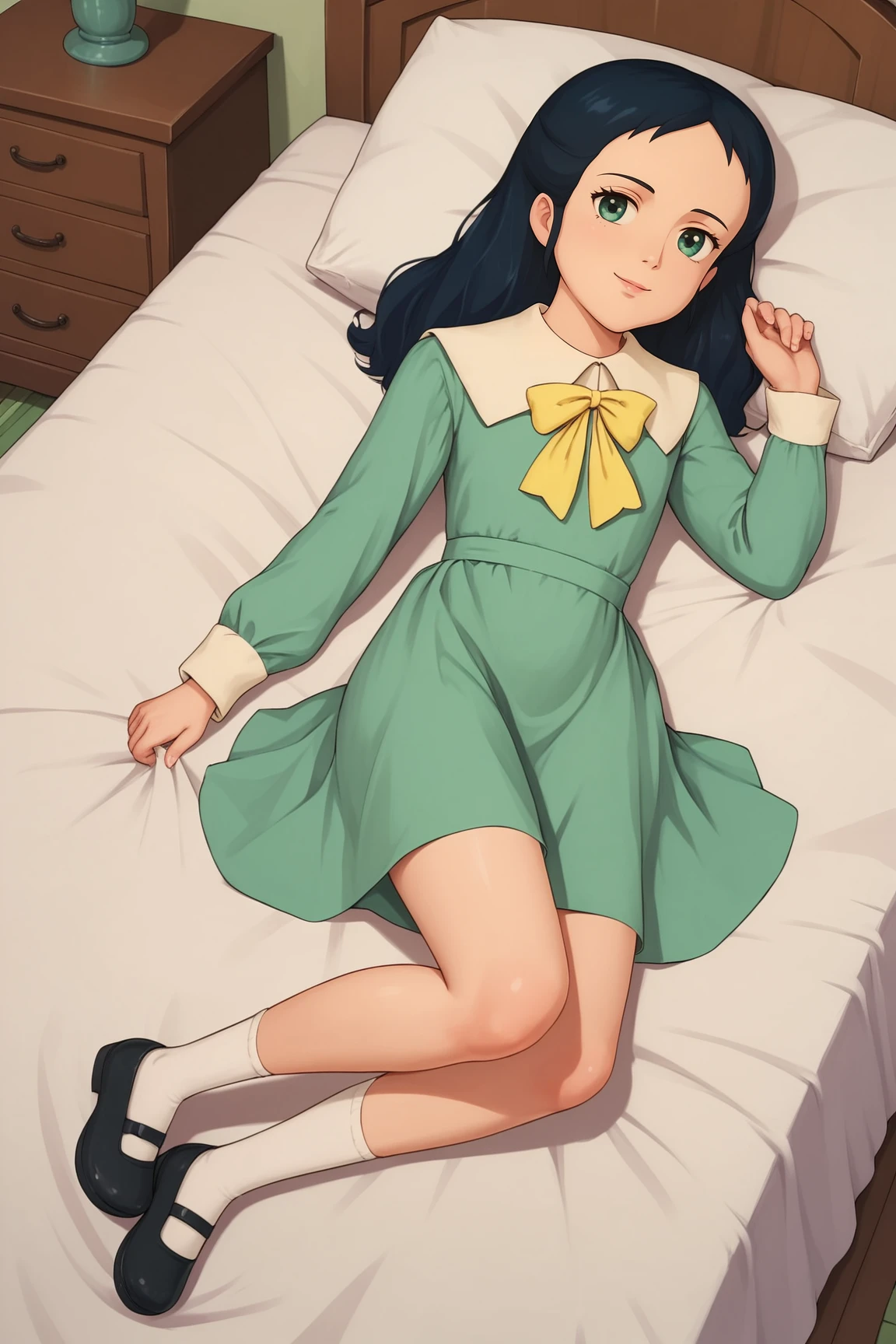 SaraMorrisLSXL, green eyes, black hair, long hair, female child, flat chest, green dress, yellow bow, long sleeves, green skirt, white socks, black shoes