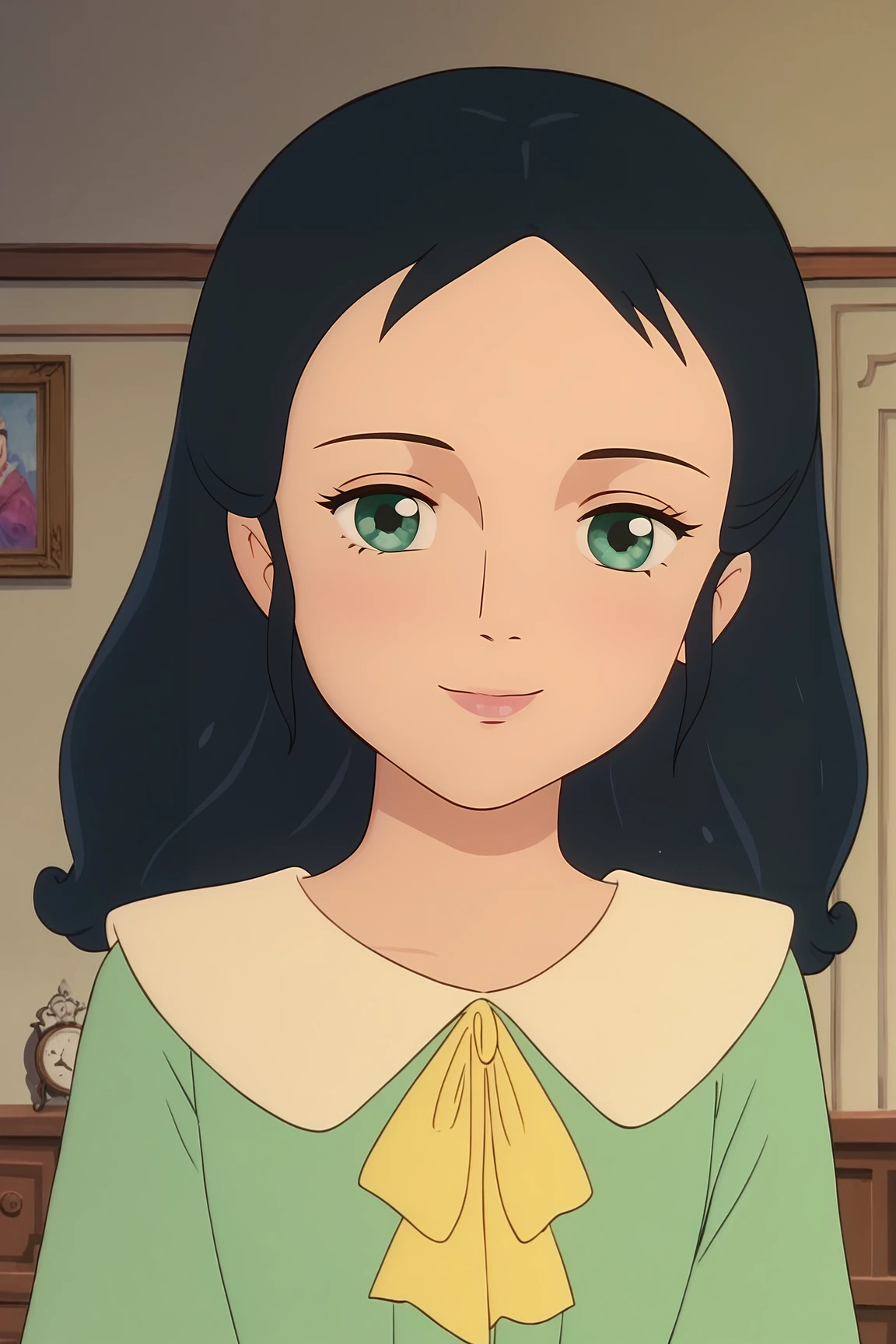 ➜ SaraMorrisLSXL, green eyes, black hair, long hair, female child, flat chest, green dress, yellow bow, long sleeves, green skirt, white socks, black shoes