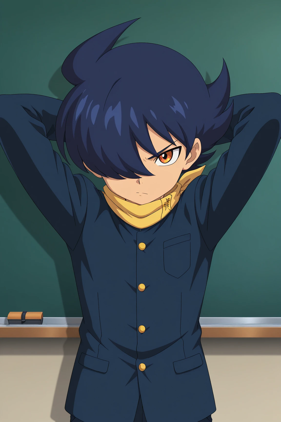 masterpiece, best quality, 1boy, anime screencap, anime coloring, male focus, solo,lightfoot, blue hair, orange eyes,yellow scarf,hair over one eye