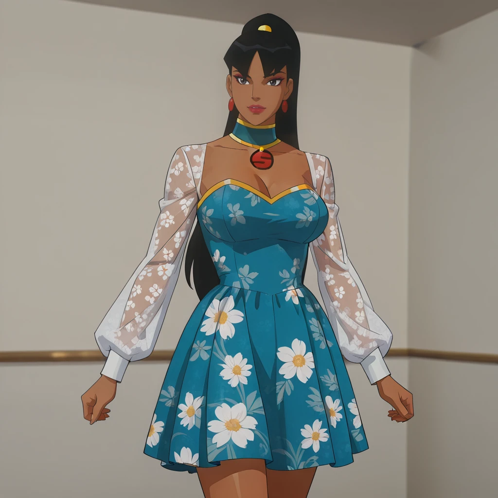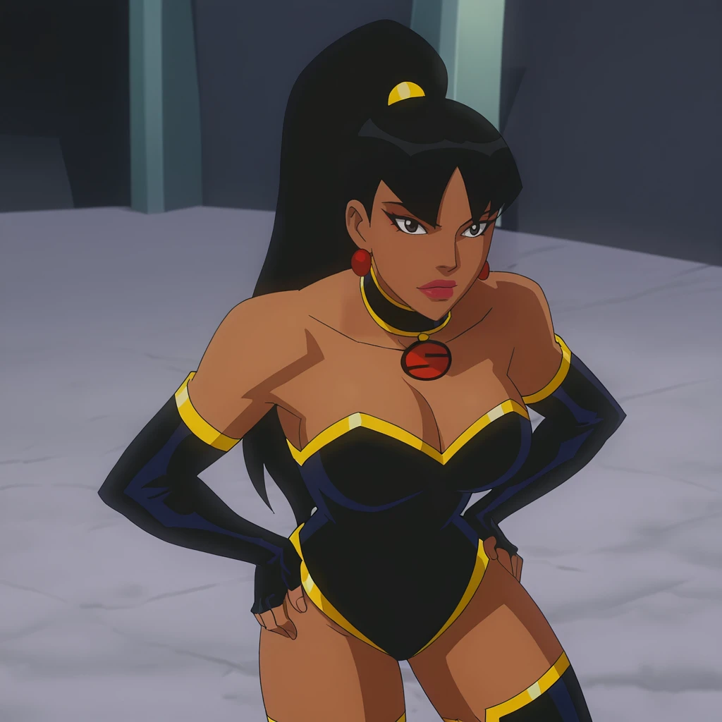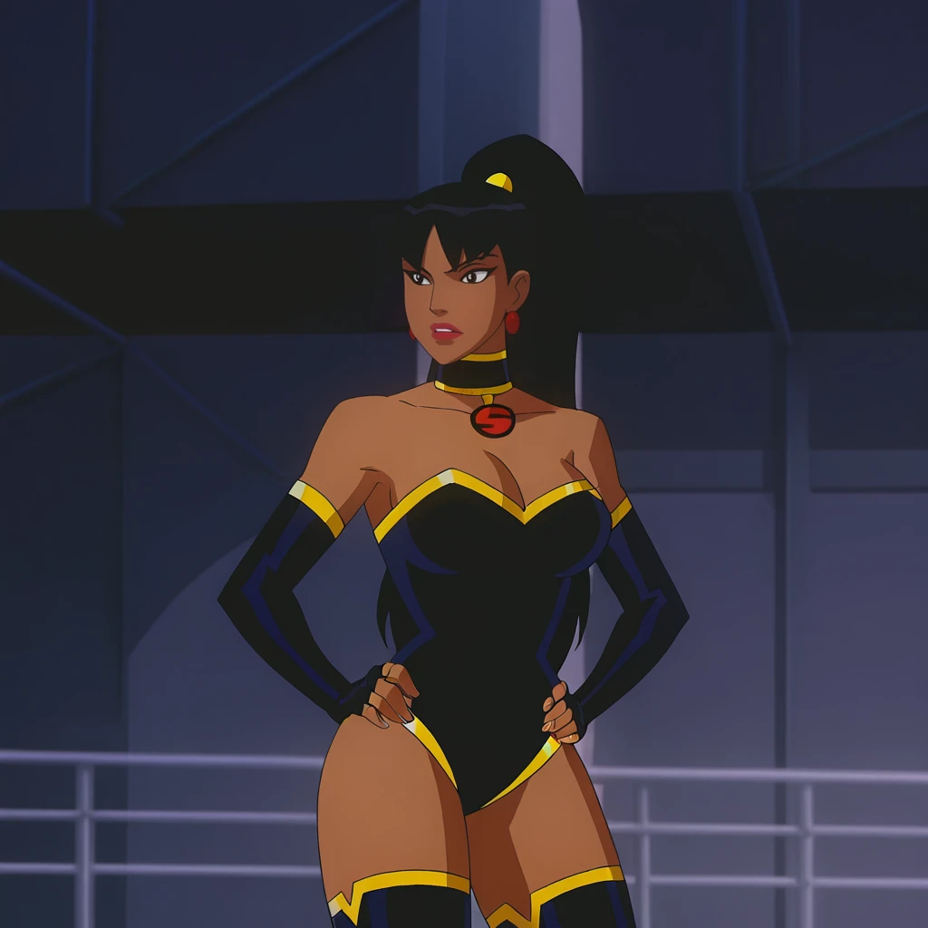 • Trigger : superwoman, 1girl, black hair, black thighhighs, fingerless gloves, black leotard, dark skin, dark-skinned female, elbow gloves, large breasts, ponytail, bare shoulders, strapless, earrings, jewelry, long hair, makeup, black gloves, lipstick, choker, cleavage, hands on hips, cowboy shot