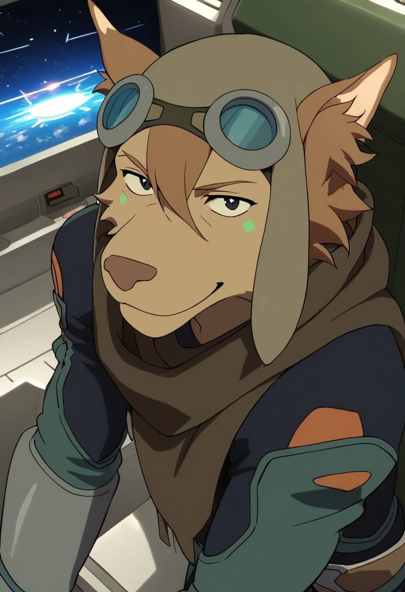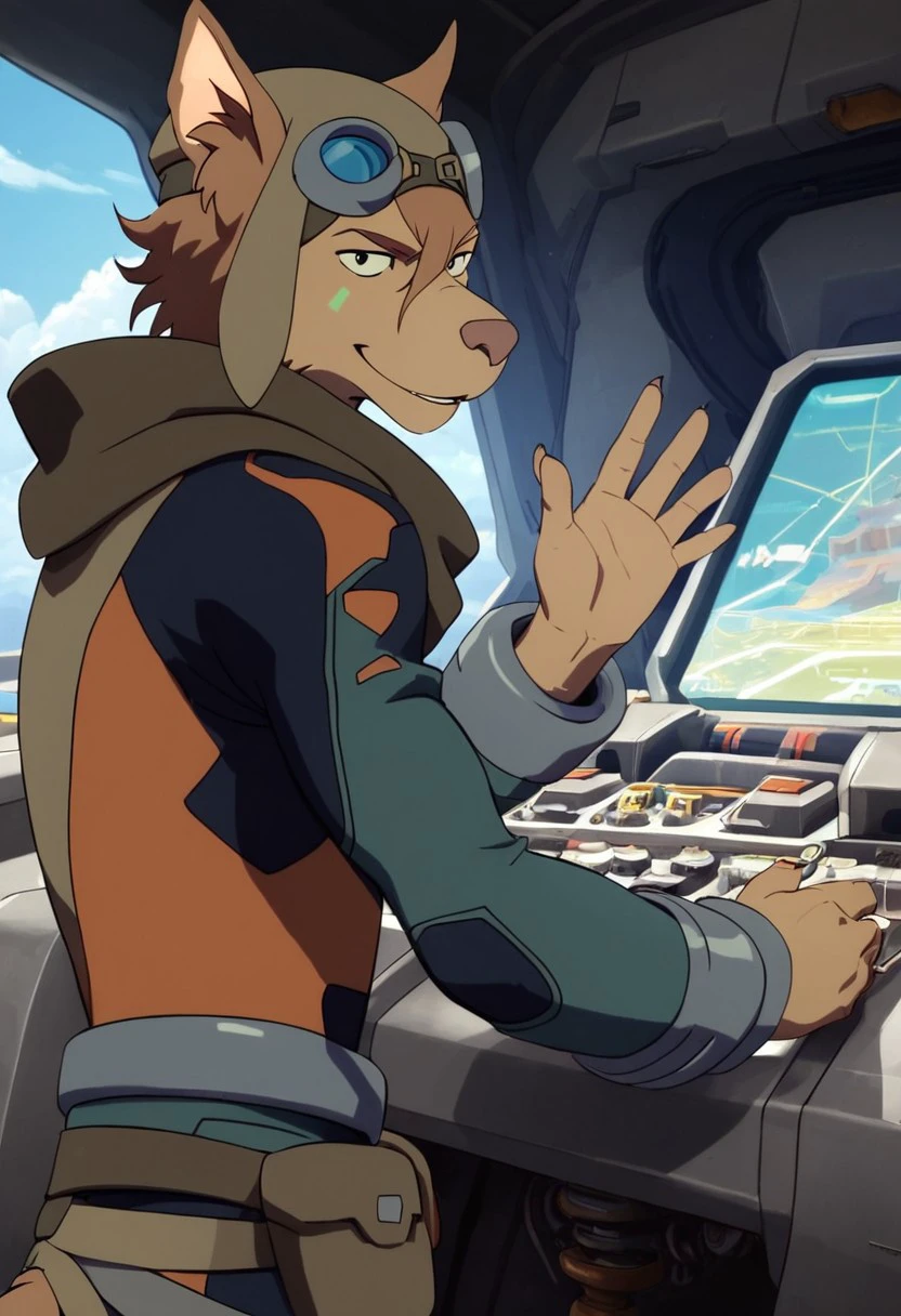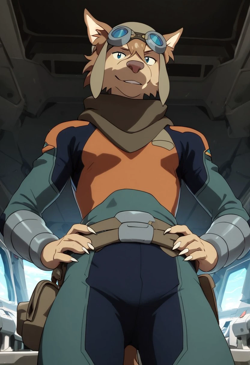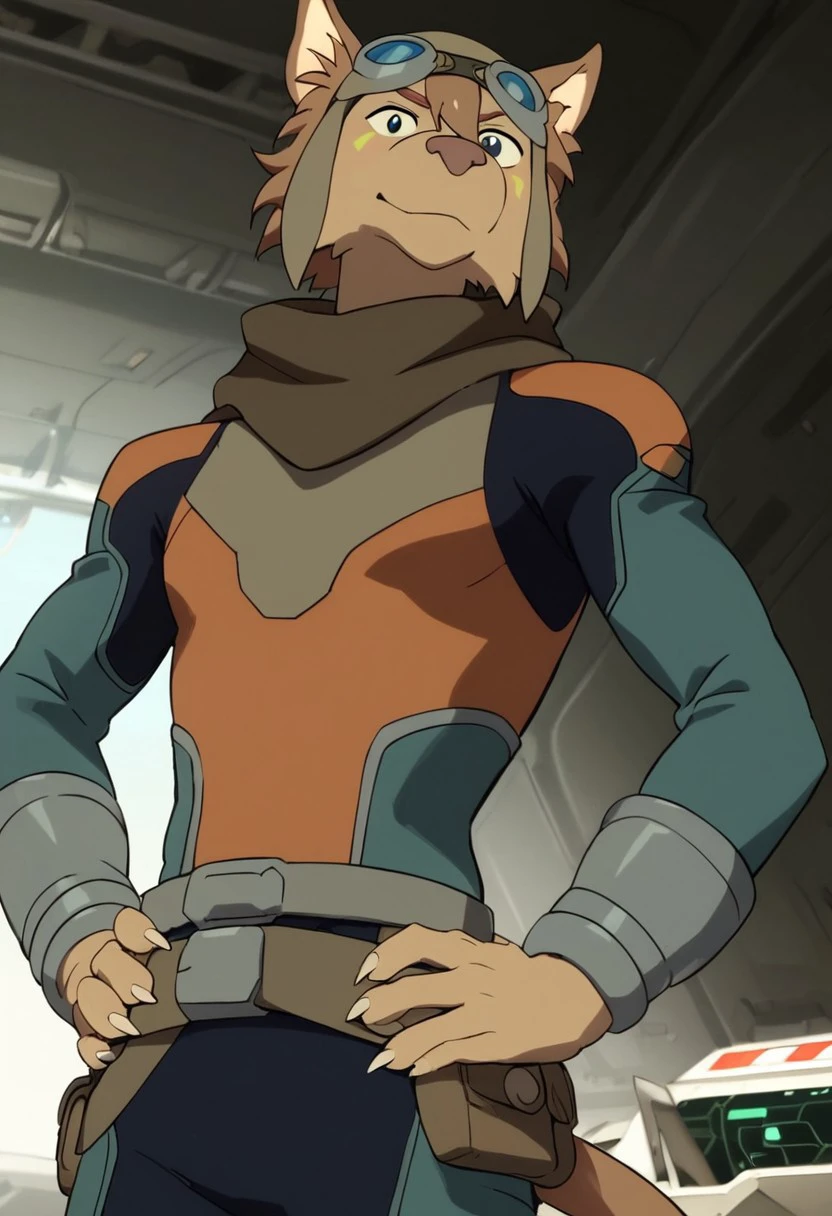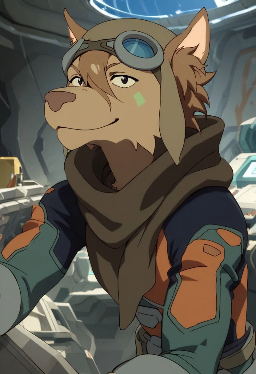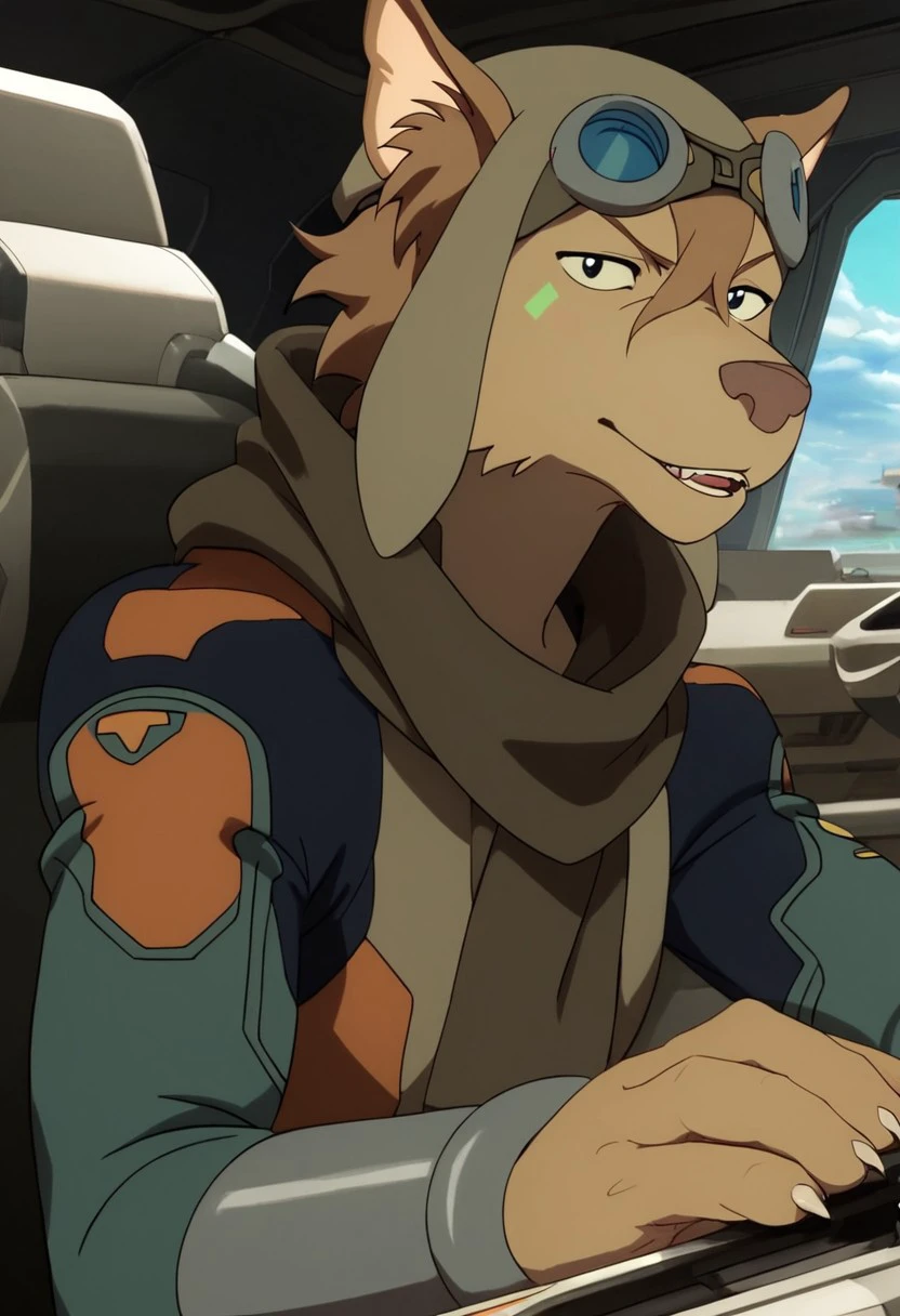 olia_voltron_gogglesON, 1girl, female furry, anthro, canide, golden fur, brown animal ears, brown hair, black eyes, small yellow tattoos on each cheeks, claws, long tail, pilot helmet and goggles, brown scarf, green and orange suit, pocket belt,