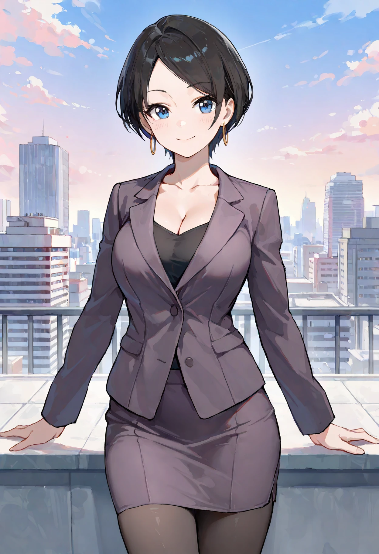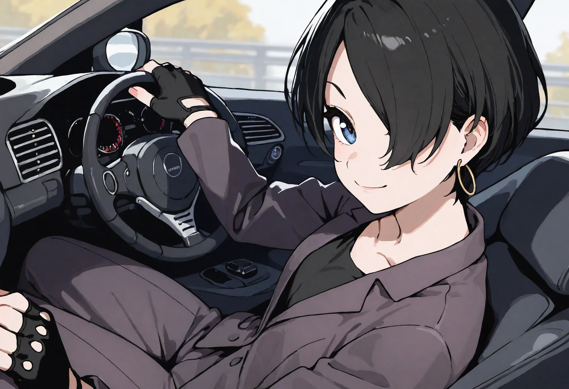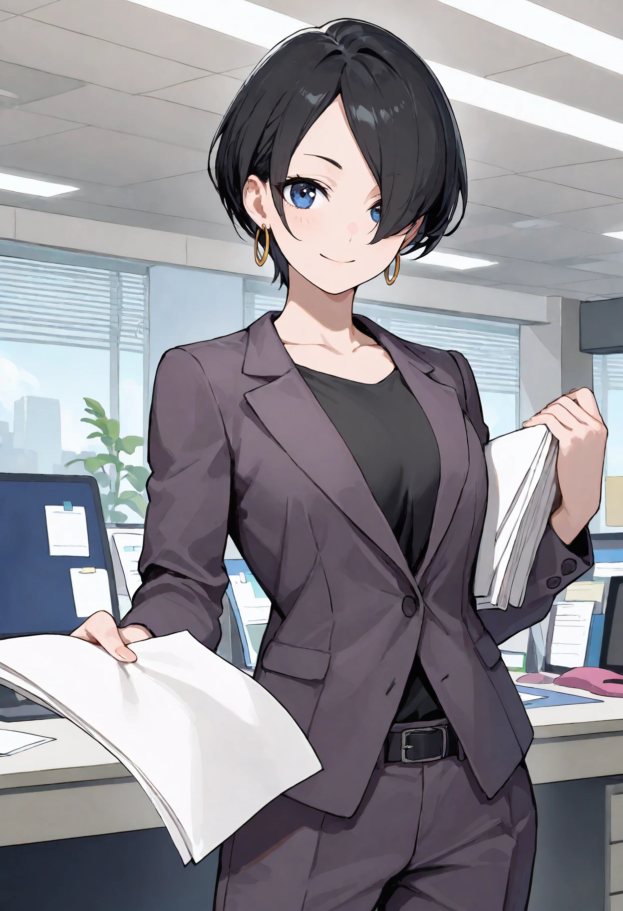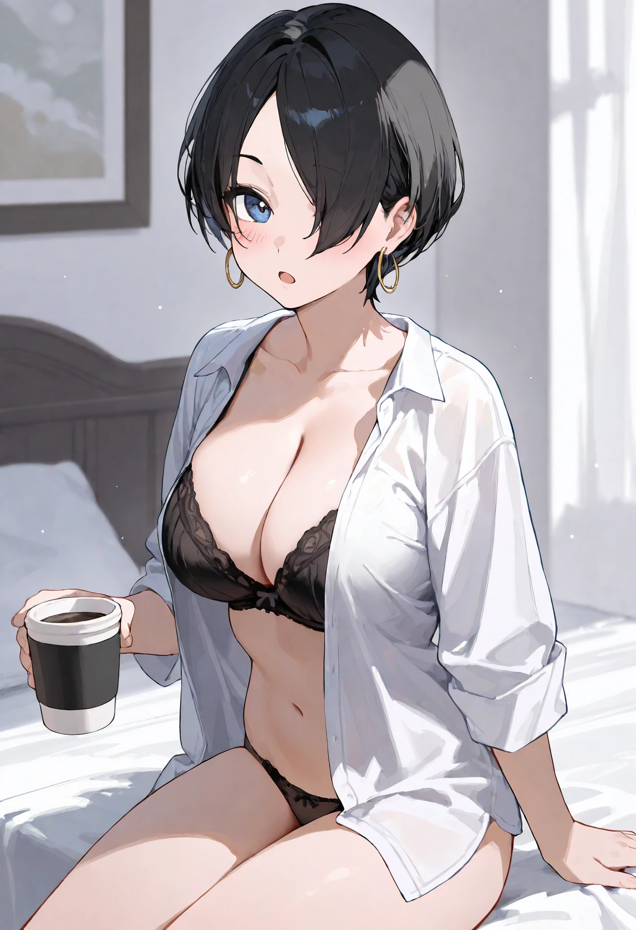okitsuyuka, hair over one eye, black hair, short hair, blue eyes, earrings, breasts,Clothes / 服 / 衣服: