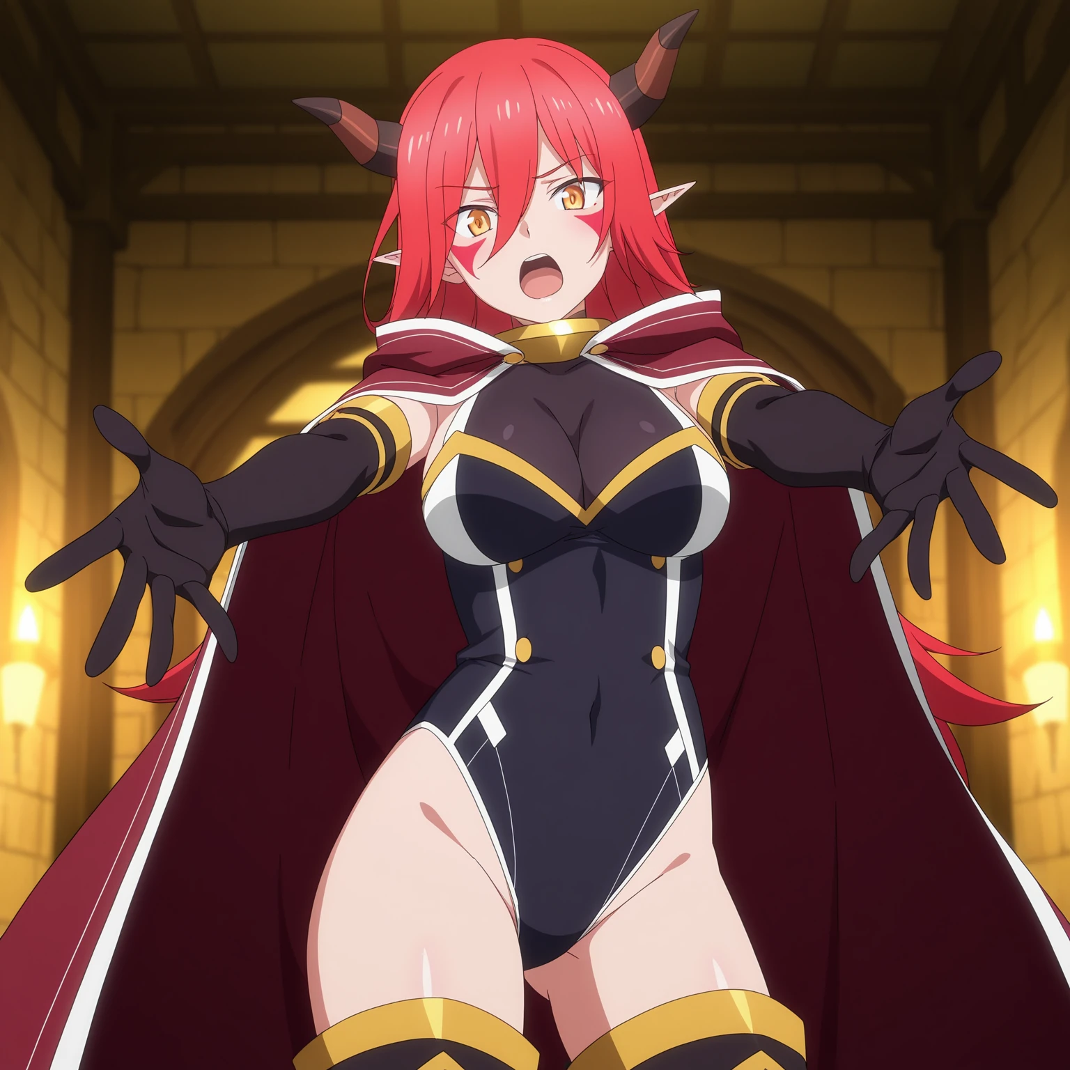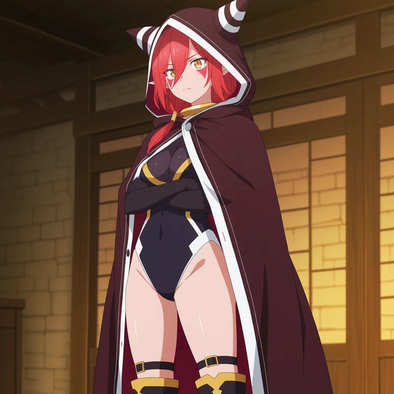 ArnesKonoSuba, red hair, hair between eyes, yellow eyes, facepaint, horns, demon girl, pointy ears, leotard, bare shoulders, metal collar, elbow gloves, over-kneehighs, knee boots, cloak, hooded cloak, hood down,
