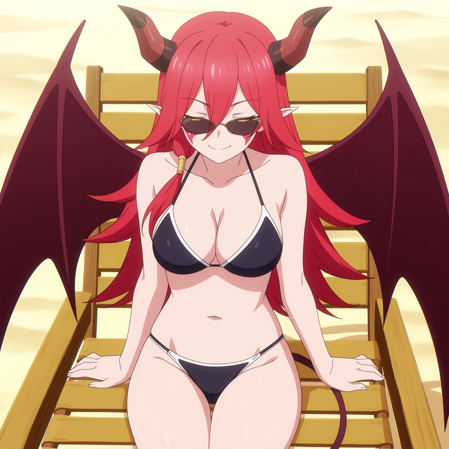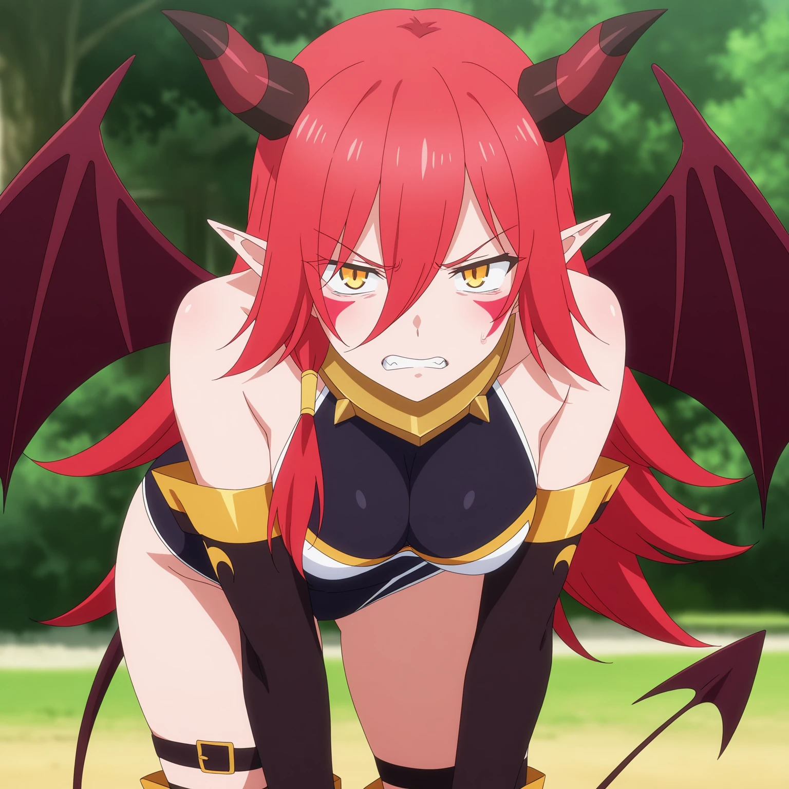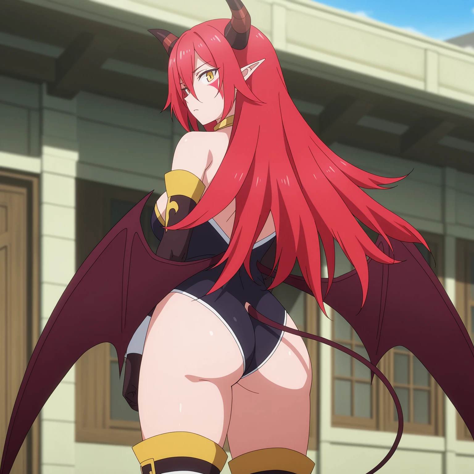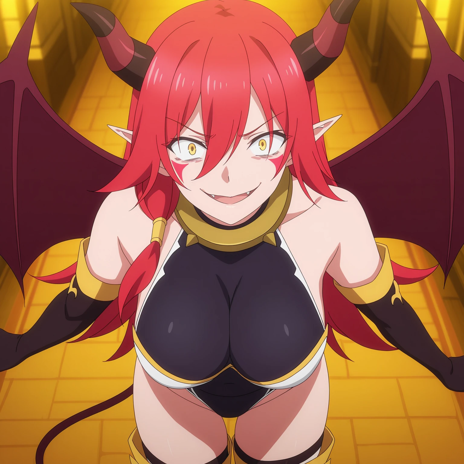 ArnesKonoSuba, red hair, long hair, hair between eyes, yellow eyes, facepaint, horns, demon girl, demon wings, demon tail, pointy ears, leotard, bare shoulders, metal collar, elbow gloves, over-kneehighs, knee boots,