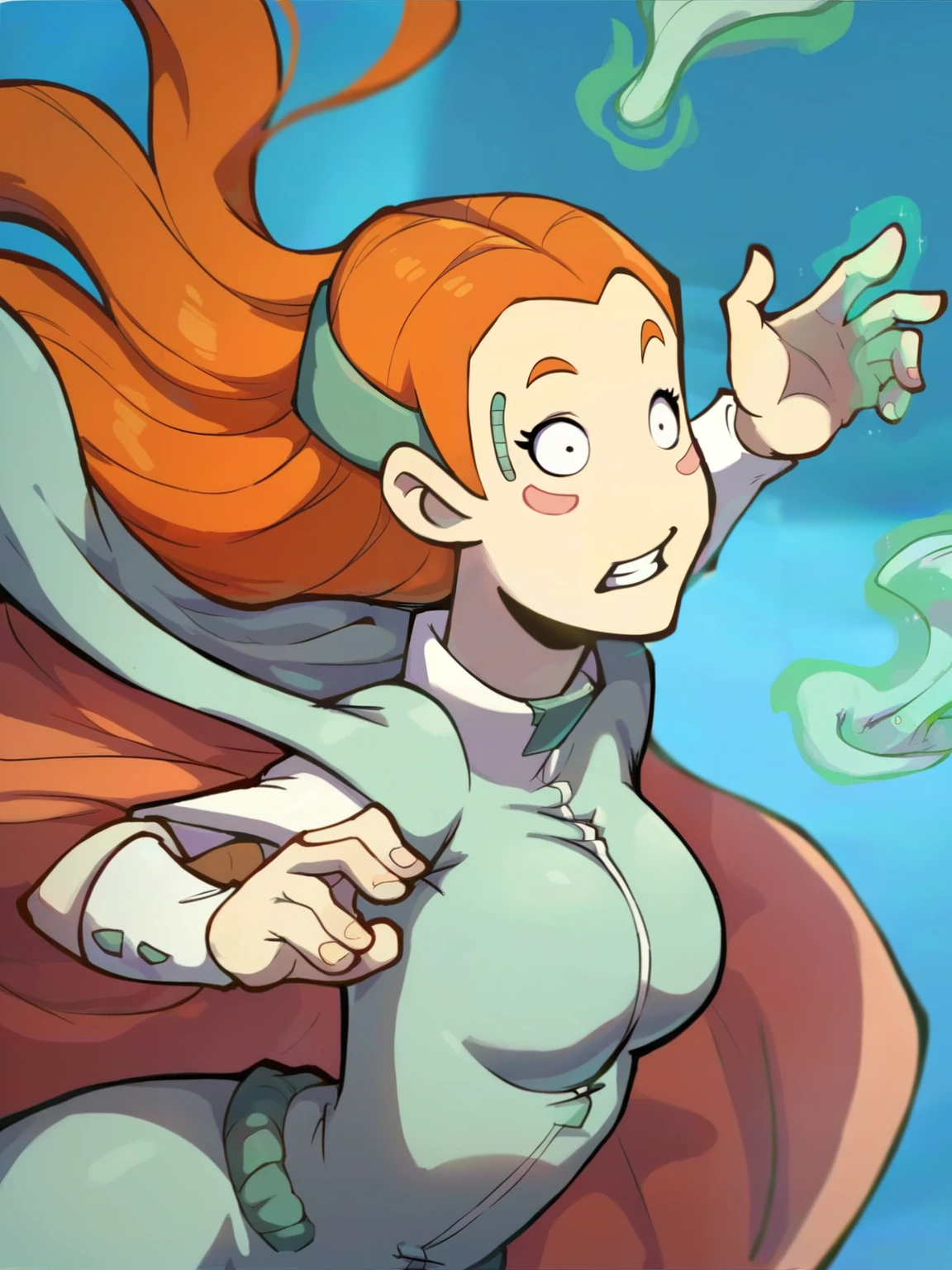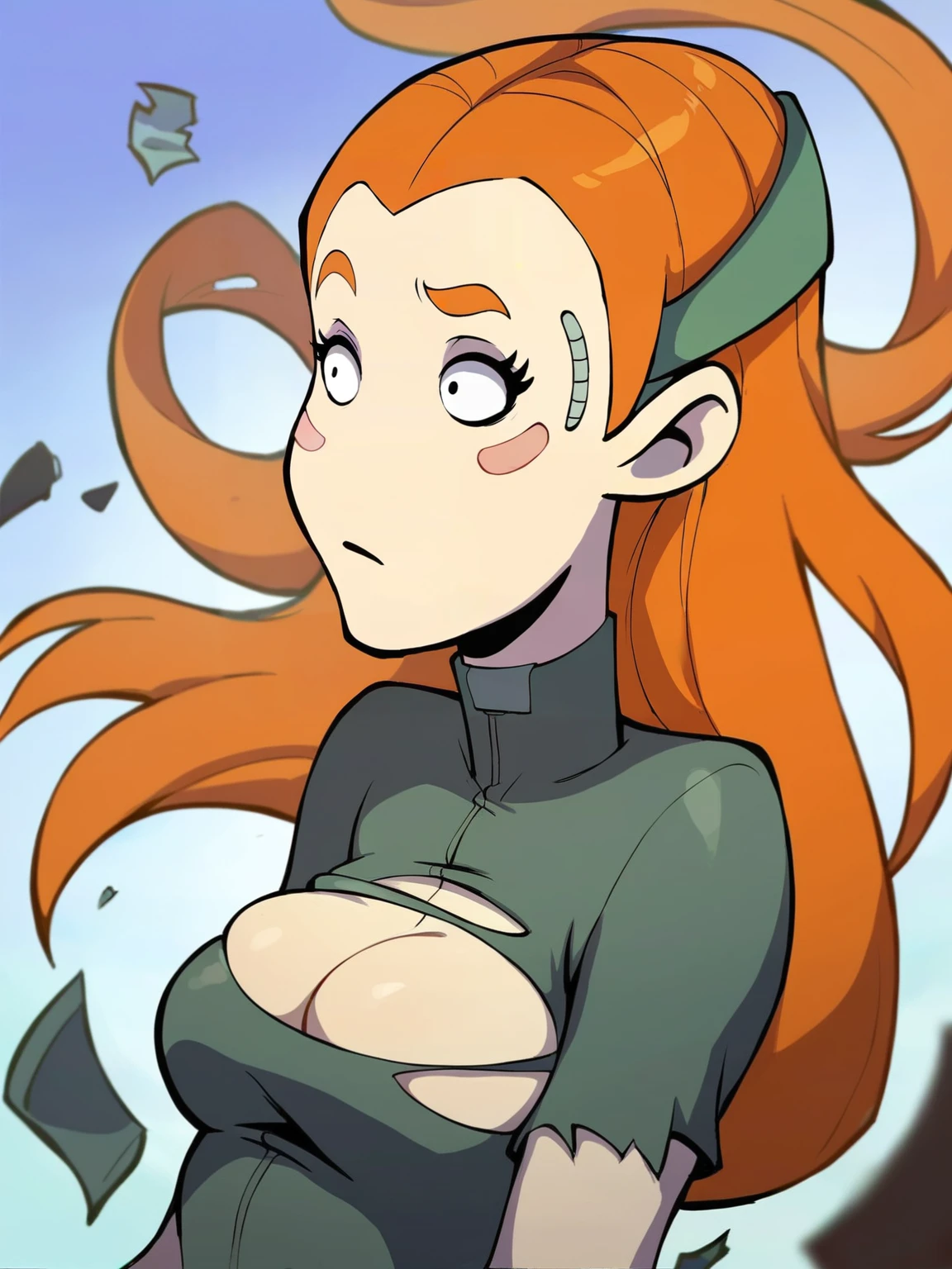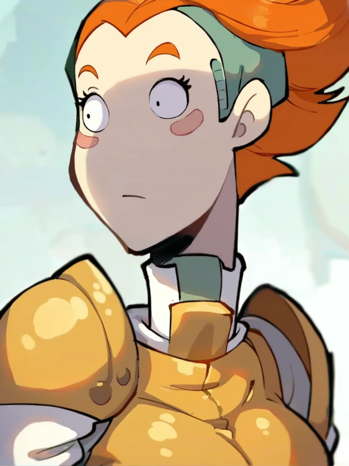 Recommend prompt: "g_al, 1girl, noseless, pale skin, straight waist-length bright orange hair, wide eyes, long eyelashes, pink blush patches on cheeks, green headband"