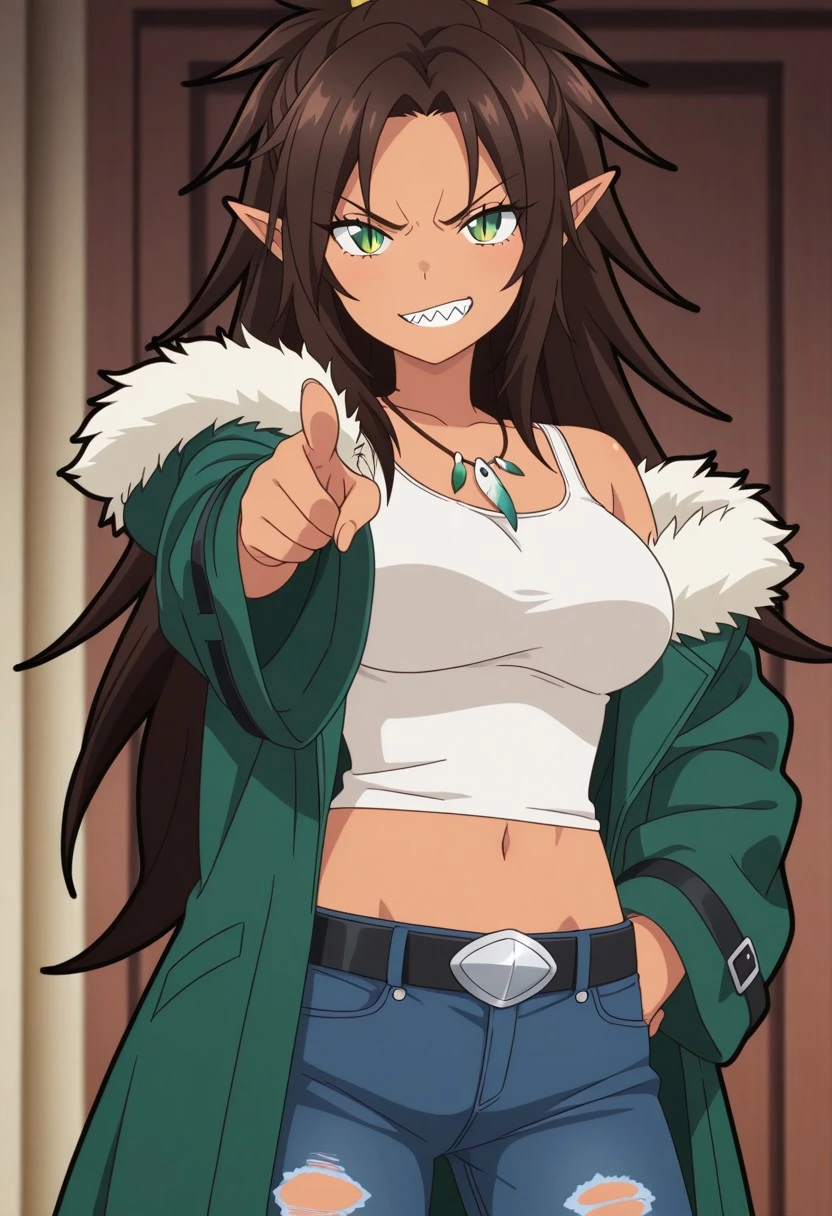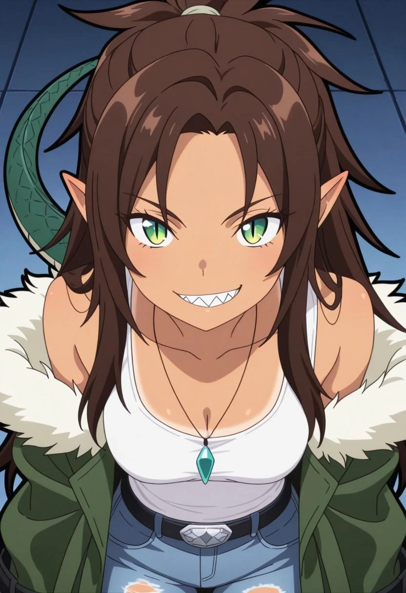 1girl, solo, green eyes, jewelry, pointy ears, long hair, breasts, looking at viewer, smile, necklace, light tan skin, black belt, silver belt buckle, worn blue jeans, green scales, torn jeans, very faded white tank top, exposed shoulder, green trench coat, (fur trim),