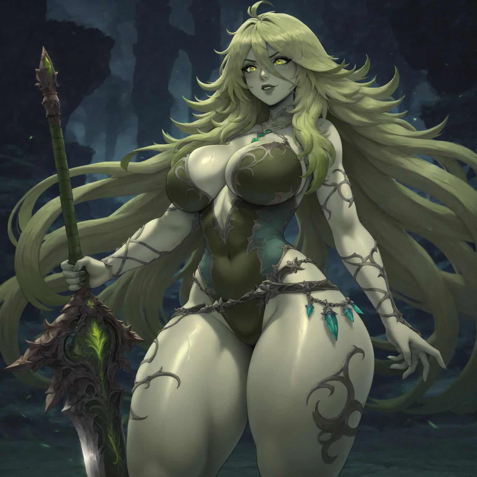 ffxivbarb, long hair, green skin, green hair, skimpy armor, sword