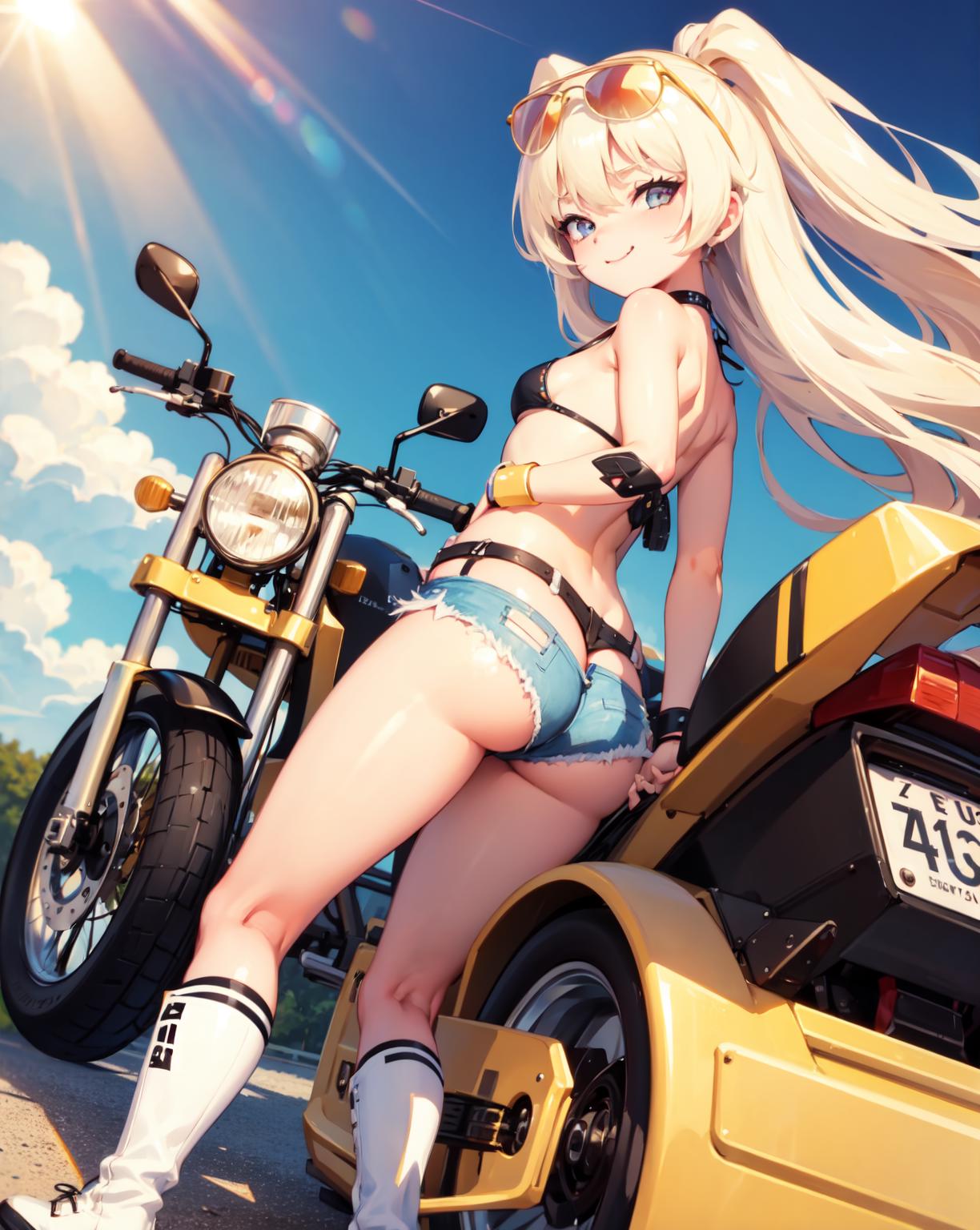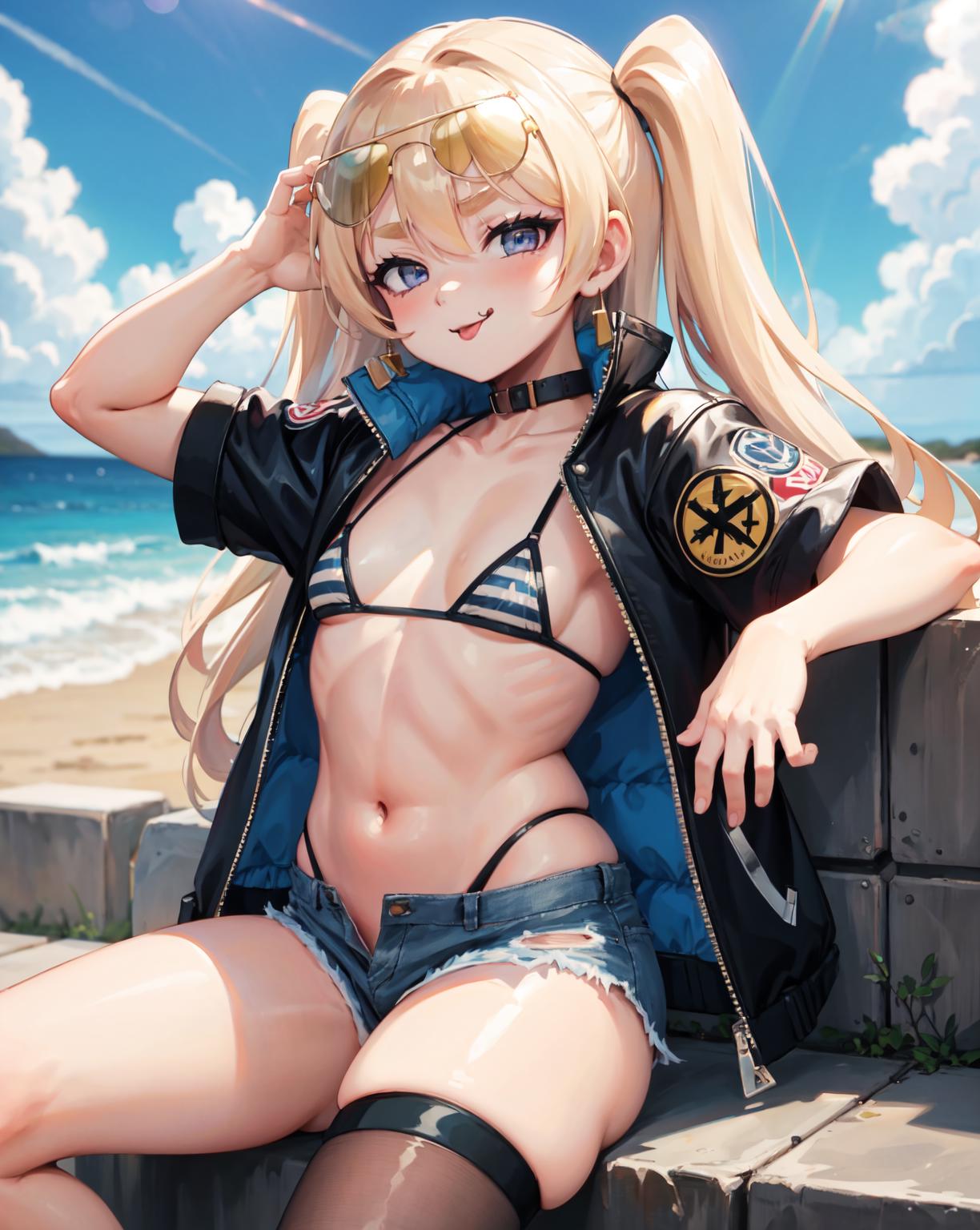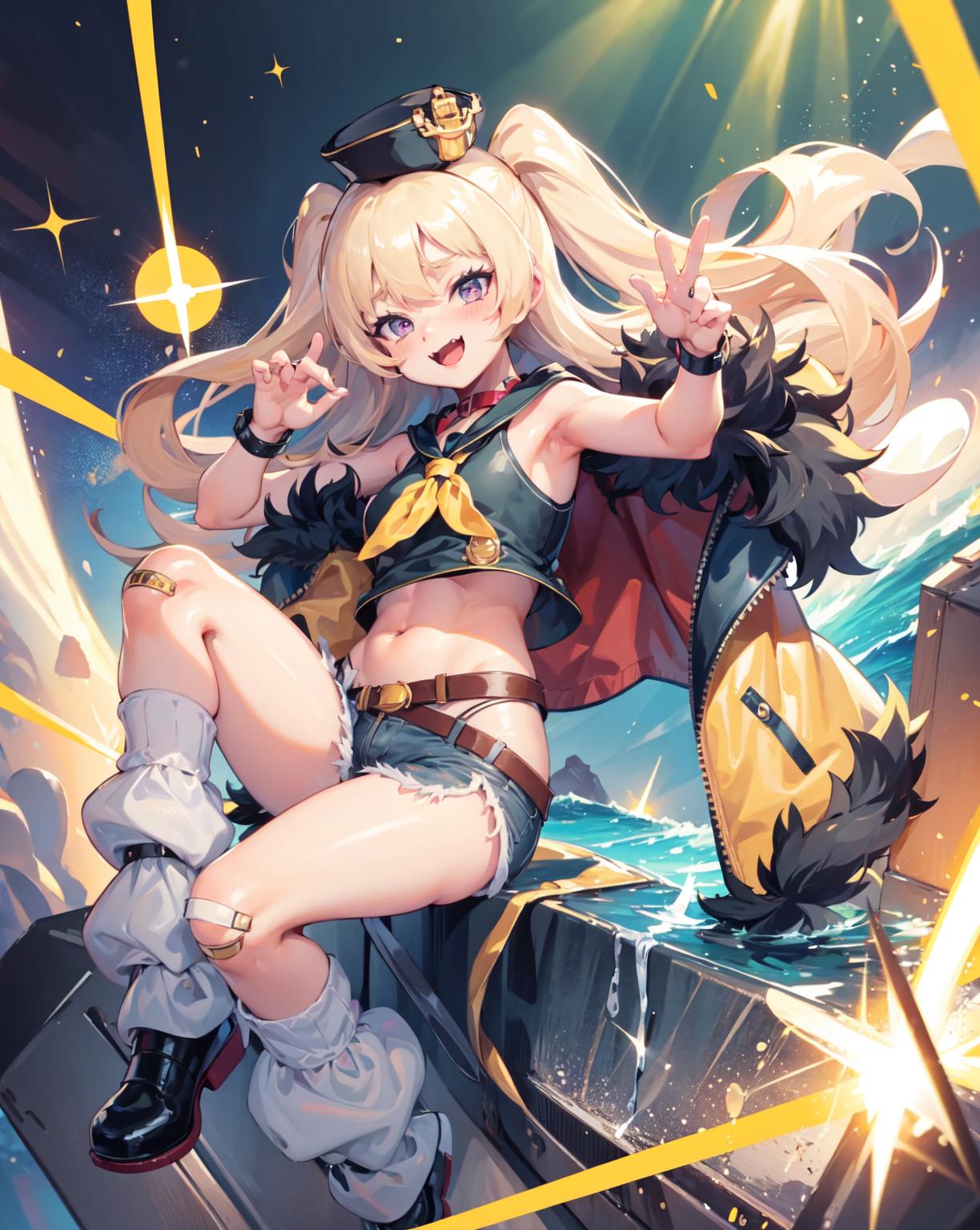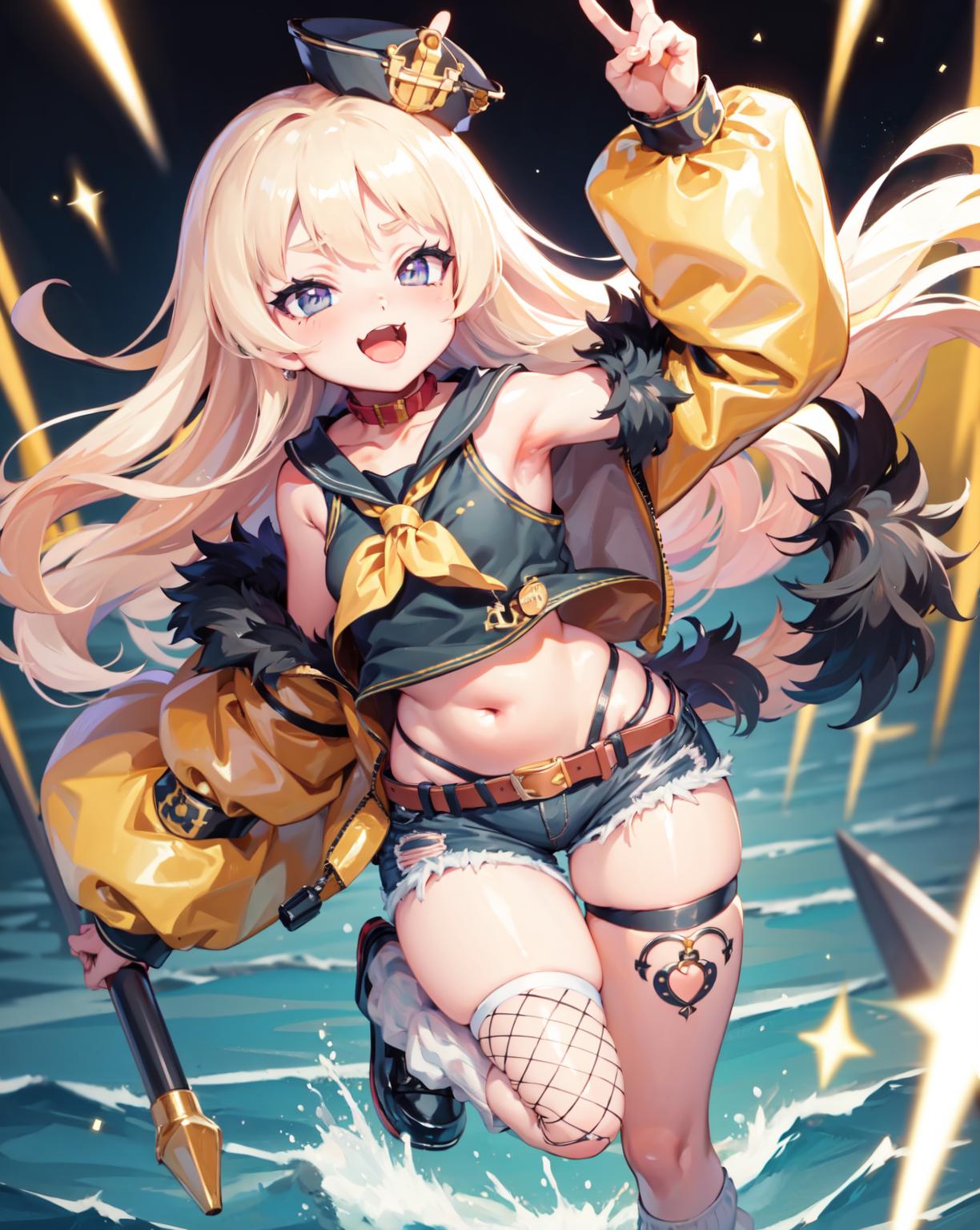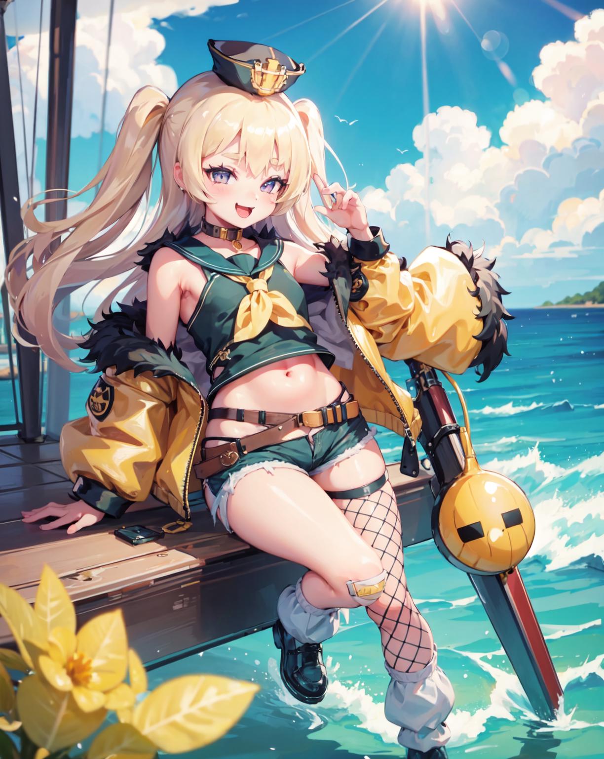 fur-trimmed jacket, yellow jacket,loose socks, sailor hat, bandaid on knee,(single thighhigh), fur trim,fishnet thighhigh