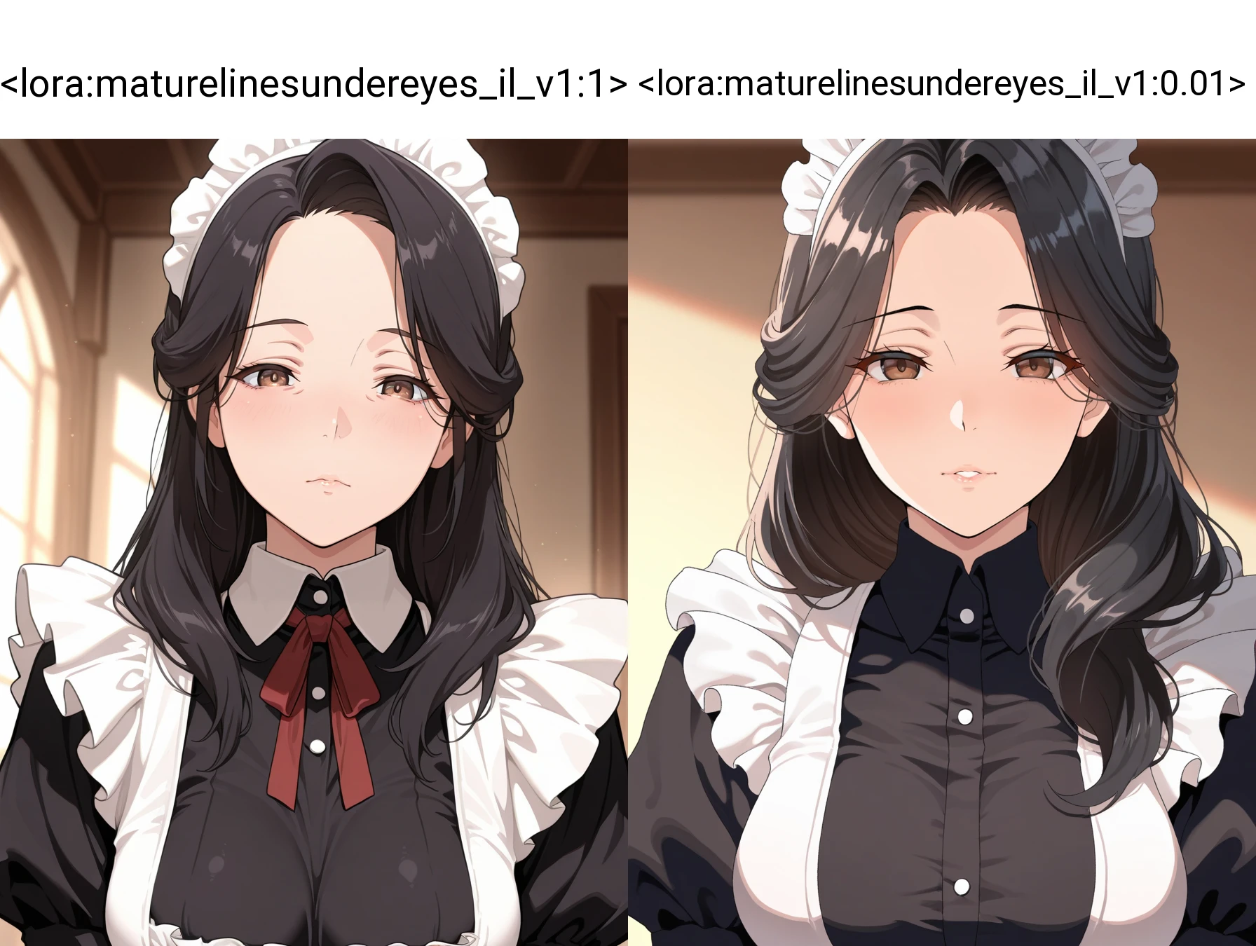 For standard image generation models, the “mature female” tag sometimes renders wrinkles under the eyes and sometimes does not, resulting in inconsistent output.