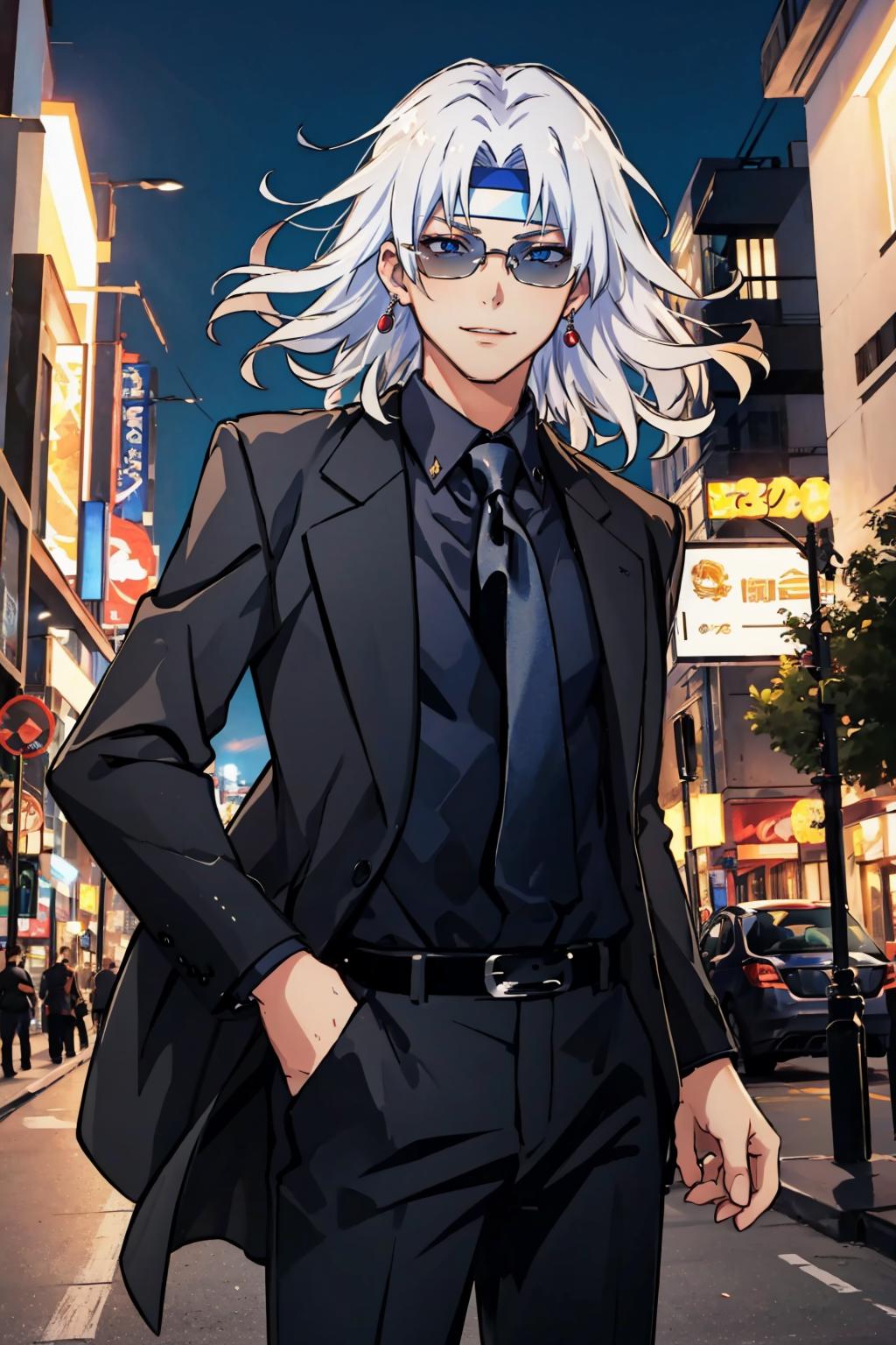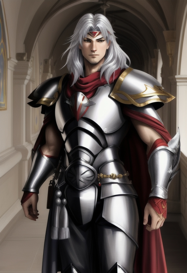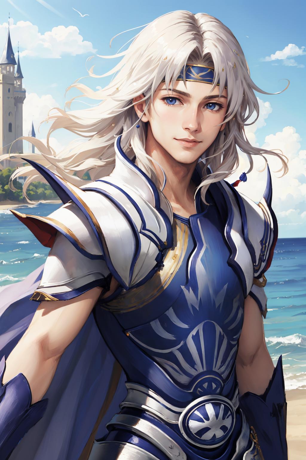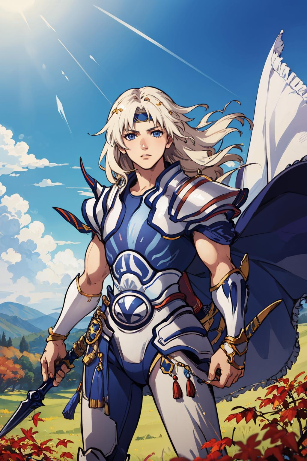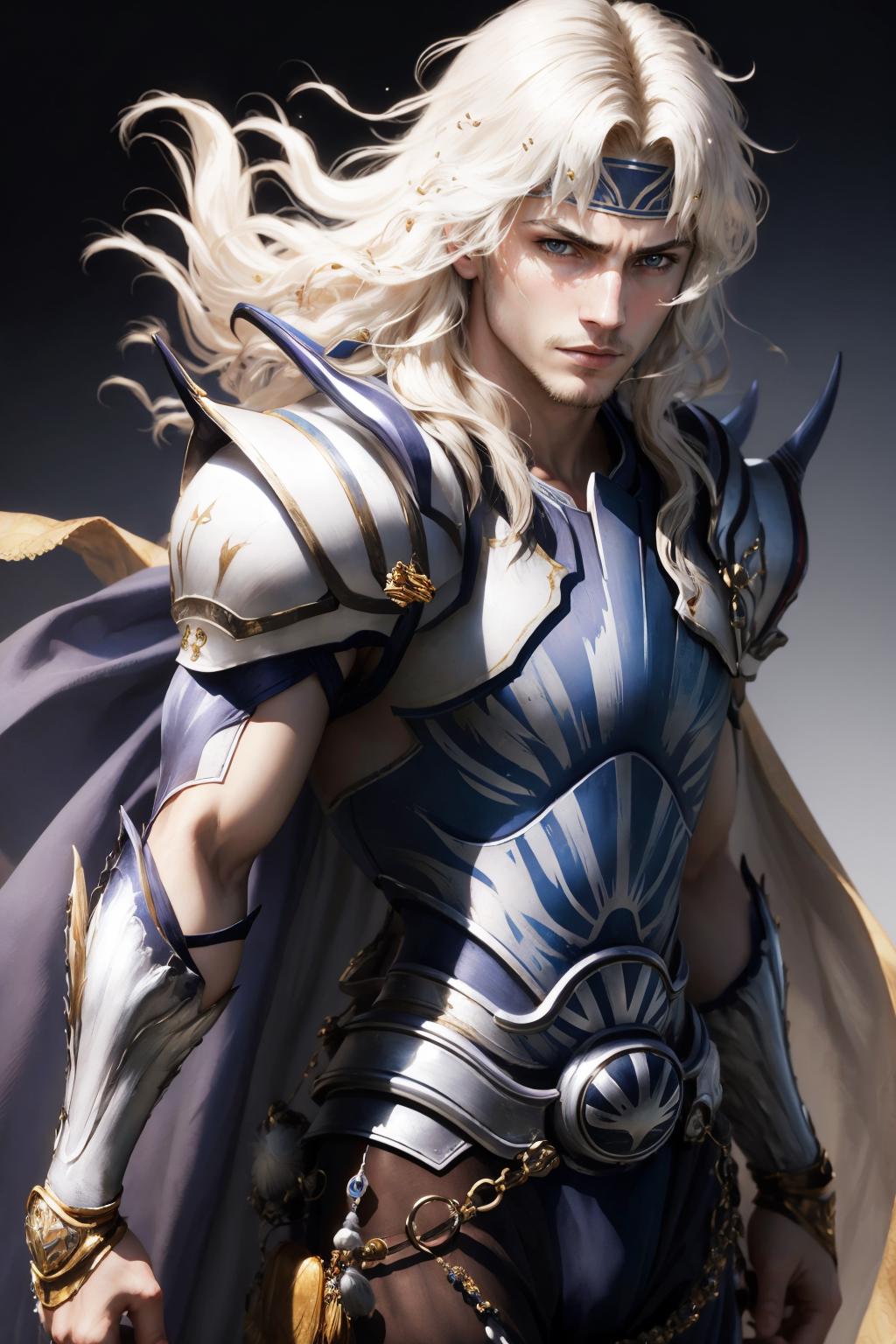 Add "headband, cape, white armor, gauntlets" for his typical look.