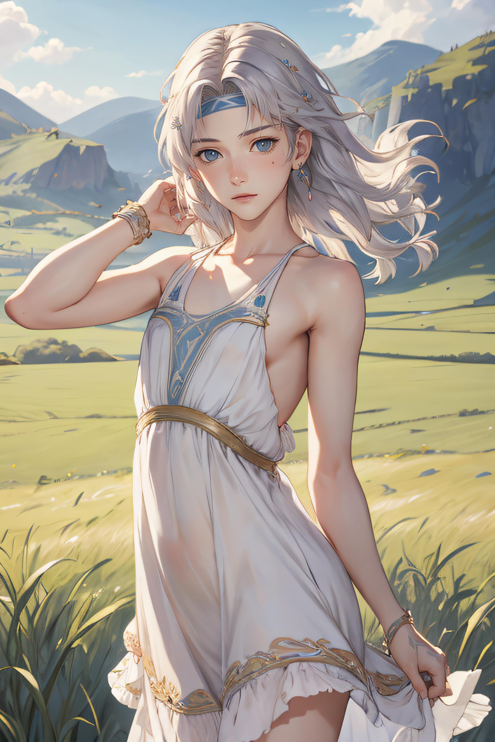 headband, cape, white armor, gauntlets