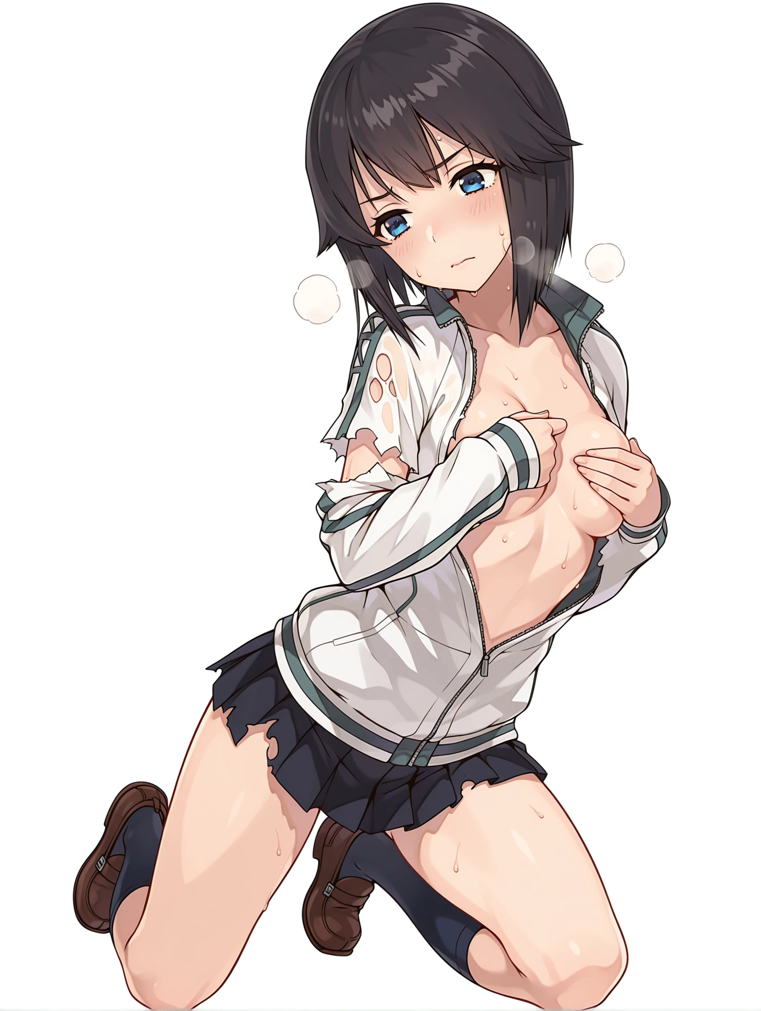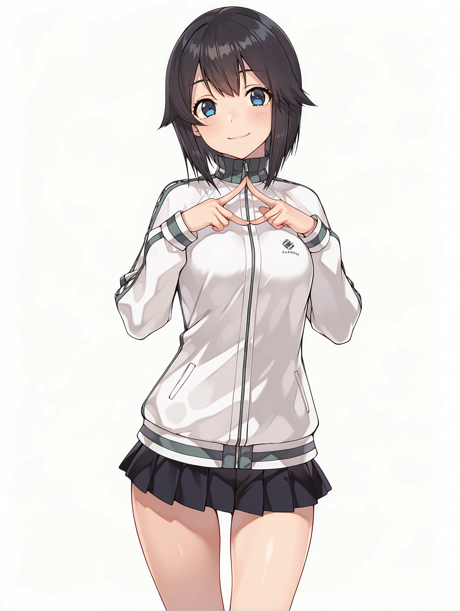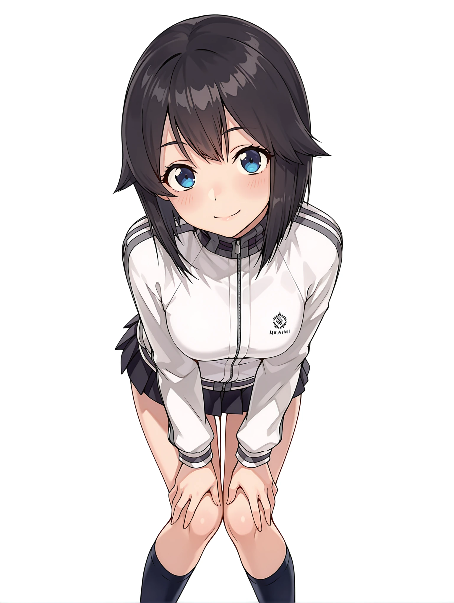 h_clothes,turtleneck,white track jacket,long sleeves,black mini skirt,kneehighs,loafers,