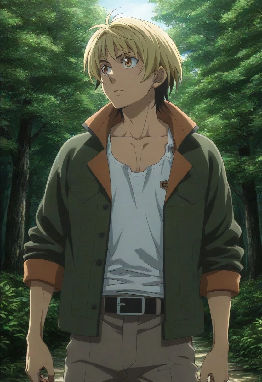 Takaki Uno, two-toned hair, orange eyes, white tank top, green jacket, rolled sleeves, belt, gray pants, knee pads