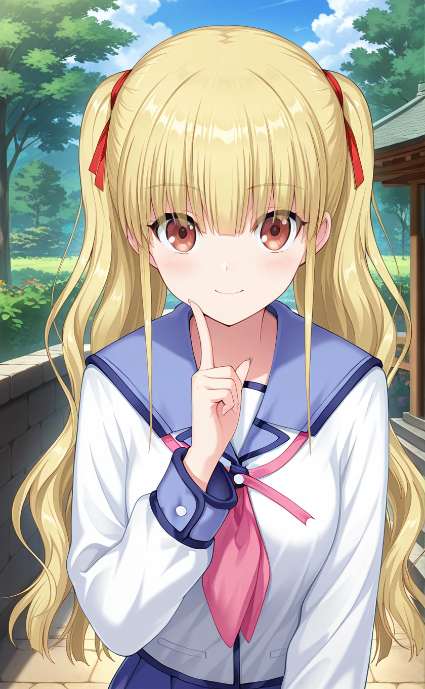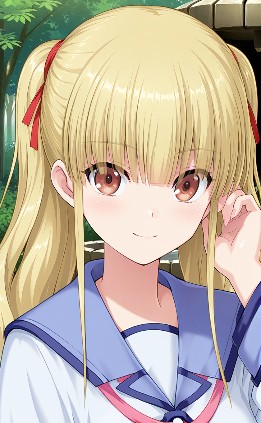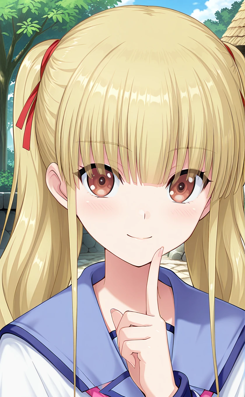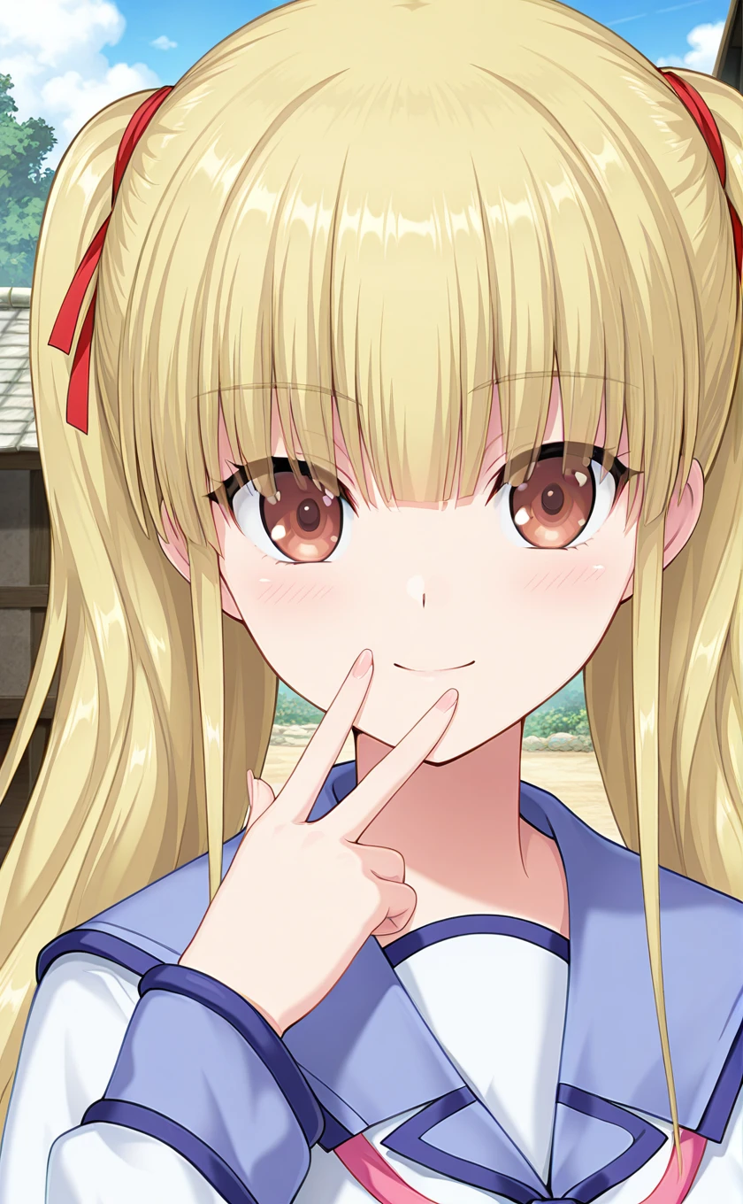long hair,blonde hair,twintails,hair ribbon,red ribbon,sidelocks,blunt bangs,brown eyes