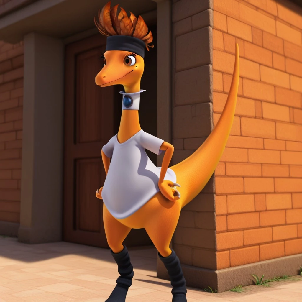 feral, female, Troodon, orange skin, brown eyes, mole under eye, eyelashes, brown feather-hair, white choker collar with blue jewel, 1girl