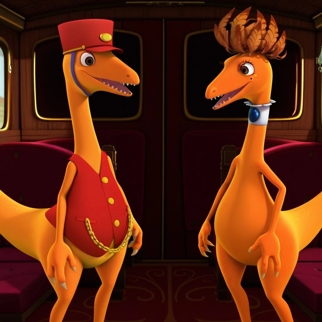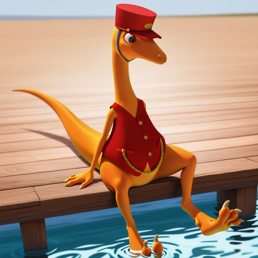 feral, male, Troodon, orange skin, brown eyes, red vest, gold buttons, gold chain, red hat with blue chinstrap, 1boy