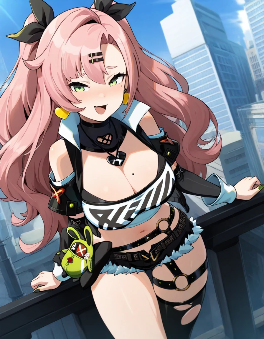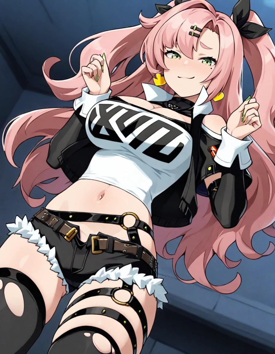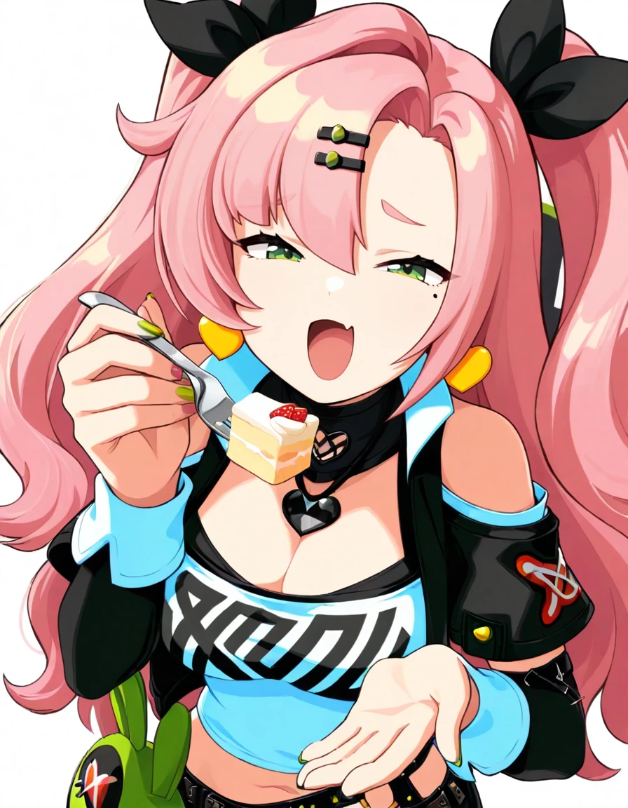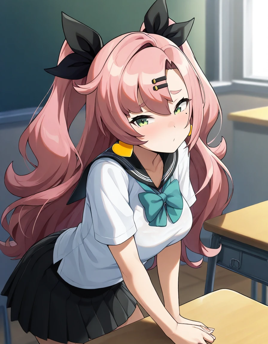 nicole demara, long hair, pink hair,ribbon, green eyes,mole,
