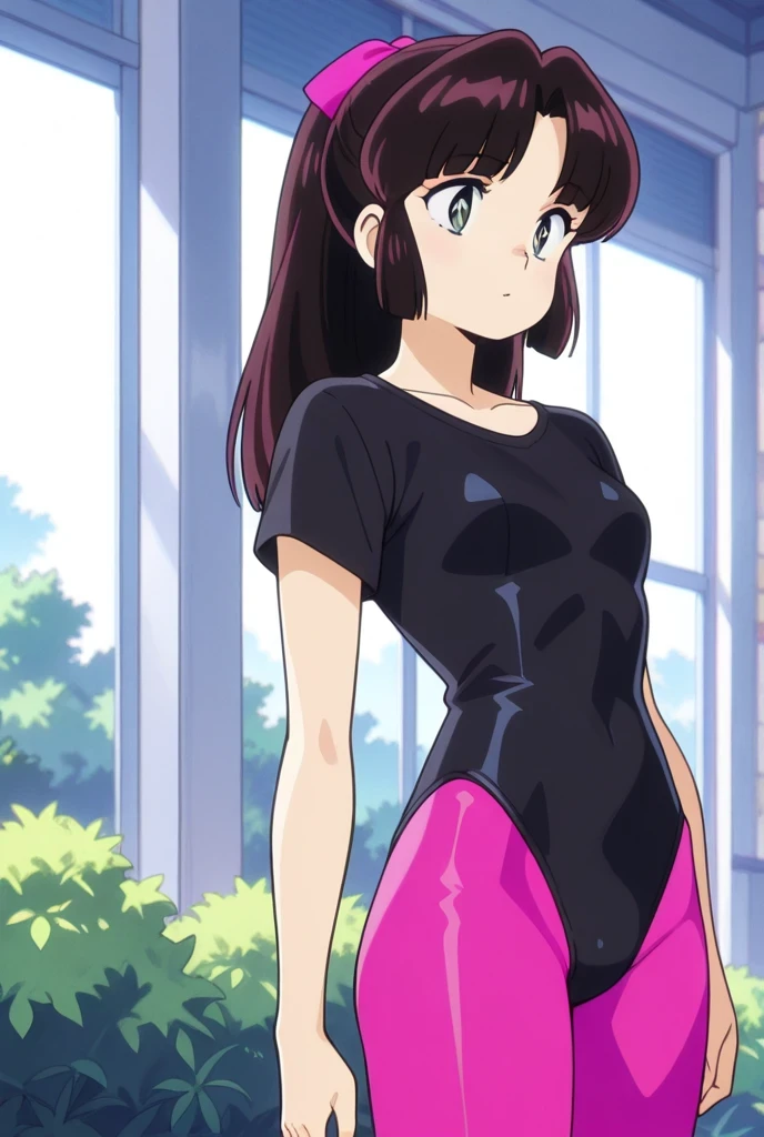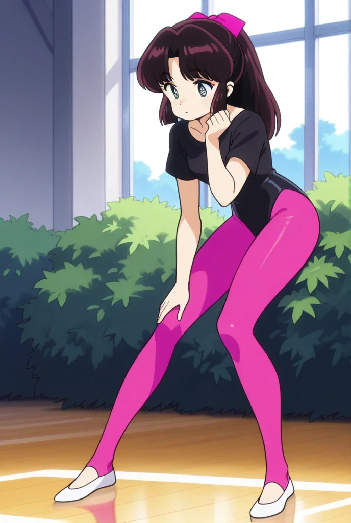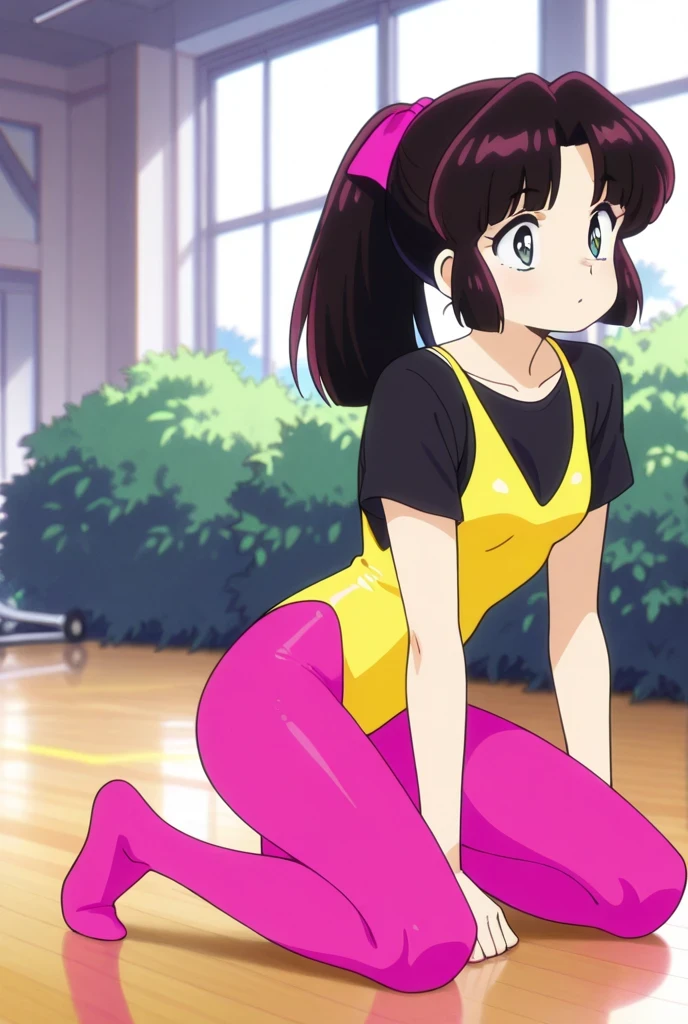 1) Areoleortad , aerobics, leotard,pink pantyhose,black shirt, yellow top