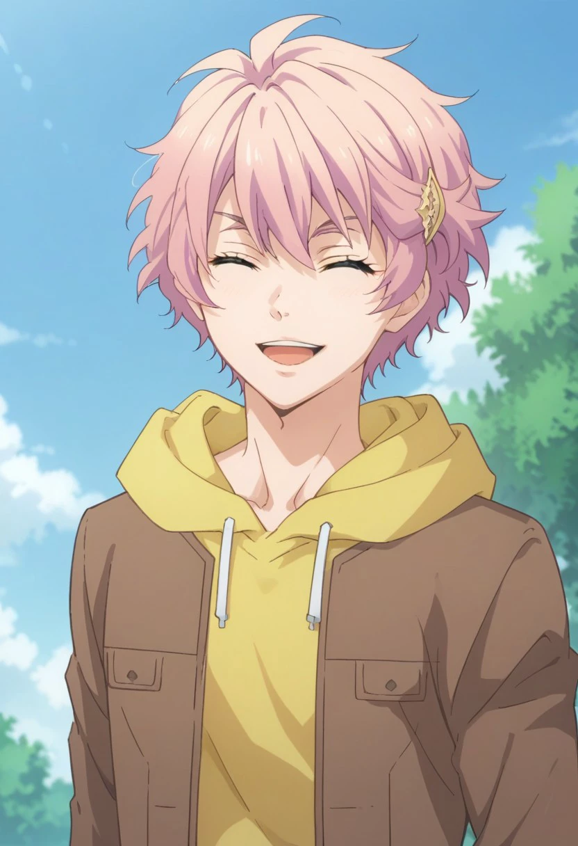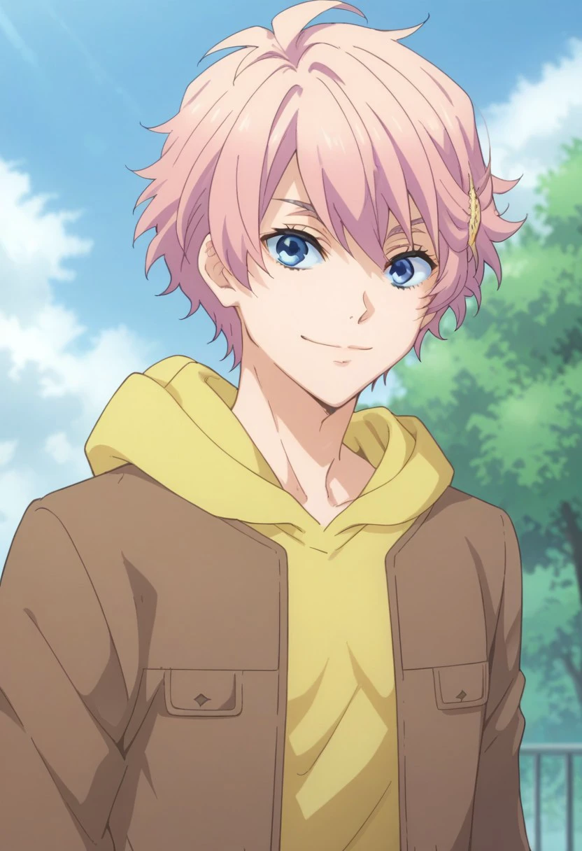akimitsu, 1boy, male focus, solo, pink hair, hair ornament, hairclip, blue eyes, jacket, brown jacket, open jacket, open clothes, hoodie, yellow hoodie, hood,