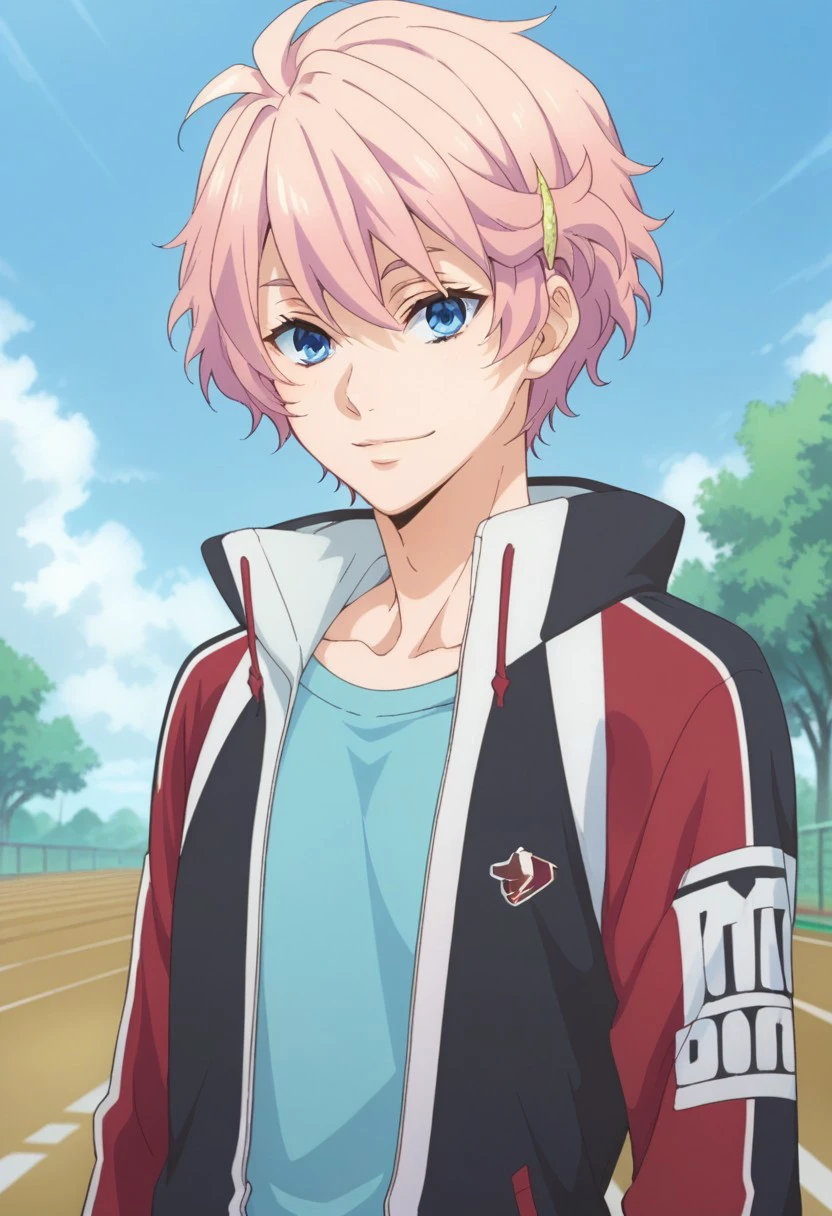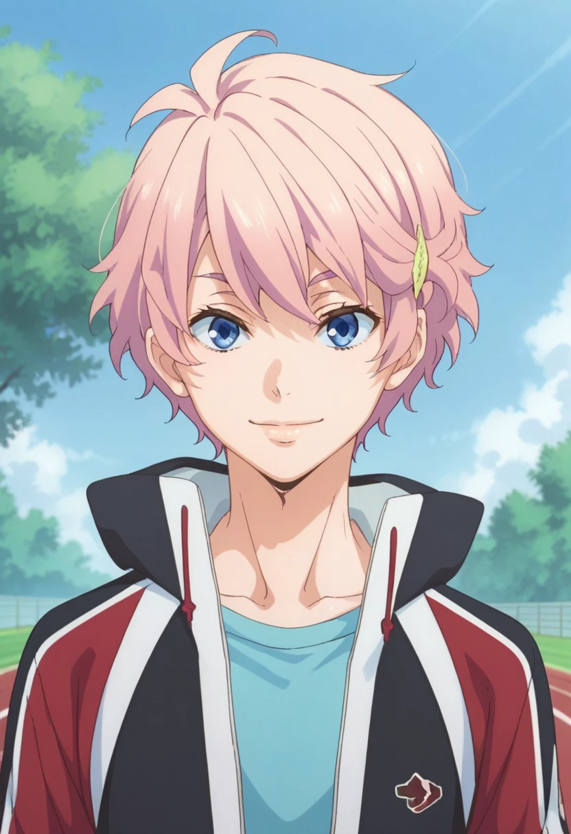 akimitsu, 1boy, male focus, solo, pink hair, hair ornament, hairclip, blue eyes, jacket, track jacket, blue shirt, track suit, pants, shoes, sneakers